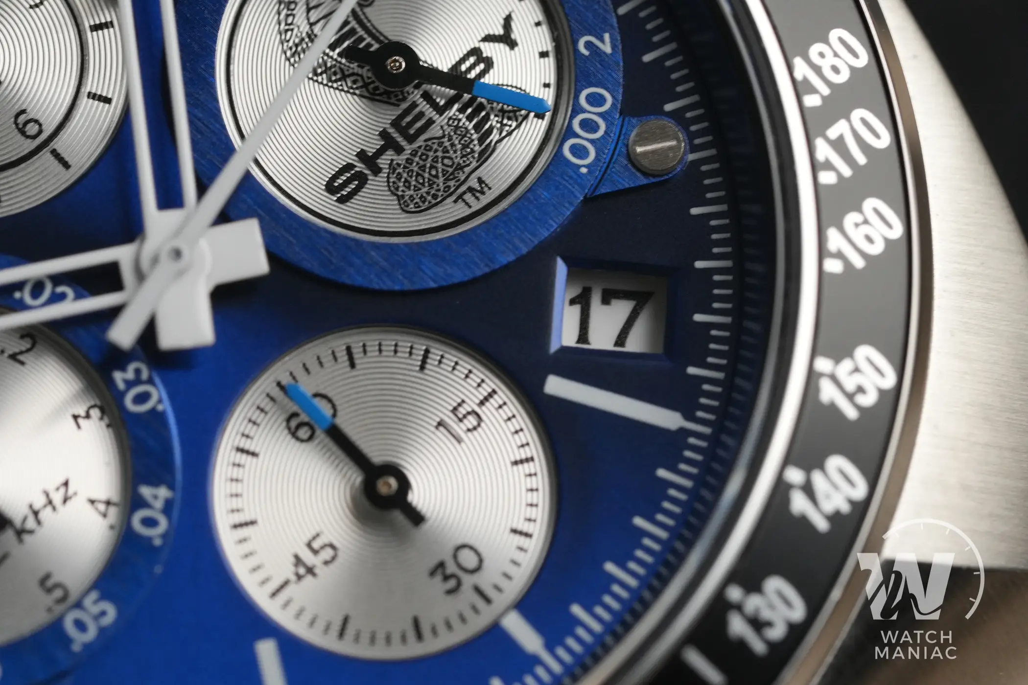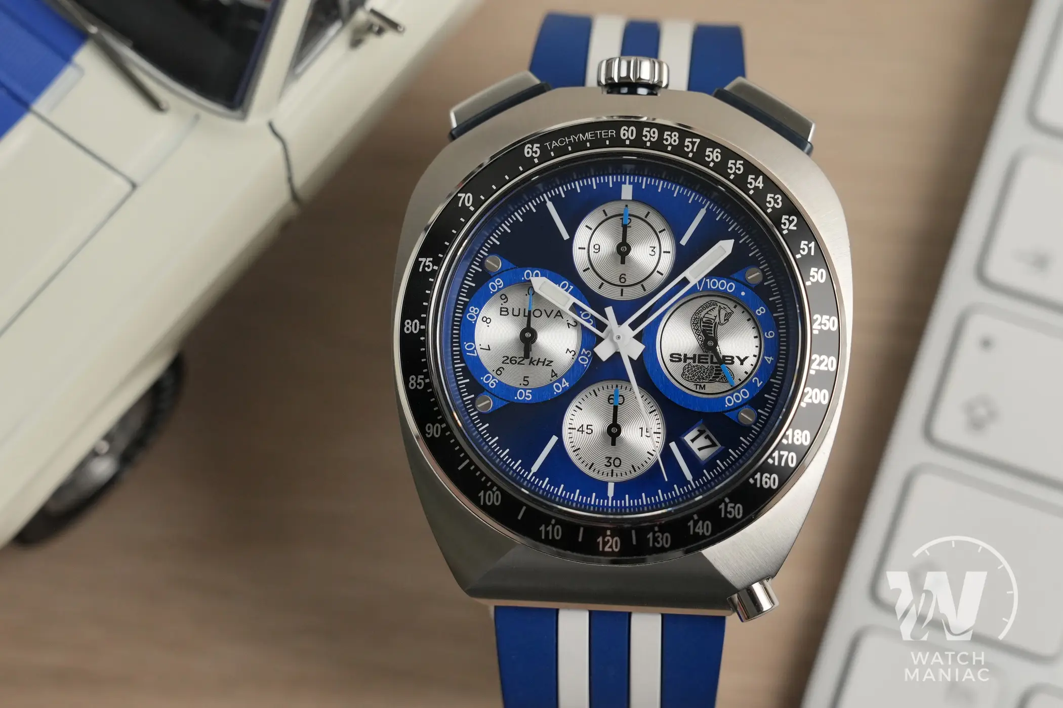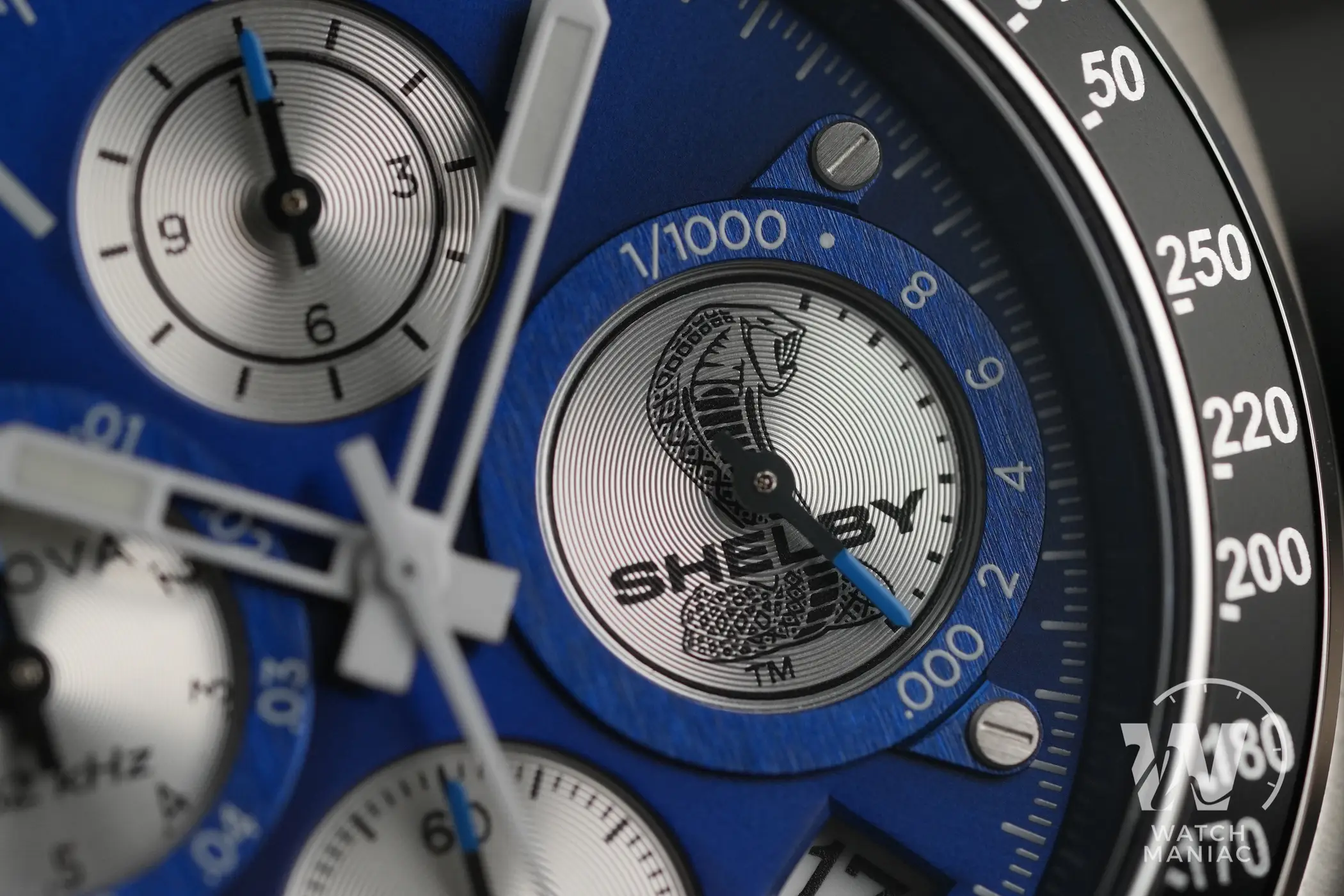 Questo Bulova ha un design di tipo bullhead, molto più elaborato rispetto agli altri modelli nella linea Racer. Il quadrante è in una bellissima tonalità di blu con finitura soleil. I vari loghi sono stati posizionati all’interno dei due contatori a ore 9 e a ore 3, dove troviamo l’iconico Cobra simbolo della Shelby.