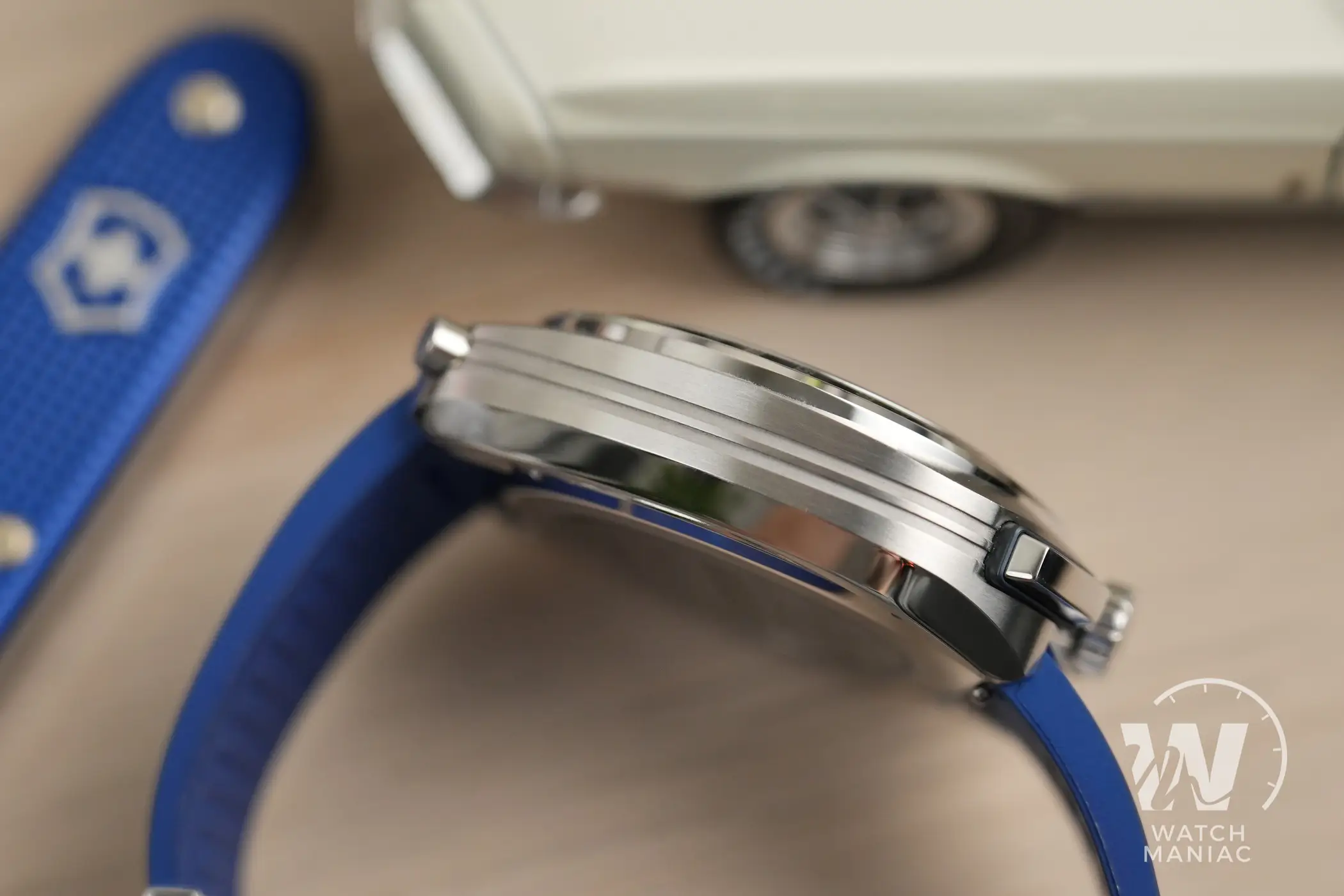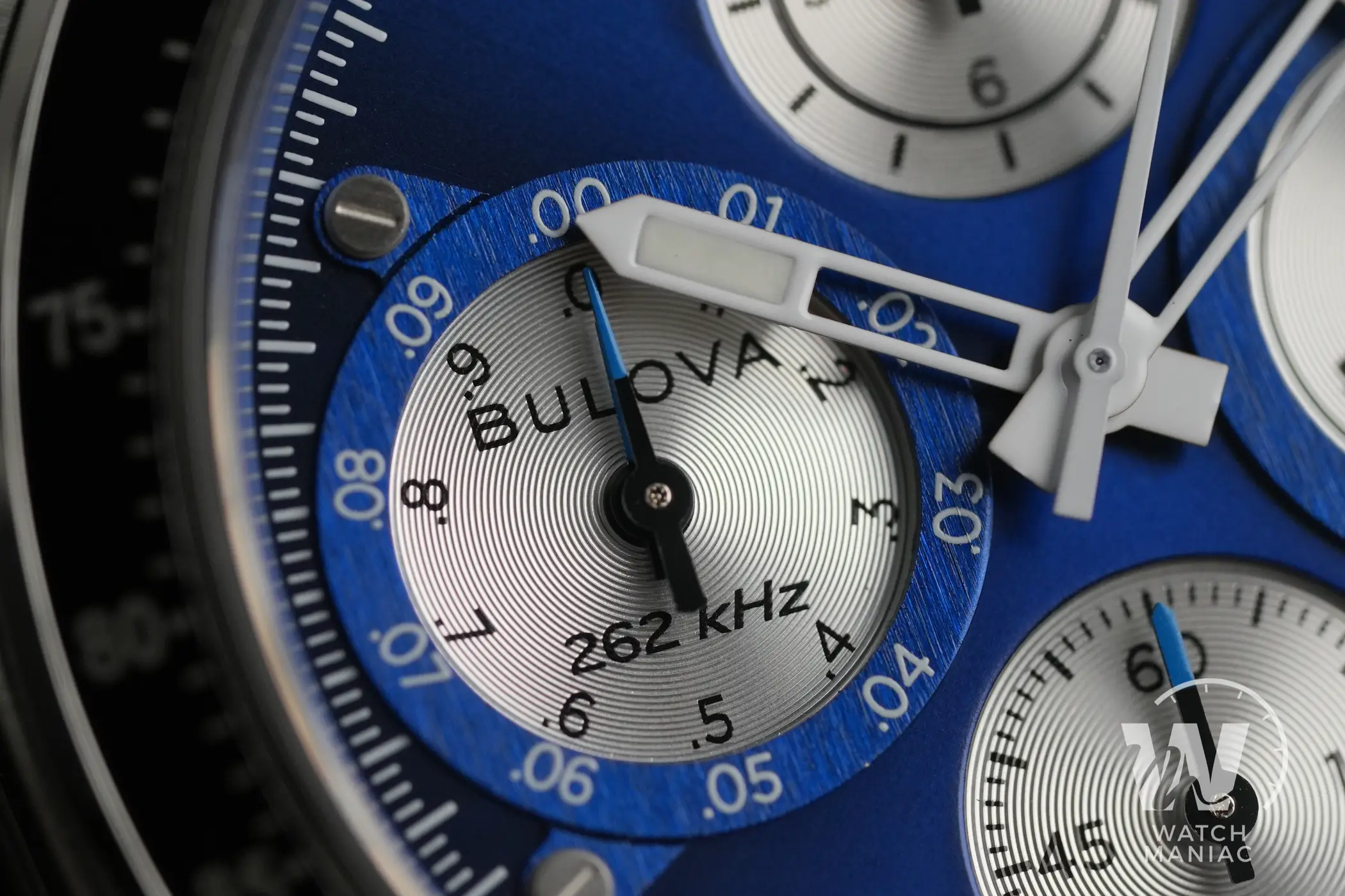 Sui fianchi ci sono due solchi che corrono da un’ansa all’altra e, oltre a movimentare il design, ricordano le scanalature tipiche sulle teste dei pistoni. La parte più bassa della carrure ha poi una lieve svasatura con finitura lucida che ha il compito di ridurre visivamente lo spessore complessivo dell’orologio e di migliorare la vestibilità al polso. A ore 12 c’è la corona a pressione, con finitura lucida e il diapason tipico di Bulova in rilievo. Ai lati ci sono i due pulsanti di forma rettangolare che rimangono protetti da delle cornici blu in tinta con il quadrante. In basso, in corrispondenza delle ore 5, c’è poi un piccolo tasto per attivare la funzione cronografica.