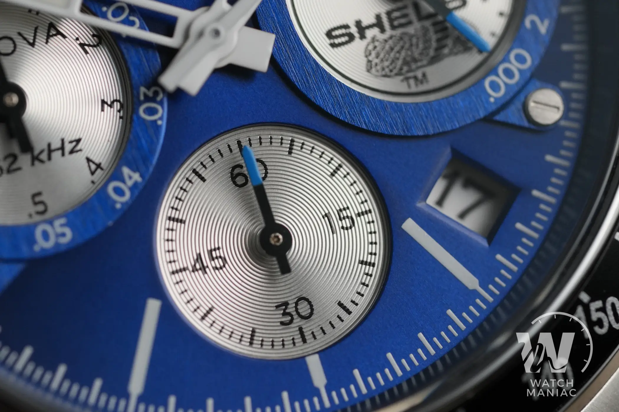 I 4 contatori in colorazione argentata chiara hanno una lavorazione a cerchi concentrici e i due principali sono circondati anche da una cornice blu con finitura spazzolata, con delle viti che ben si intonano al carattere dell’orologio.