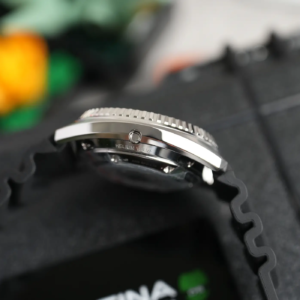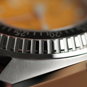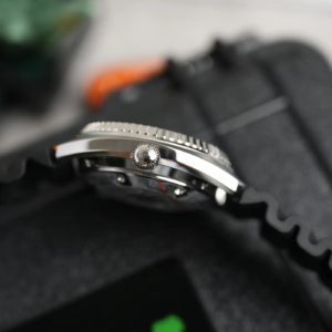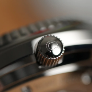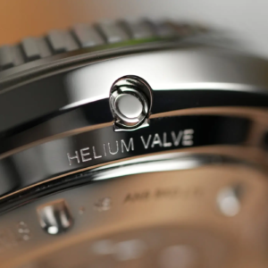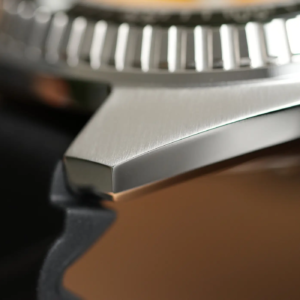Per il design della cassa il marchio svizzero è partito certamente da quello degli anni’70 ma l’ha ingentilito rendendolo più proporzionato e anche più attuale. Questo lo si nota soprattutto osservando il modo in cui la ghiera si raccorda alla carrure. Le anse sono corte e curvano dolcemente verso il basso, lo spessore è già di per sé piuttosto limitato per un diver impermeabile fino a 1000m di profondità, ma è anche camuffato sapientemente dall’inclinazione differente delle diverse superfici. Al centro del fianco sinistro è alloggiata la valvola automatica per il rilascio dell’elio. Molto bella la satinatura radiale sulla parte superiore delle anse, mentre tutte le altre parti della cassa sono lucide. La corona a ore 3 è protetta in parte dalla carrure. Ha il logo inciso al centro e naturalmente è a vite, con una filettatura molto precisa sia in apertura che in serraggio.