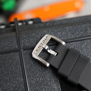 Il Certina DS Super PH1000 è stato presentato in due diverse configurazioni: con quadrante nero e cinturino in tessuto oppure in edizione limitata con quadrante giallo/arancione e doppio cinturino, in gomma e in nylon. Personalmente ho scelto proprio questa seconda versione. Al posto di un normale cofanetto, la controscatola in cartone racchiude una valigetta a tenuta stagna, una scelta in perfetto stile con l’orologio. All’interno del piccolo vano sul lato destro ci sono il libretto con le istruzioni per il corretto utilizzo e le informazioni relative all’assistenza accedere alla rete di assistenza, oltre alla card della garanzia. Sono inclusi anche un piccolo attrezzo per la rimozione del cinturino, un’estensione in gomma e delle sprintar a sgancio rapido da utilizzare con il NATO a corredo.