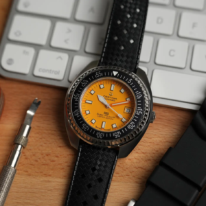 Il cinturino in gomma è esteticamente molto bello ed è realizzato in un materiale flessibile e gradevole al tatto. È molto simile a quello utilizzato da Hamilton sulla nuova generazione del Frogman e non mi sorprenderebbe affatto se fosse dello stesso fornitore. La fibbia ad ardiglione è in acciaio e riporta il marchio inciso.