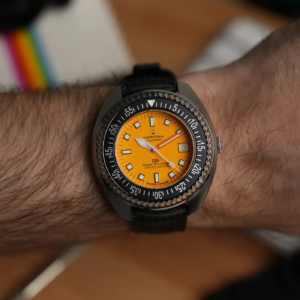 Il quadrante di questa edizione limitata è arancione, ma in una tonalità più chiara di quelle utilizzate solitamente per altri diver e replica in modo fedele la colorazione utilizzata anche sul modello vintage. Se sulla parte alta le scritte replicano abbastanza fedelmente quelle presenti sul PH1000 del passato, nella parte bassa c’è un’evidente differenza data dalla dicitura “Limited edition”, che sarebbe stato meglio riservare solo al fondello. A ore 3 è posizionata la data, altro dettaglio in continuità con la storia di questo modello.