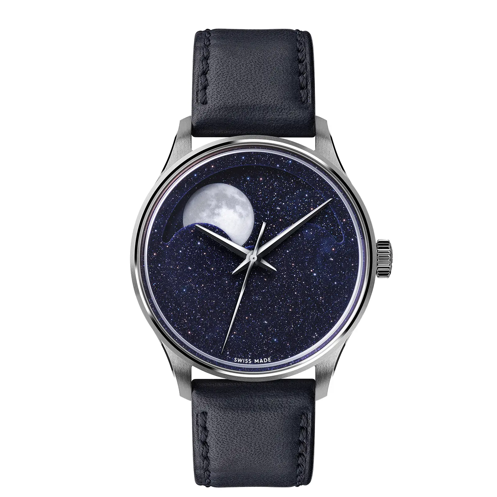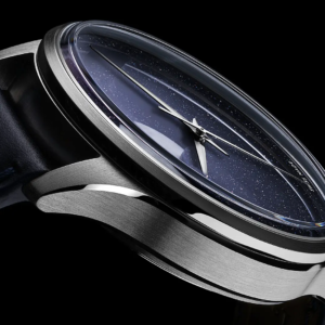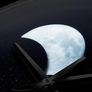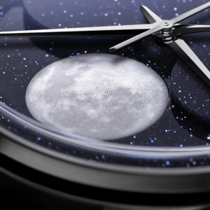 In questo progetto che anche un pizzico di Italia: il quadrante è realizzato in avventurina, un materiale inventato a Murano nel XVII secolo composto da un vetro al cui interno sono incluse delle scaglie di ossido di rame, responsabili del tipico luccichio. Inoltre, proprio per la distribuzione irregolare delle parti metalliche, ogni disco di avventurina può essere diverso dagli altri, quindi ogni singolo esemplare avrà un suo aspetto caratteristico. La luna, rispetto a quella vista nel C1 Moonglow, aumenta di dimensioni ed è stata adottata una Superluminova che al buio le dona una luminescenza biancastra ancora più vicina al colore reale del nostro satellite. Gli indici, semplici e stilizzati, sono invece privi di pasta luminescente.