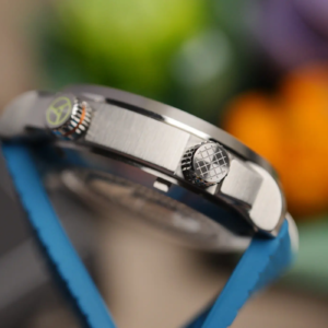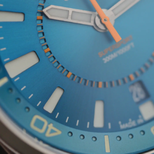 Al momento il SuperSport può essere scelto in 3 diverse colorazioni, Petrol, Black e Blue. La configurazione scelta per questa recensione è la terza, anche se in realtà in questo caso la tonalità è più che altro verde acqua, davvero bella vivace e risalta parecchio grazie alla finitura soleil. Nella parte alta c’è il marchio stampato, mentre in basso troviamo il nome del modello e il dato sull’impermeabilità fino a 300m. In piccolo a ore 6 non manca la dicitura Made In Germany, dato che questi sono orologi effettivamente assemblati in Germania.
