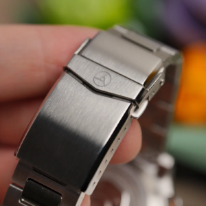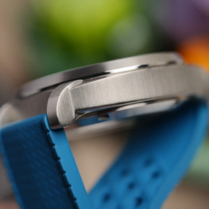 La cassa ha una forma molto particolare, in parte riconducibile al design a cuscino di Panerai ma completamente rivista. Nell’insieme dimostra un buon livello di originalità, soprattutto a livello delle anse, senza rischiare di diventare esageratamente elaborata. La finitura satinata è molto ben realizzata, trasversale sui fianchi e longitudinale sulla parte superiore. Anche la lunetta intorno al vetro è spazzolata e c’è un piccolo anello lucido che la separa dalla carrure. Dalla vista laterale si può apprezzare uno spessore molto contenuto per un orologio impermeabile fino a 300m.