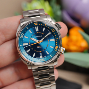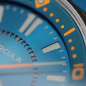 Sul lato destro ci sono le due corone e solo quella a ore 4 è a vite con una filettatura molto precisa senza impuntamenti né in apertura né in serraggio. C’è un anello in alluminio anodizzato arancione e il logo di Circula è inciso e riempito di Superluminova. La corona a ore 2 riprende una decorazione a reticolo piuttosto comune sui diver anni ‘60 e ‘70, ma non è a vite e in questo modo replica la scelta tecnica fatta da Christopher Ward sul C65 Supercompressor. Tra l’altro, all’interno della scatola di Circula, c’è un avviso in cui si ricorda di non azionare la corona mentre si è in acqua, probabilmente perché la rotazione potrebbe alterare l’efficacia della guarnizione.