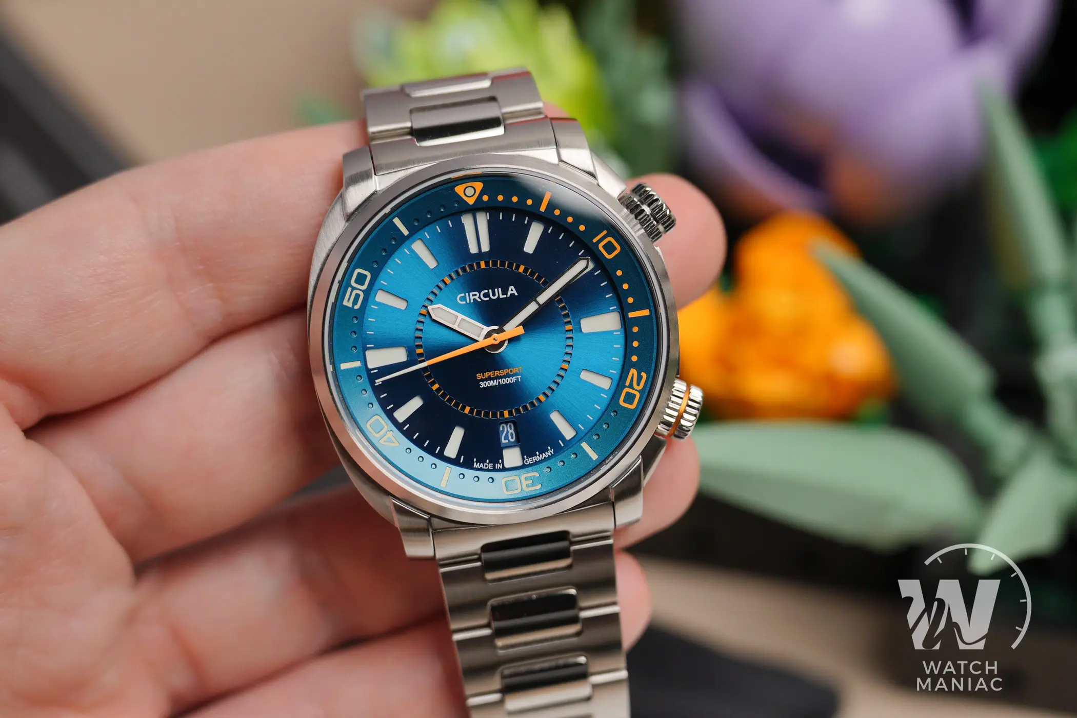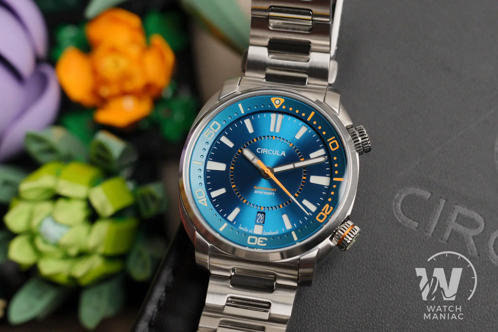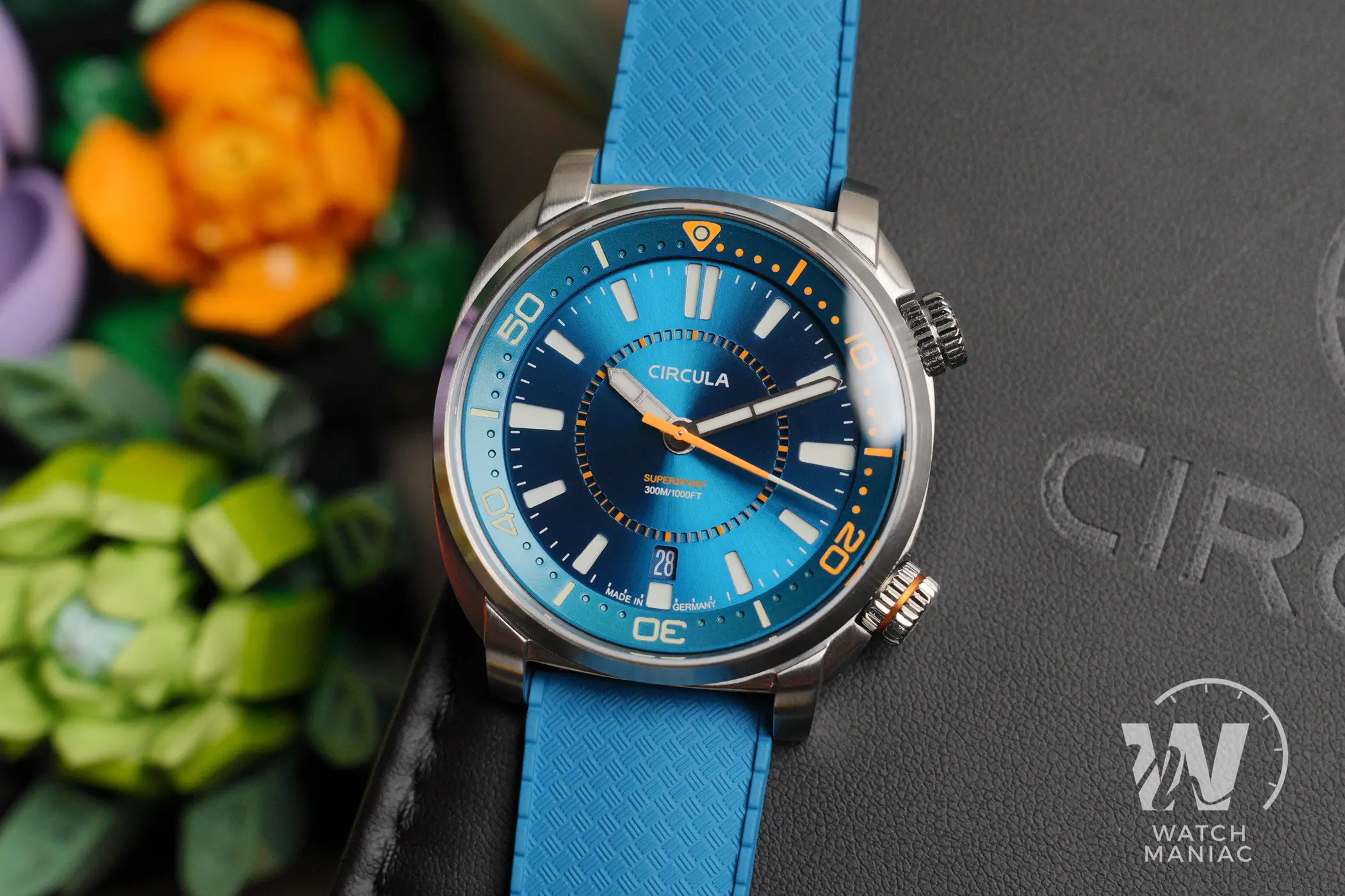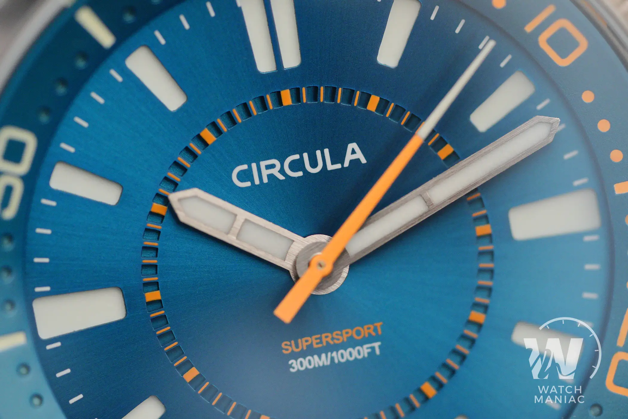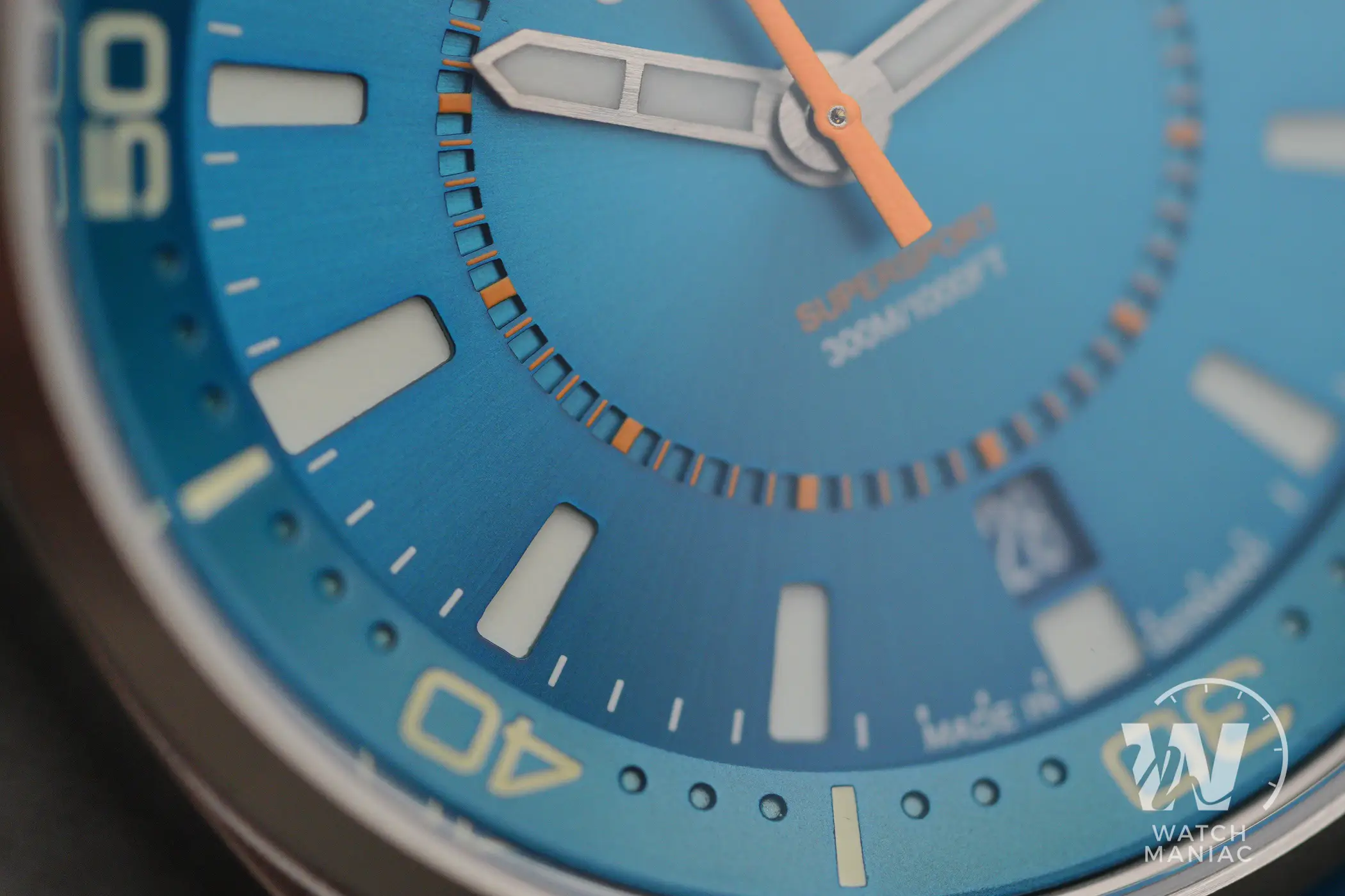 Al momento il SuperSport può essere scelto in 3 diverse colorazioni, Petrol, Black e Blue. La configurazione scelta per questa recensione è la terza, anche se in realtà in questo caso la tonalità è più che altro verde acqua, davvero bella vivace e risalta parecchio grazie alla finitura soleil. Nella parte alta c’è il marchio stampato, mentre in basso troviamo il nome del modello e il dato sull’impermeabilità fino a 300m. In piccolo a ore 6 non manca la dicitura Made In Germany, dato che questi sono orologi effettivamente assemblati in Germania.