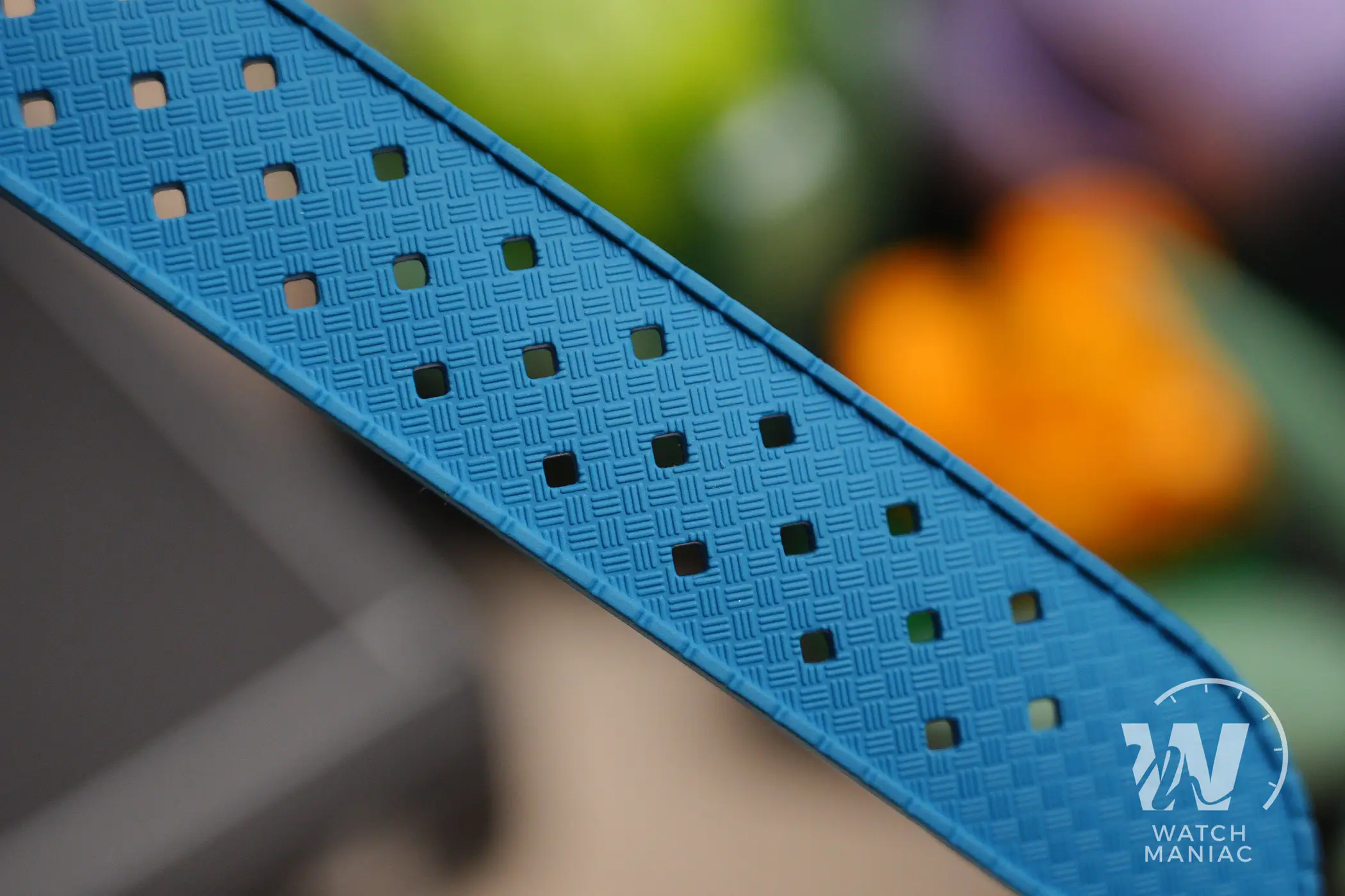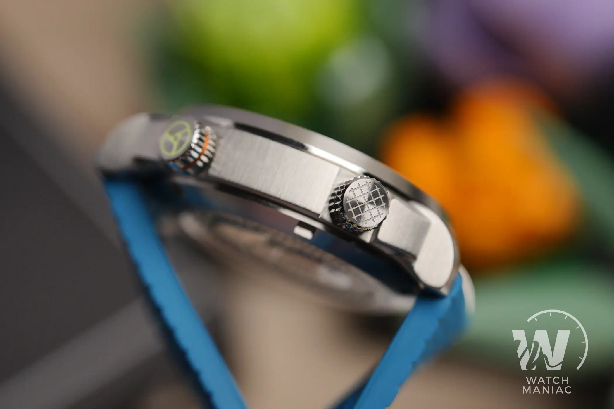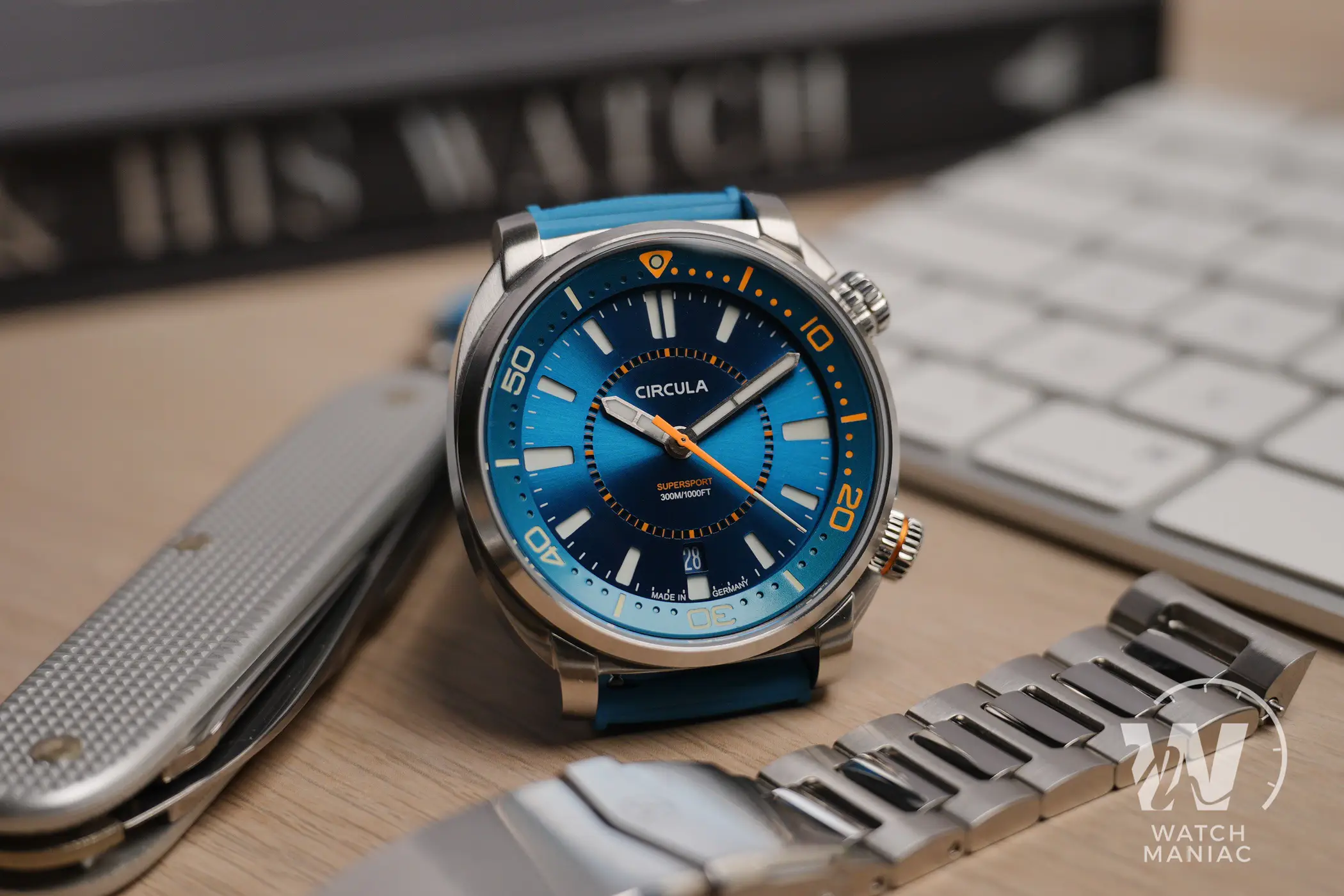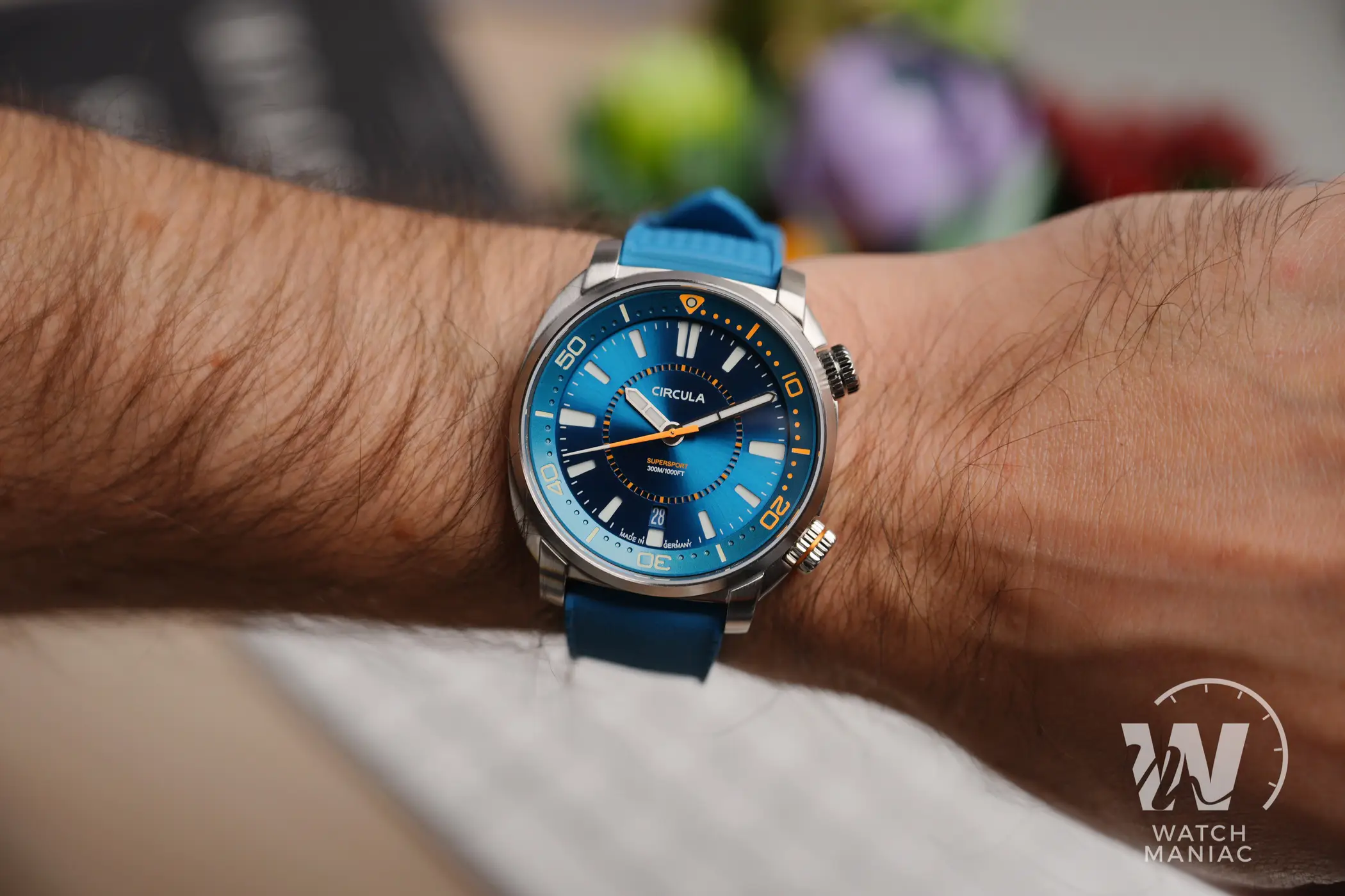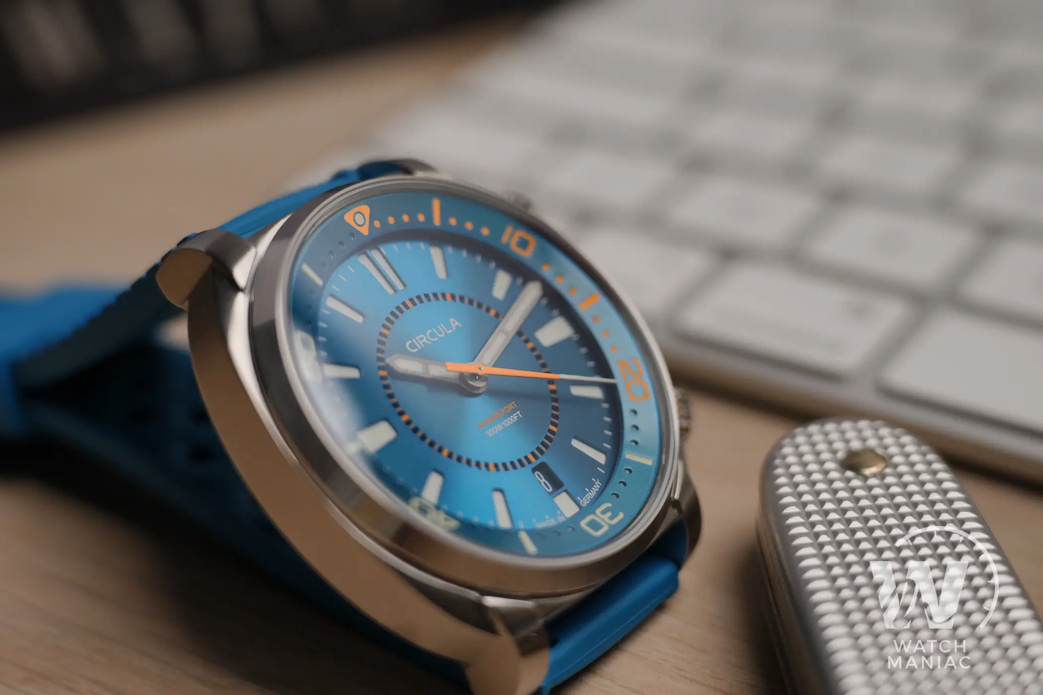 Al momento il SuperSport può essere scelto in 3 diverse colorazioni, Petrol, Black e Blue. La configurazione scelta per questa recensione è la terza, anche se in realtà in questo caso la tonalità è più che altro verde acqua, davvero bella vivace e risalta parecchio grazie alla finitura soleil. Nella parte alta c’è il marchio stampato, mentre in basso troviamo il nome del modello e il dato sull’impermeabilità fino a 300m. In piccolo a ore 6 non manca la dicitura Made In Germany, dato che questi sono orologi effettivamente assemblati in Germania.