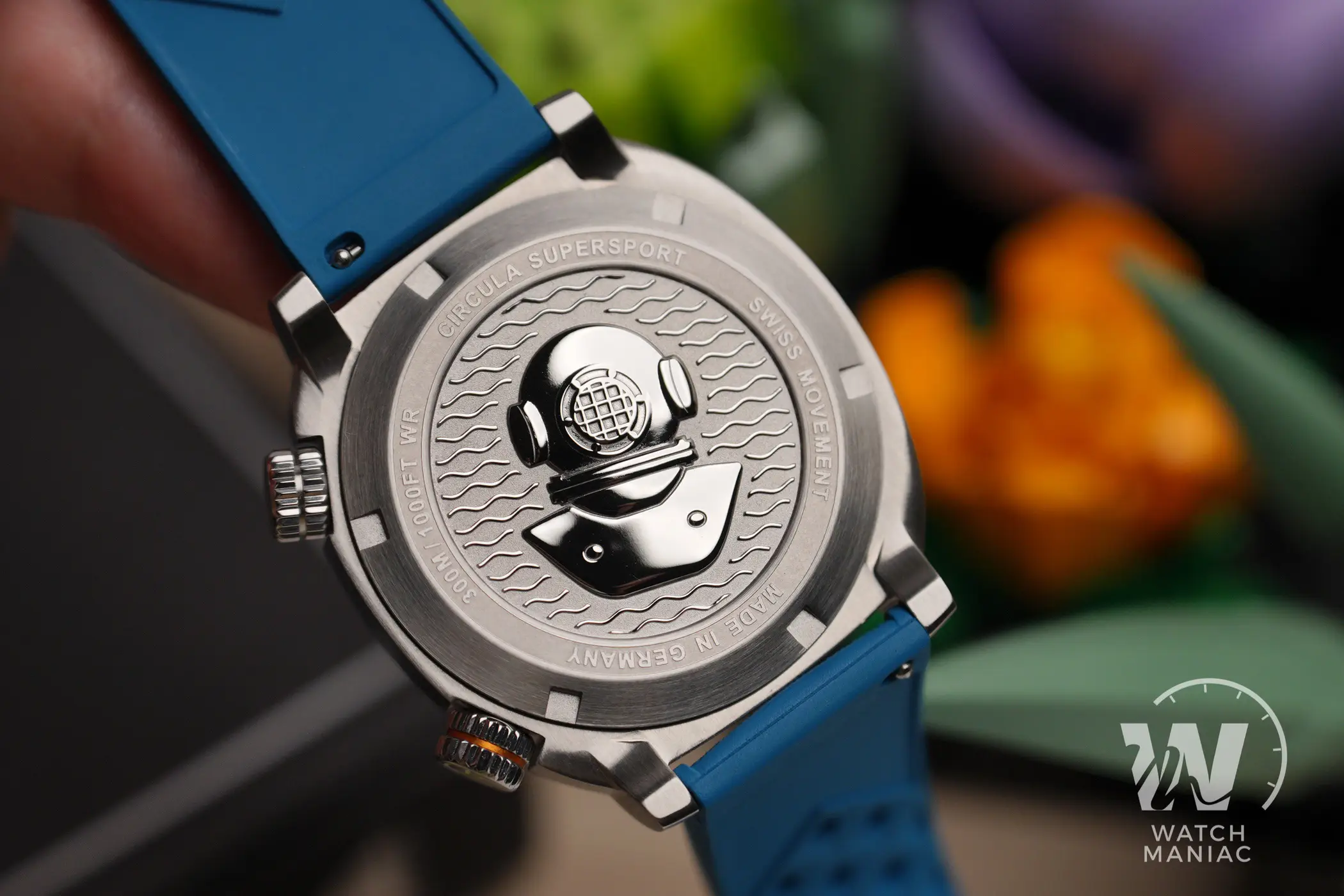 Girando la cassa troviamo un fondello in acciaio splendidamente decorato con al centro la raffigurazione di un casco da palombaro. Tra le varie scritte viene ribadito il dato sull’impermeabilità fino a 300m di profondità. Il Circula SuperSport è uno dei pochi veri supercompressor presenti oggi sul mercato. All’interno del fondello c’è una molla che ha il compito di comprimere la guarnizione all’aumentare della pressione esterna, in questo modo più si scende di profondità e più aumenta la tenuta stagna della cassa. Oggi, con l’evoluzione dei materiali per la realizzazione delle guarnizioni, questo sistema è diventato un po’ obsoleto ma porta comunque con sé un indiscutibile fascino.