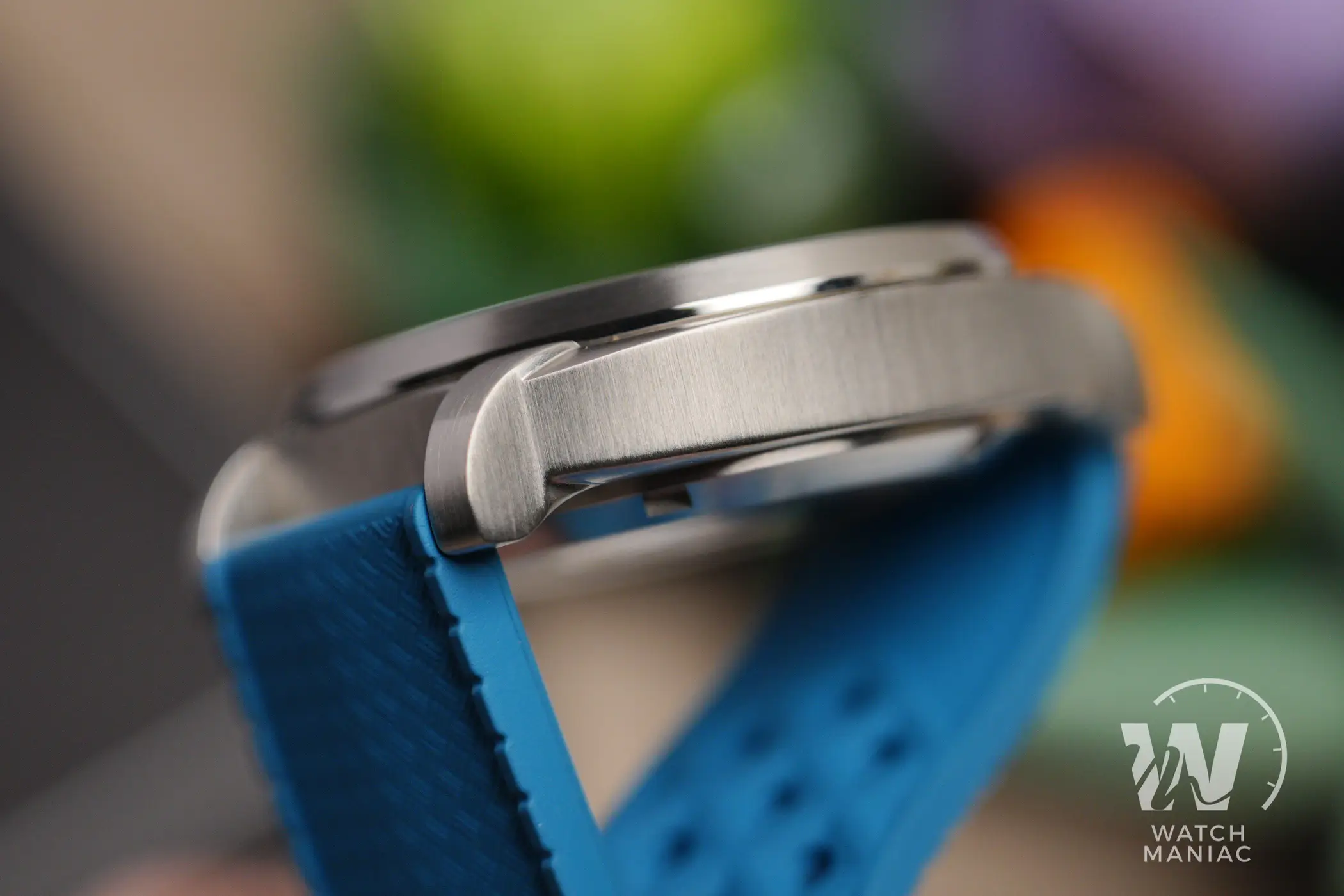 La cassa ha una forma molto particolare, in parte riconducibile al design a cuscino di Panerai ma completamente rivista. Nell’insieme dimostra un buon livello di originalità, soprattutto a livello delle anse, senza rischiare di diventare esageratamente elaborata. La finitura satinata è molto ben realizzata, trasversale sui fianchi e longitudinale sulla parte superiore. Anche la lunetta intorno al vetro è spazzolata e c’è un piccolo anello lucido che la separa dalla carrure. Dalla vista laterale si può apprezzare uno spessore molto contenuto per un orologio impermeabile fino a 300m.