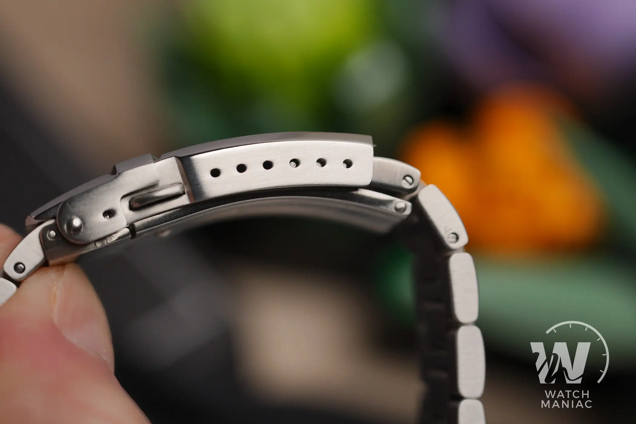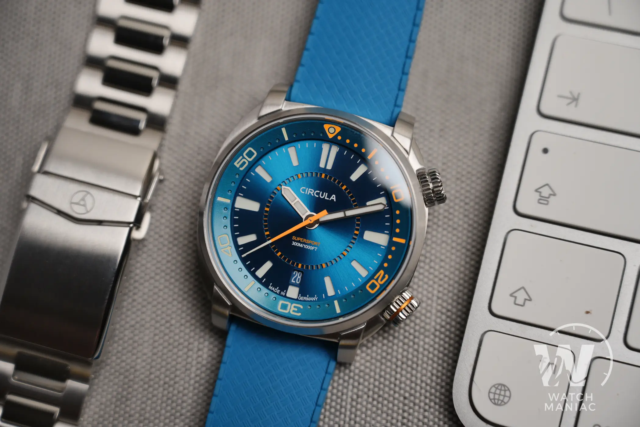 Il Circula SuperSport può essere acquistato con bracciale in acciaio o cinturino in gomma. Nel primo caso abbiamo a che fare con un accessorio che trasmette grande solidità, con maglie ad H spesse e tenute insieme da perni a vite. Gli elementi centrali di raccordo sono lucidi e quindi purtroppo tendono a far risaltare un po’ troppo i graffi superficiali. La clasp è comune a quella utilizzata da tanti altri marchi, ma ha il vantaggio di essere solida e pratica grazie ai 6 fori di microregolazione. Se si vuole puntare alla maggior praticità data dalla gomma, ci sono dei cinturini tipo tropic di buona qualità con fibbia personalizzata e, in questo caso, con una colorazione che richiama quella del quadrante. Su bracciale e cinturino sono presenti anse a sgancio rapido, quindi non è necessario utilizzare attrezzi per passare da uno all’altro.