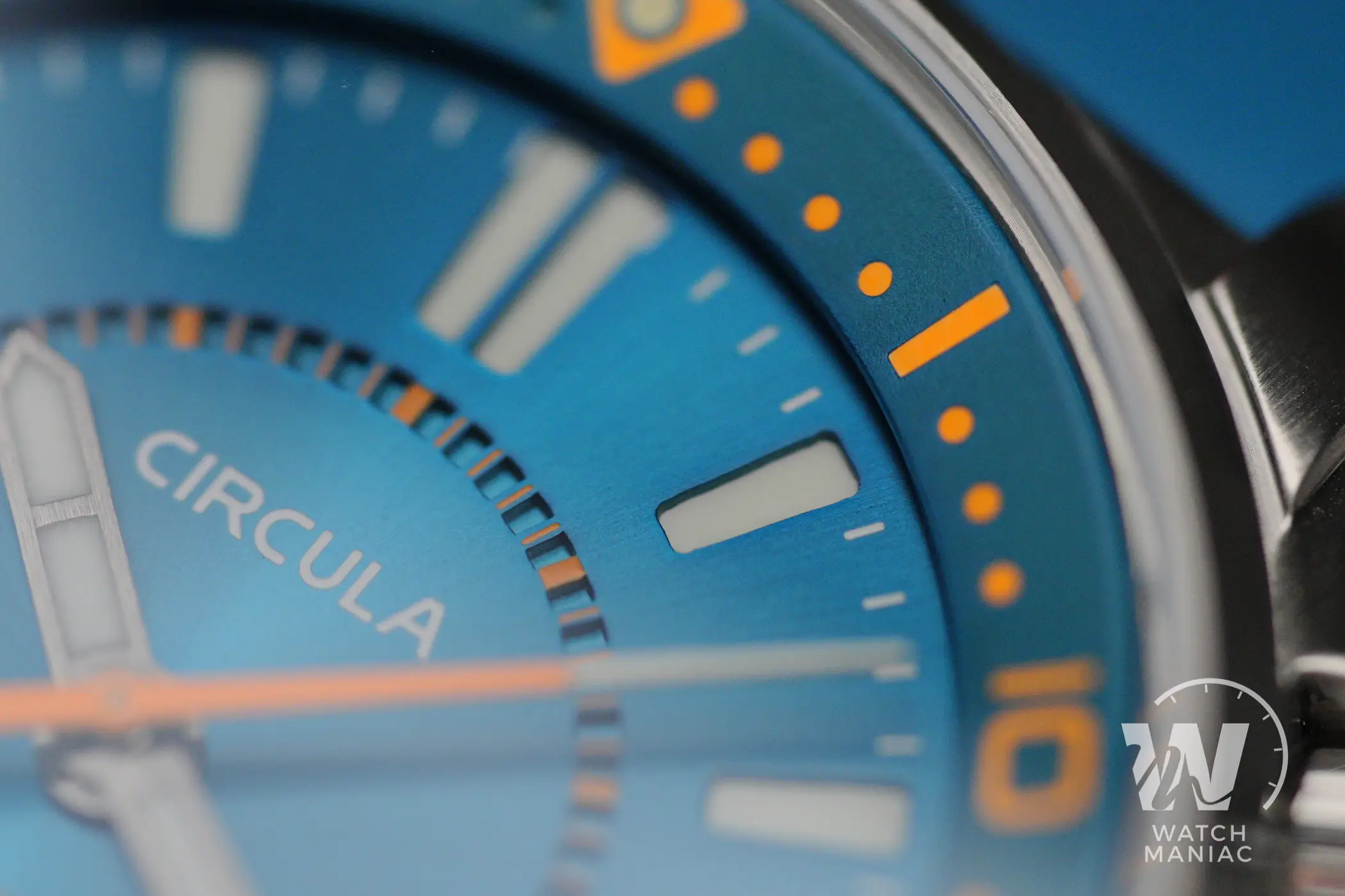 Sul lato destro ci sono le due corone e solo quella a ore 4 è a vite con una filettatura molto precisa senza impuntamenti né in apertura né in serraggio. C’è un anello in alluminio anodizzato arancione e il logo di Circula è inciso e riempito di Superluminova. La corona a ore 2 riprende una decorazione a reticolo piuttosto comune sui diver anni ‘60 e ‘70, ma non è a vite e in questo modo replica la scelta tecnica fatta da Christopher Ward sul C65 Supercompressor. Tra l’altro, all’interno della scatola di Circula, c’è un avviso in cui si ricorda di non azionare la corona mentre si è in acqua, probabilmente perché la rotazione potrebbe alterare l’efficacia della guarnizione.