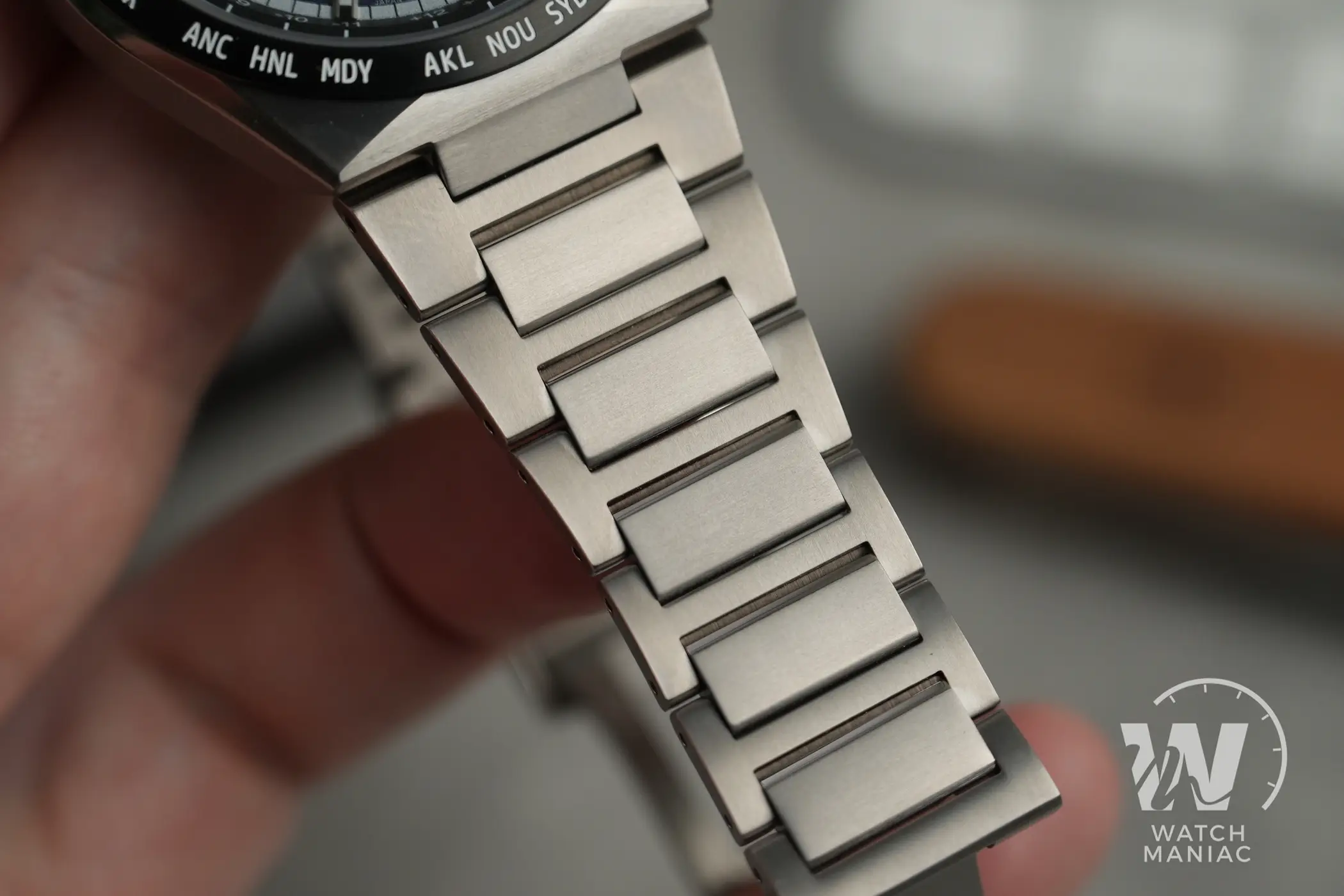 Il bracciale in titanio ha un design delle maglie ad H con perni a pressione e collarini centrali per tenere ben saldi tra loro i vari elementi. È decisamente flessibile, ma dà anche l’impressione di essere molto solido. Ciò che colpisce di più però è la clasp, apparentemente di tipo standard, ma che cela al suo interno un meccanismo di microregolazione rapida con 3 posizioni. Premendo i pulsanti laterali di sgancio è quindi possibile regolare con precisione la misura del bracciale.