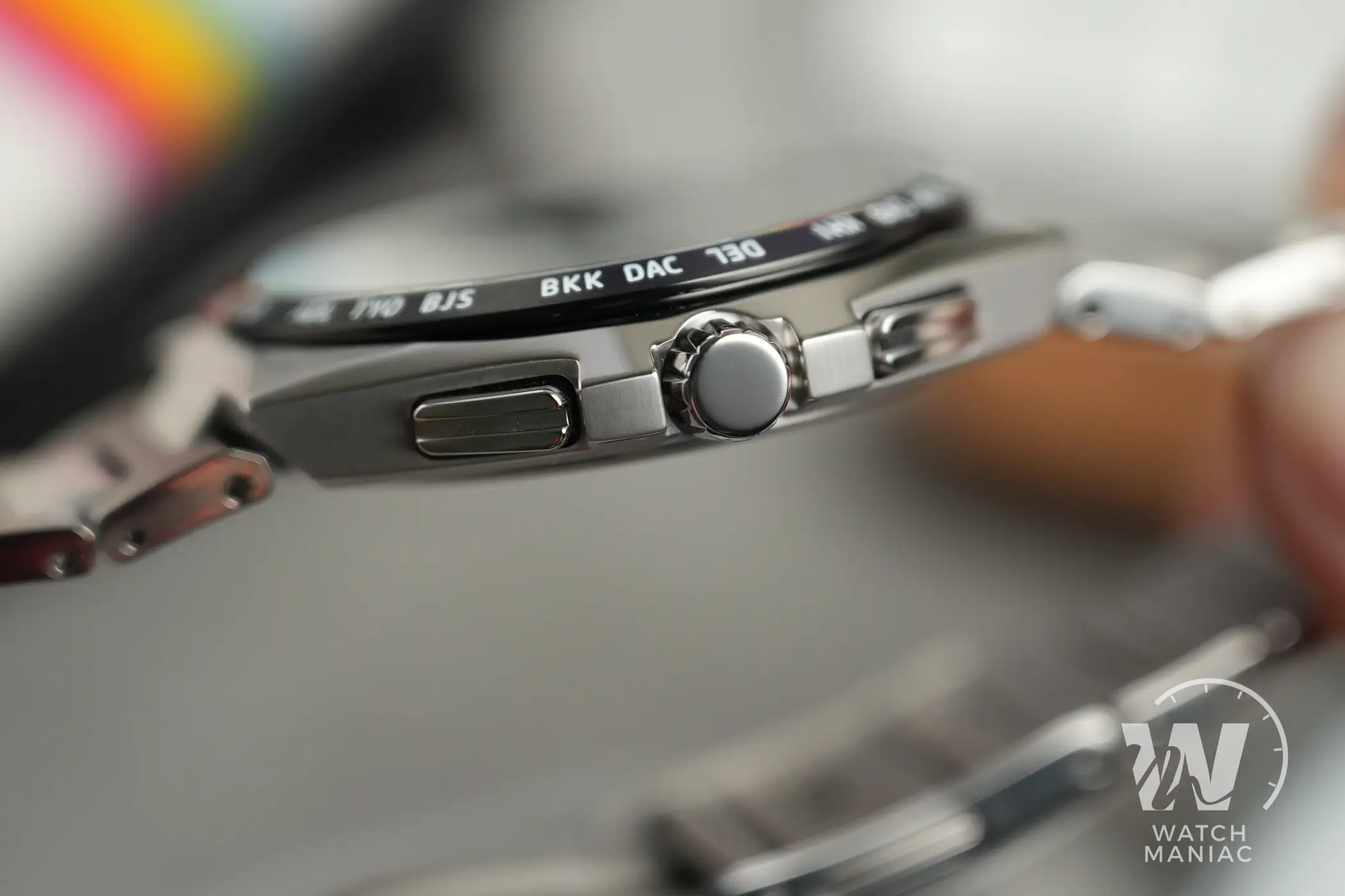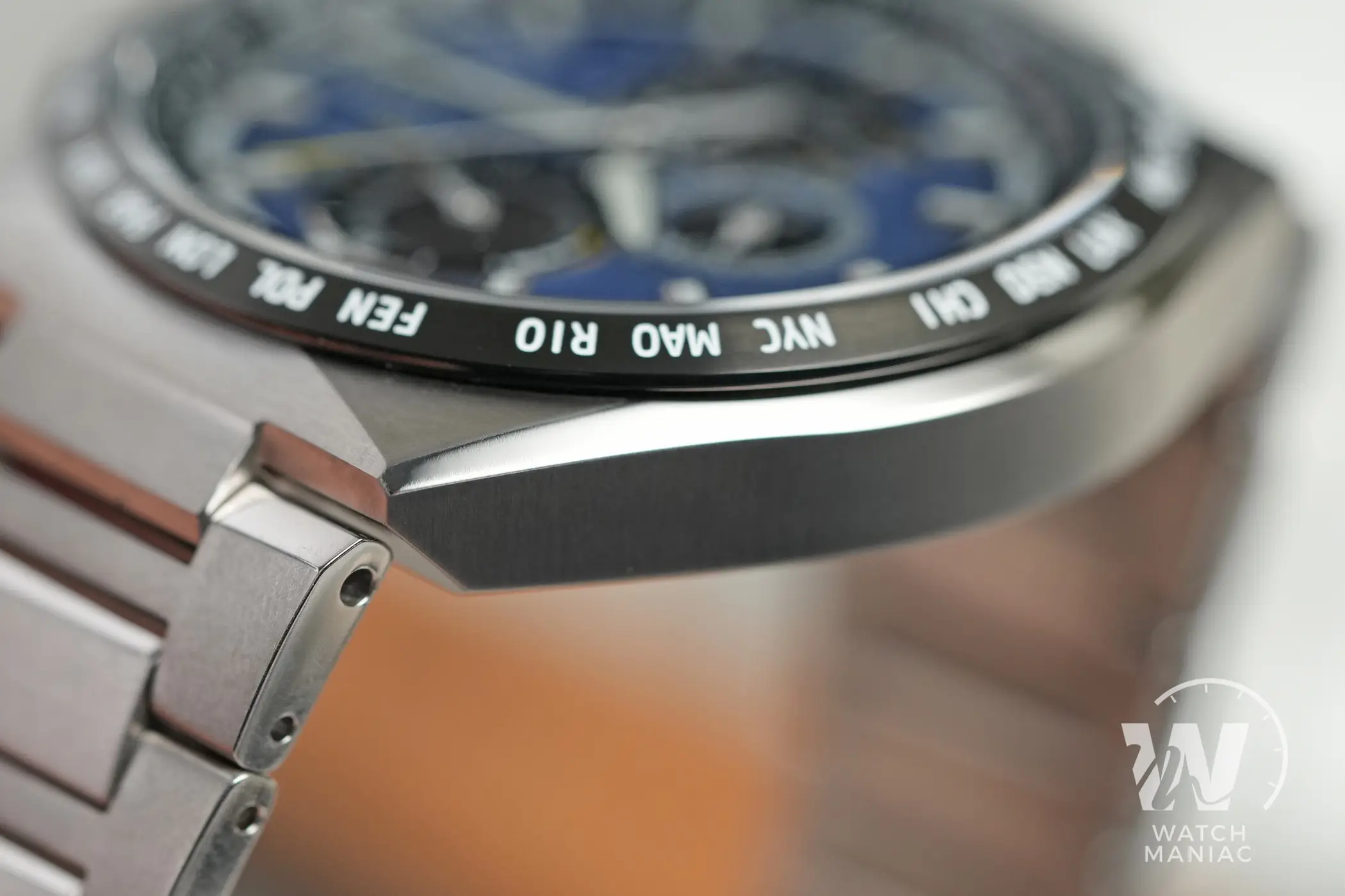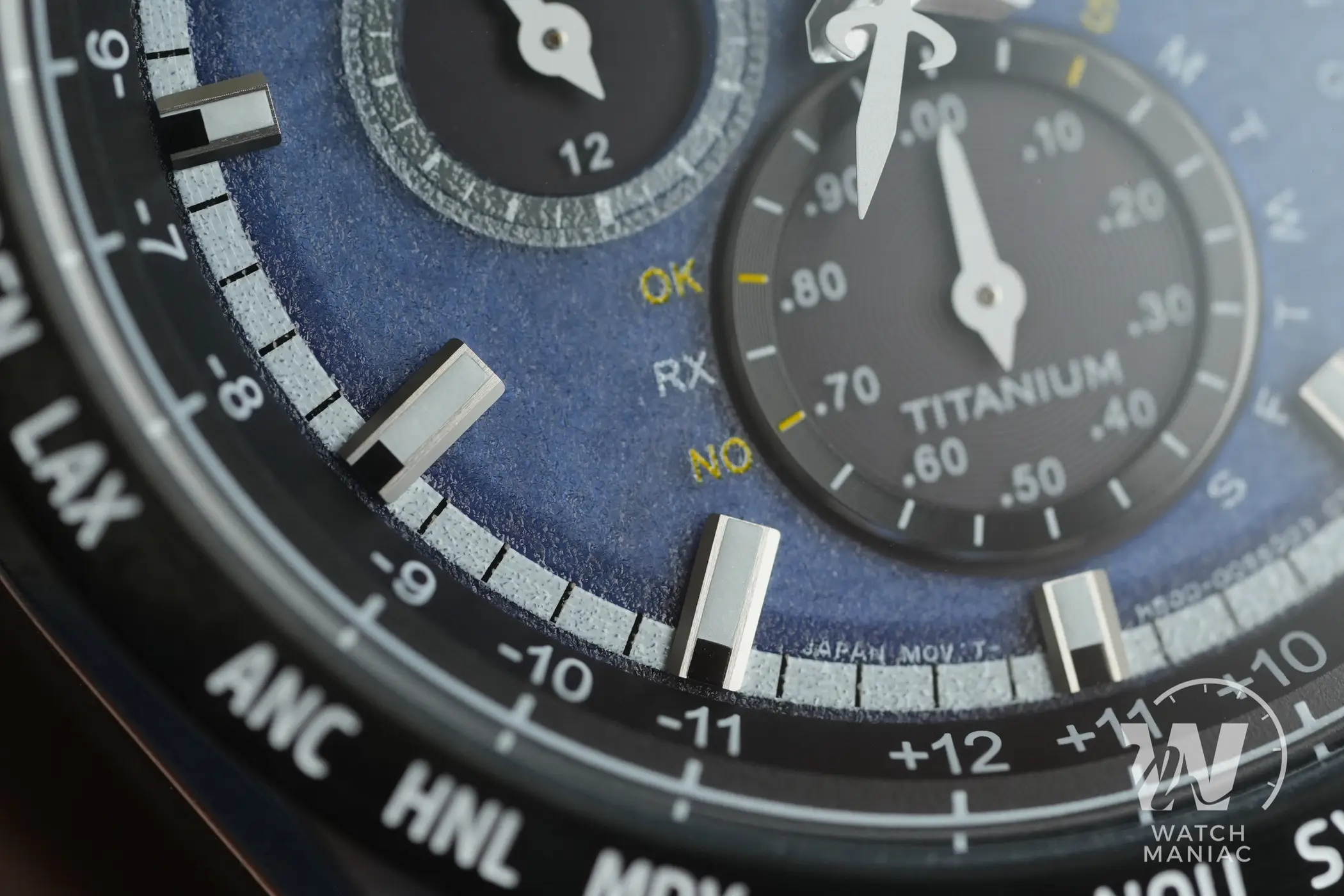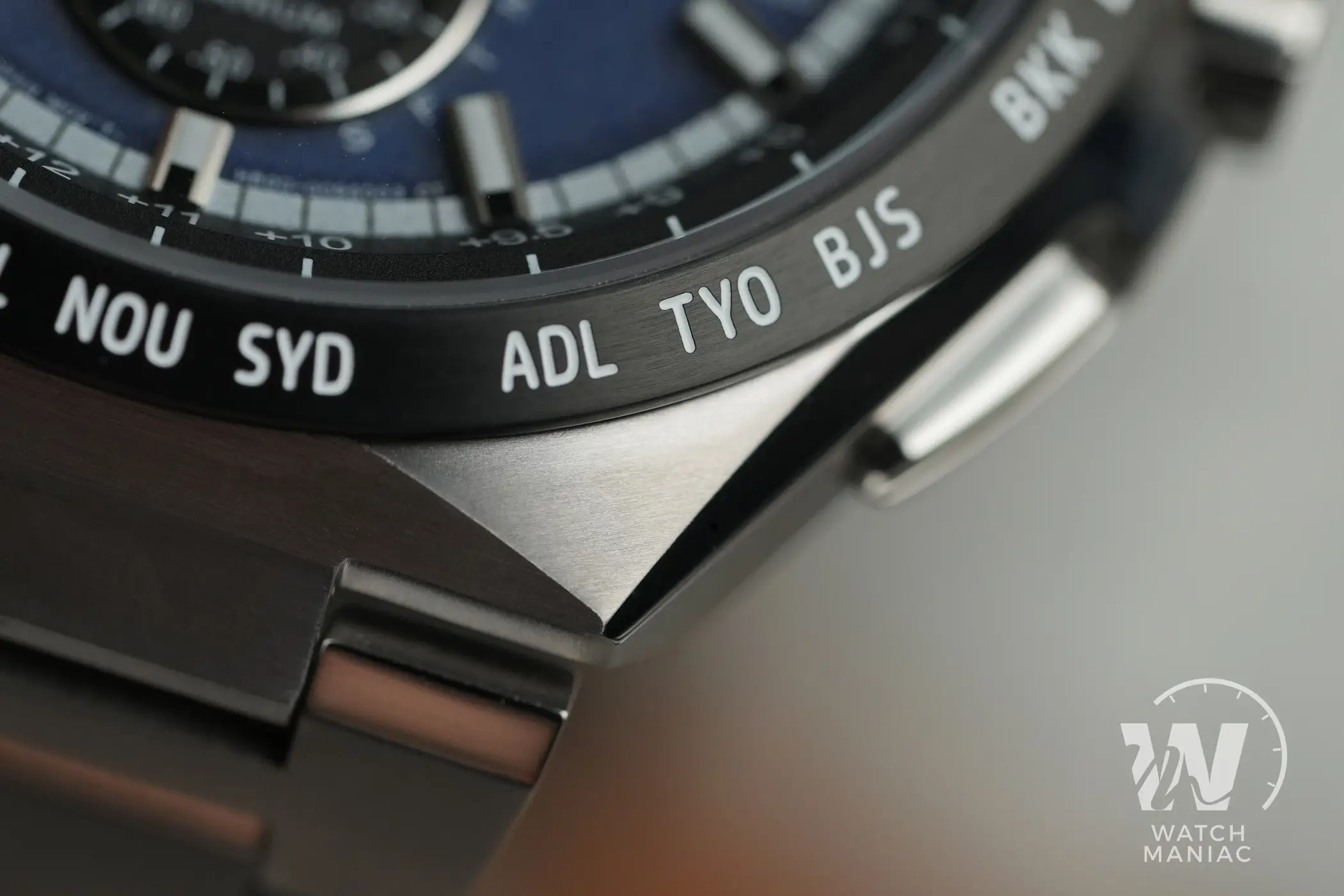 Il vetro è uno zaffiro piatto. Non viene dichiarata la presenza del trattamento antiriflesso sul lato interno, ma comunque le prestazioni sono molto buone anche con luce diretta e la visibilità resta ottima anche ad angolazioni estreme. Intorno al vetro c’è una lunetta in titanio spazzolato con rivestimento nero superficiale e le sigle corrispondenti alle principali città del mondo incise nello spessore.