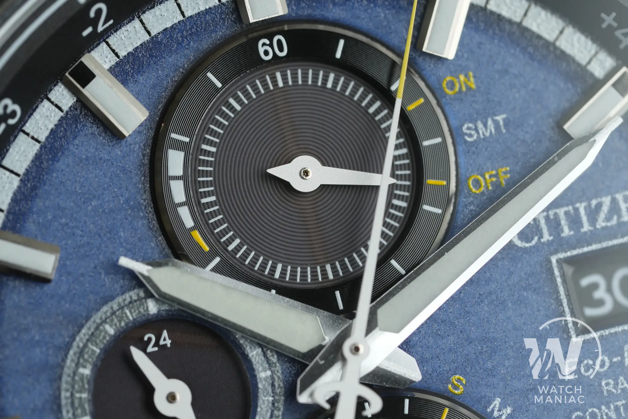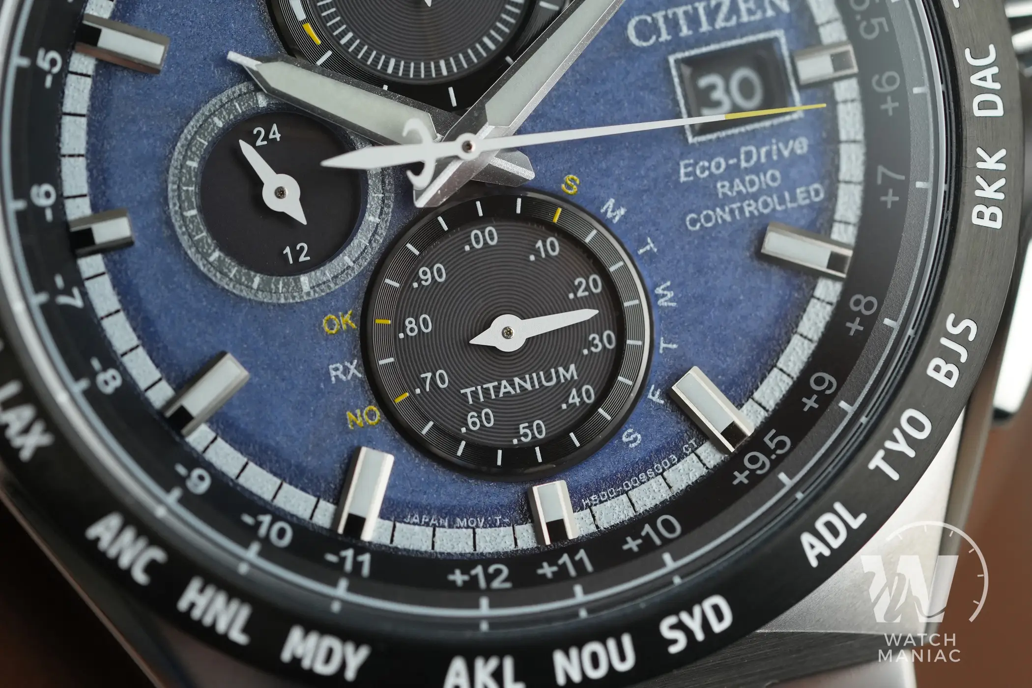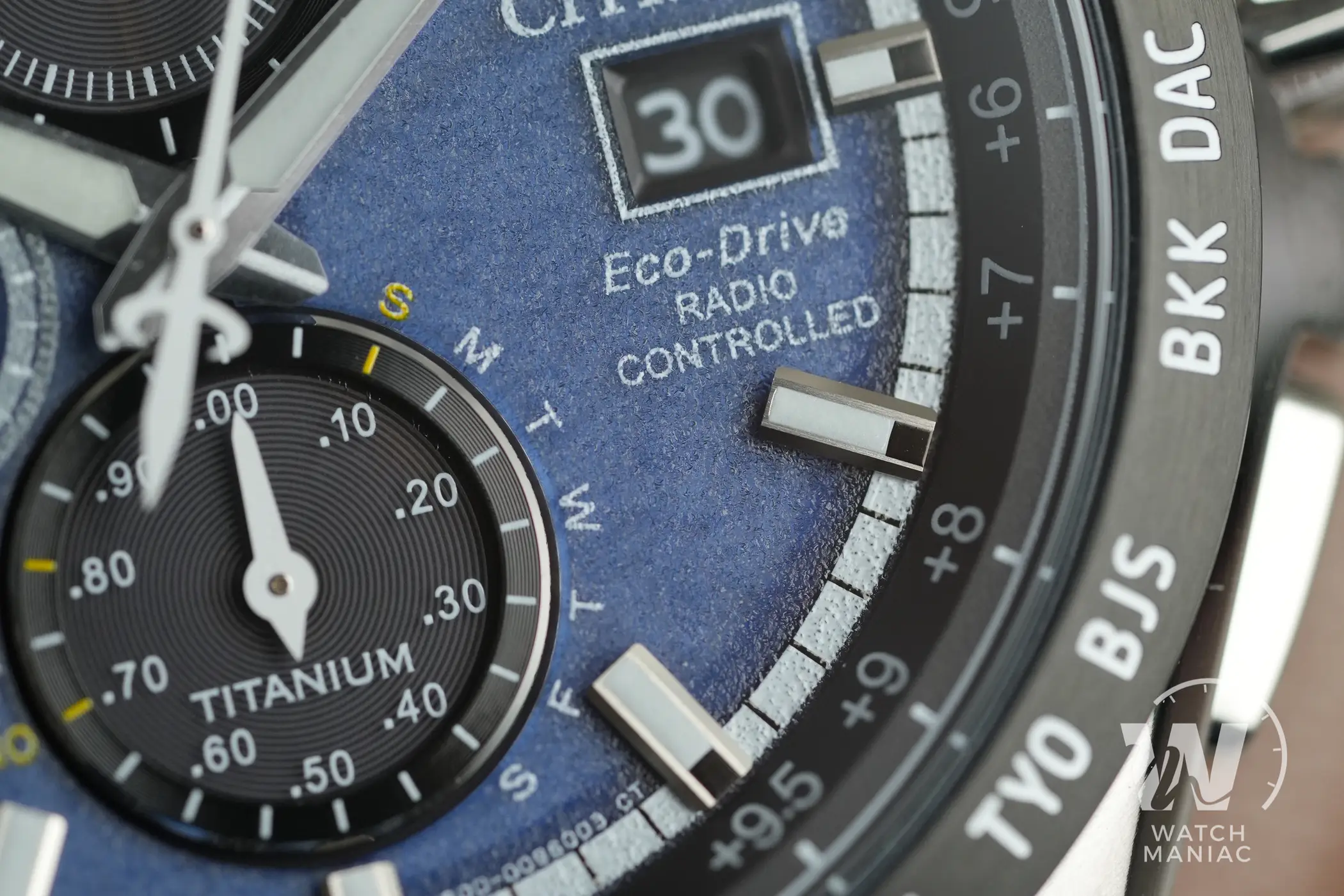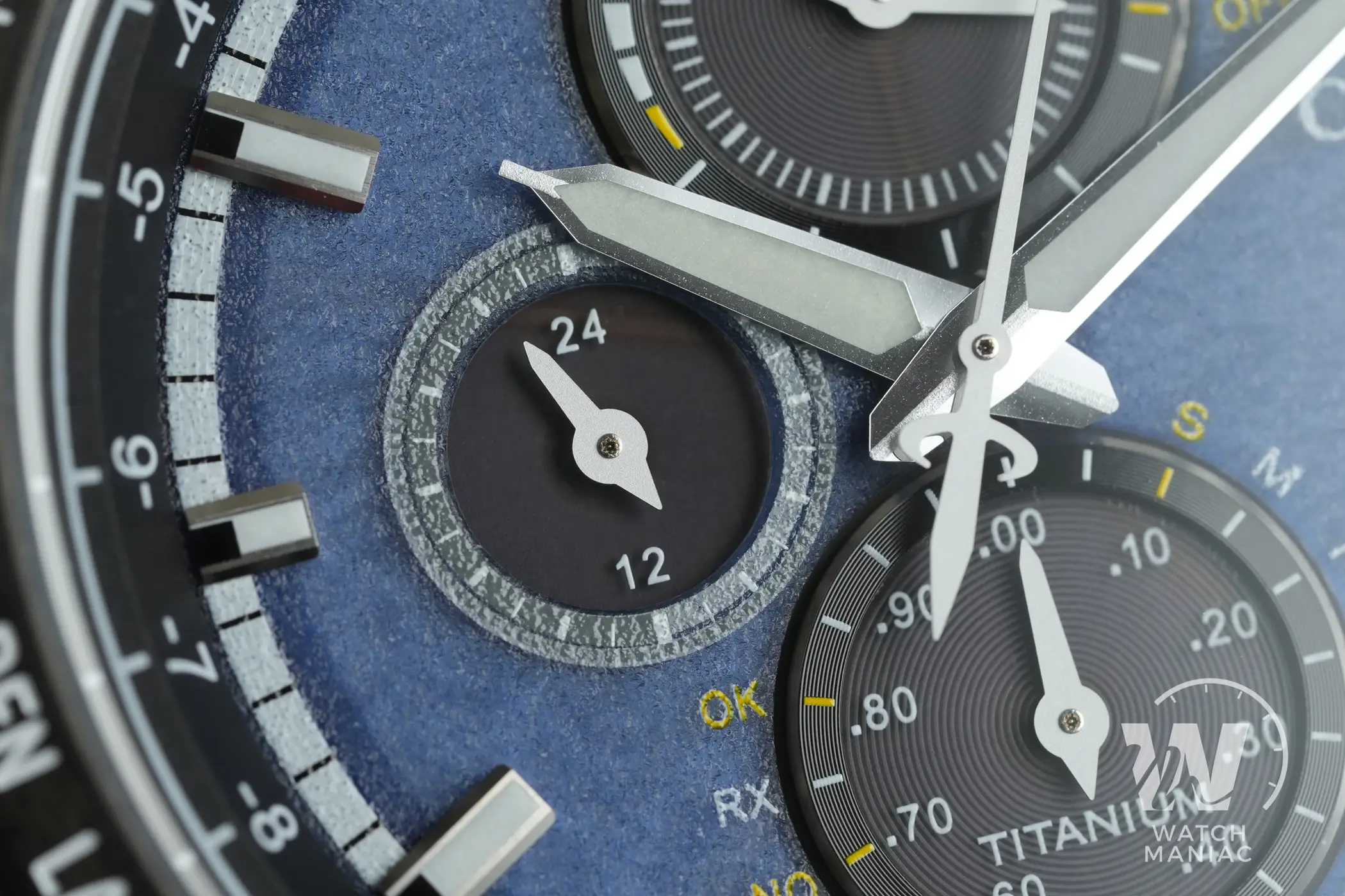 I Citizen AT-8 Super Titanium sono disponibili in tre diverse colorazioni. Nella versione blu il quadrante ha una tonalità jeans, che unita alla superficie granulosa e irregolare, rende particolarmente gradevole questa referenza. Rispetto ad altri modelli, qui le funzioni (e quindi anche le informazioni) sono tante e questo si riflette in una gran numero di elementi grafici e in 3 sottoquadranti. È anche per questa ragione che l’unica zona rimasta a disposizione per il logo e le altre pochissime scritte è in corrispondenza della finestra della data a ore 3. Nonostante questo la leggibilità dell’orario è veramente molto buona, merito delle sfere di dimensioni generose con la lancetta dei minuti che arriva a sfiorare le tacche sulla parte più esterna del quadrante. Degni di nota poi gli indici applicati e sfaccettati, anch’essi molto ben realizzati. Pur non essendo dei diver la visibilità al buio è davvero ottima, con una luminescenza intensa, uniforme e duratura anche a distanza di parecchio tempo dall’esposizione ad una fonte di luce.
