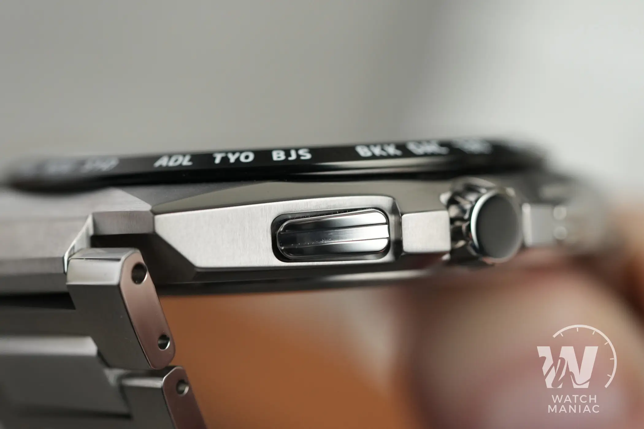 Sul fianco destro si notano poi i due pulsanti dalla forma originale e con una scanalatura centrale. Questi hanno una finitura lucida a specchio ripresa poi anche per la corona, che è a pressione ma garantisce comunque un’impermeabilità fino a 10bar.Il fondello, anch’esso a pressione, non ha decorazioni particolari ed è interamente satinato con pattern circolare. Tra le varie informazioni incise è riportato anche il dato sull’impermeabilità e sulla resistenza agli urti con decelerazioni fino a 11G.