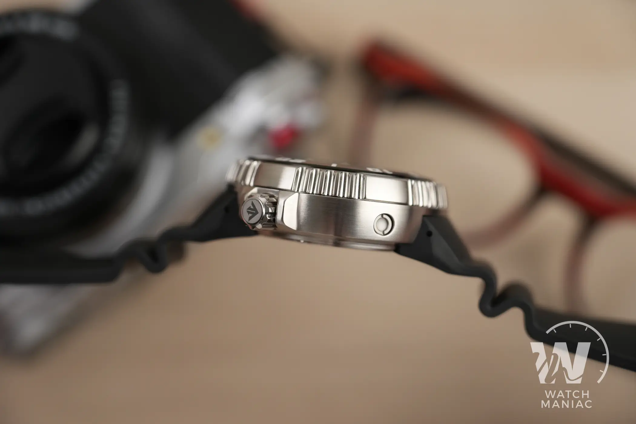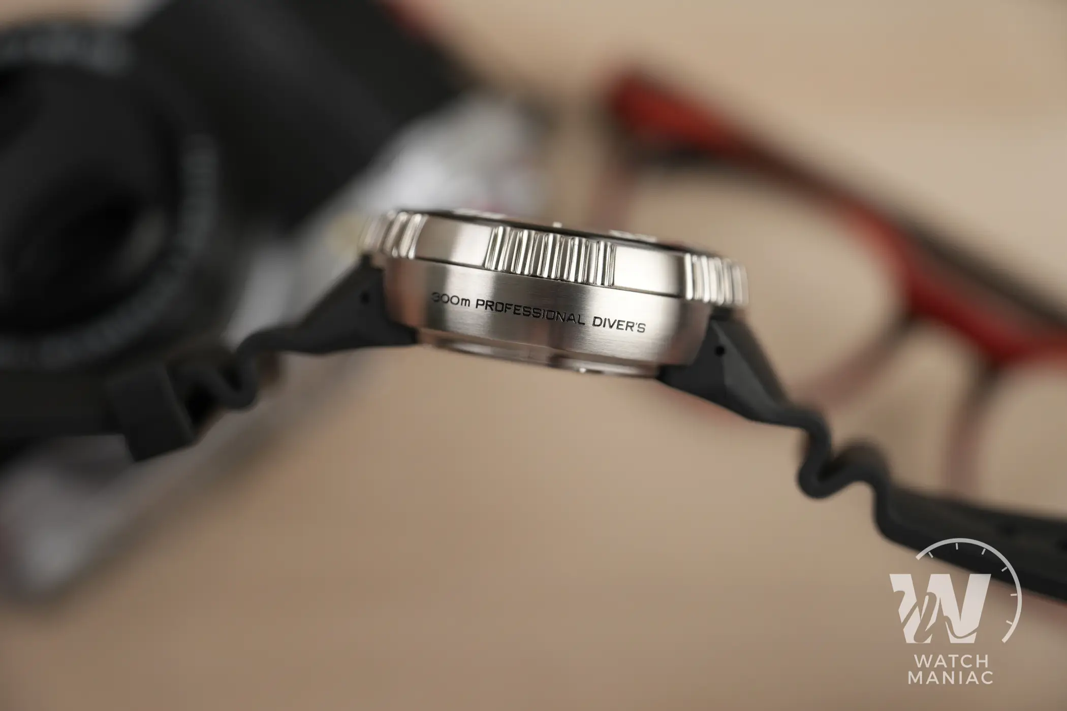 Il vetro è un zaffiro da ben 4mm di spessore, un consistente upgrade rispetto al vetro minerale utilizzato sugli Eco Drive Diver’s 200m. La resistenza ai riflessi è molto buona e la leggibilità resta ottimale anche ad angolazioni estreme, un dettaglio non da poco dato il suo spessore.