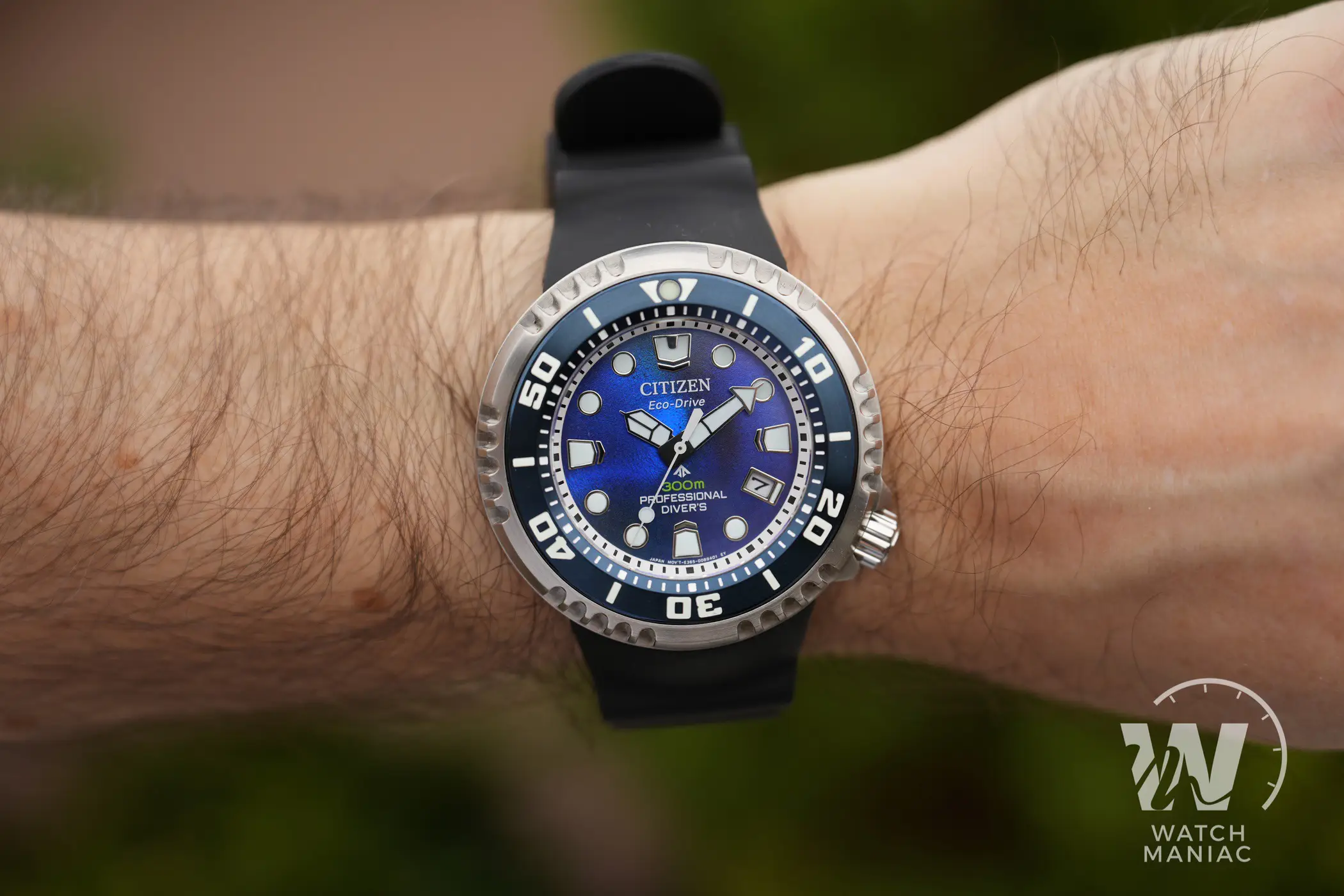 Il Citizen Promaster Eco Drive Professional Diver’s 300m non è certamente un modello compatto destinato a passare inosservato sotto il polsino di una camicia e sarebbe anche sbagliato se lo fosse. Le sue proporzioni sono pensate per un utilizzo in ambito professionale, dove la visibilità in ogni condizione e la resistenza agli urti e alle alte pressioni sono caratteristiche fondamentali. Nonostante questo, proprio come tutti gli altri orologi con design “lugless”, anche in questo caso la vestibilità è sorprendente se si considerano le misure della scheda tecnica, persino su polsi piccoli da 16cm. Il diametro è di 46mm, così come la distanza da ansa ad ansa, resa visivamente più voluminosa dalla presenza del cinturino tecnico. Lo spessore è di 16mm e il peso è di 161g.