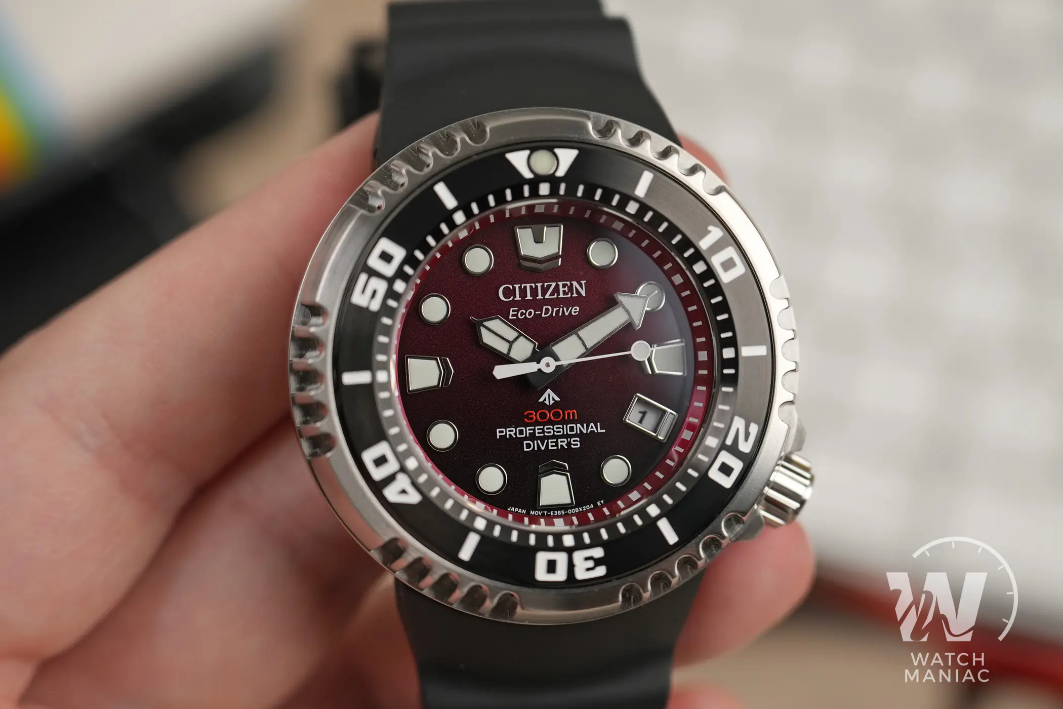 Le lancette di ore e minuti mantengono il design tipico per Citizen e hanno dimensioni decisamente importanti, ma rispetto ad altri diver del marchio giapponese qui la sfera dei minuti non è messa in risalto da una colorazione a contrasto, un dettaglio che personalmente mi avrebbe fatto piacere.
