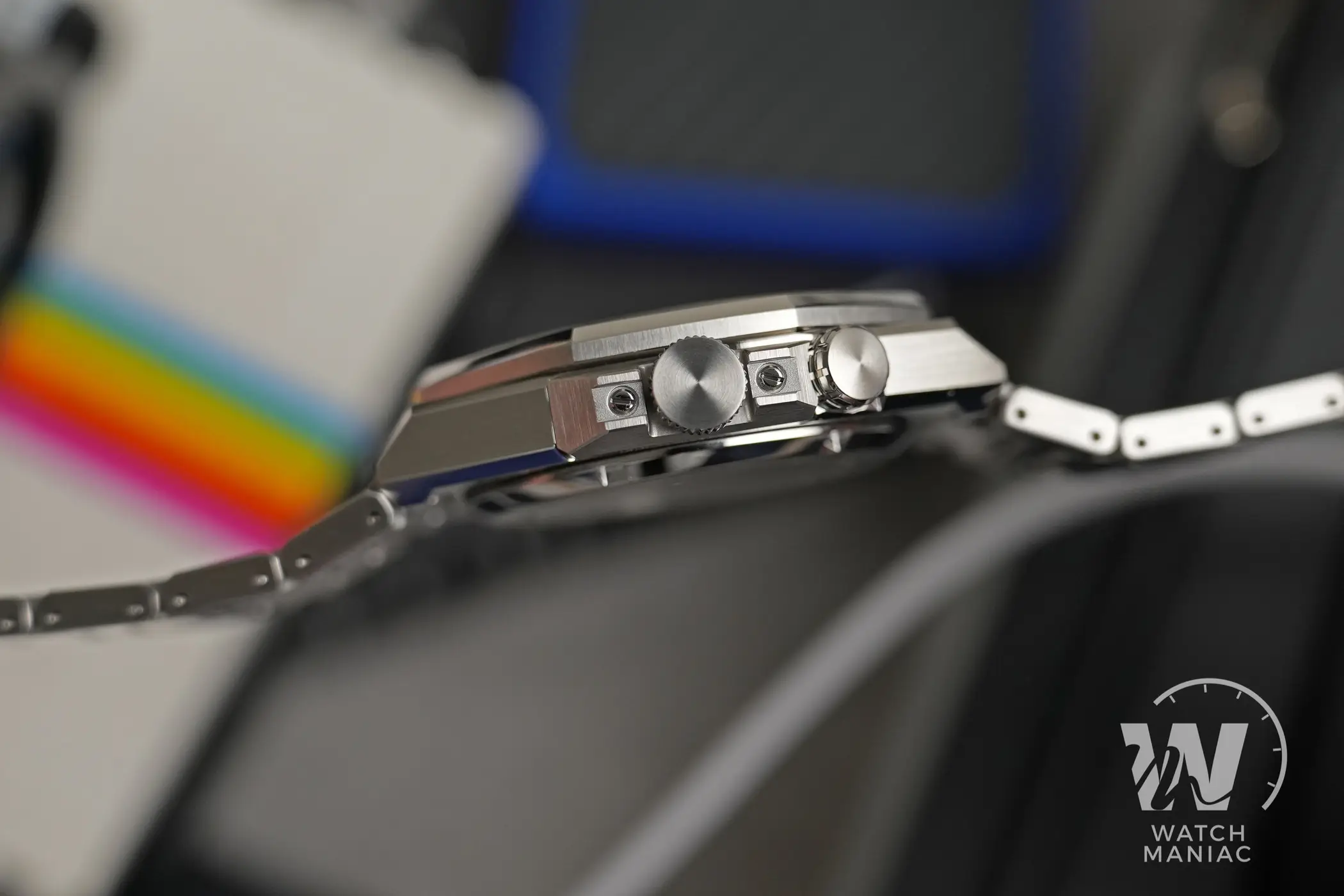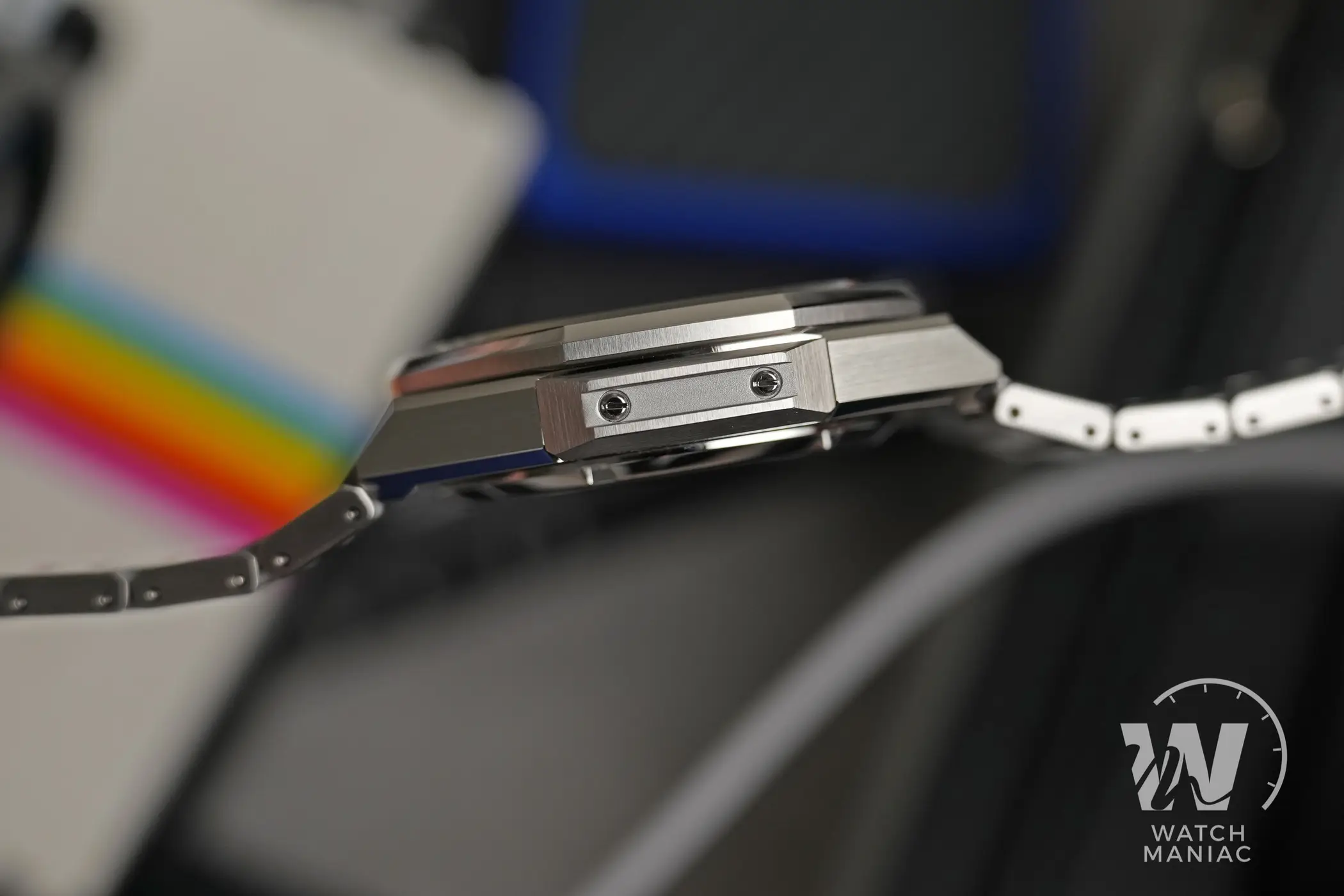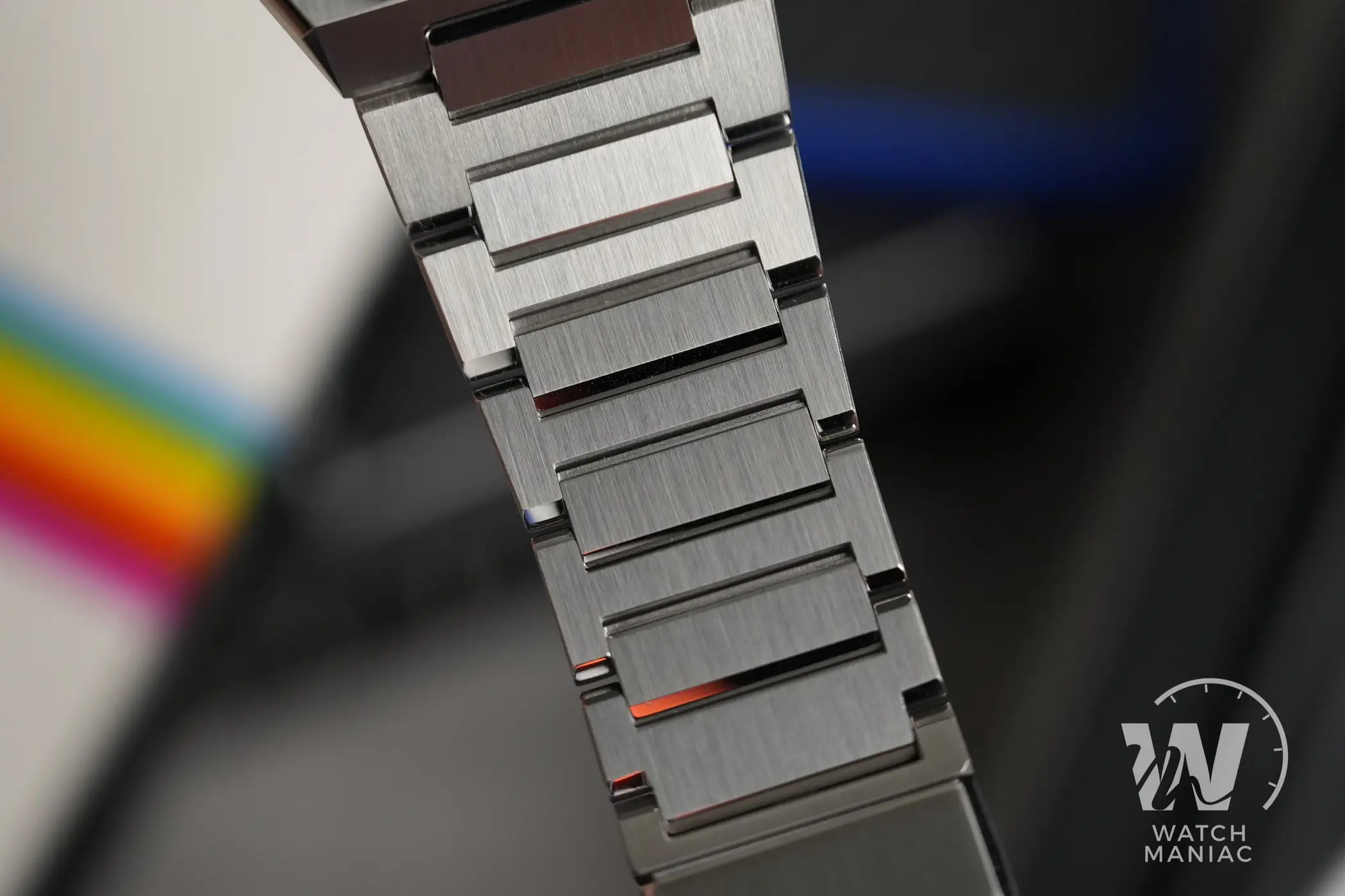 Il bracciale è di tipo integrato con un design delle maglie ad “H” e si fa notare per lo stesso livello delle finiture della cassa (molto alto!), con la maggior parte delle superfici satinate e i biselli lucidi nei punti di snodo tra un elemento e l’altro. Le maglie sono spesse e trasmettono la sensazione di essere molto solide, ma ciononostante il bracciale rimane flessibile. La chiusura è gradevole da vedere e ha bracci interni ricavati dal pieno. Non ci sono fori per la microregolazione ma sono presenti due mezze maglie per riuscire a trovare la misura giusta per il proprio polso.