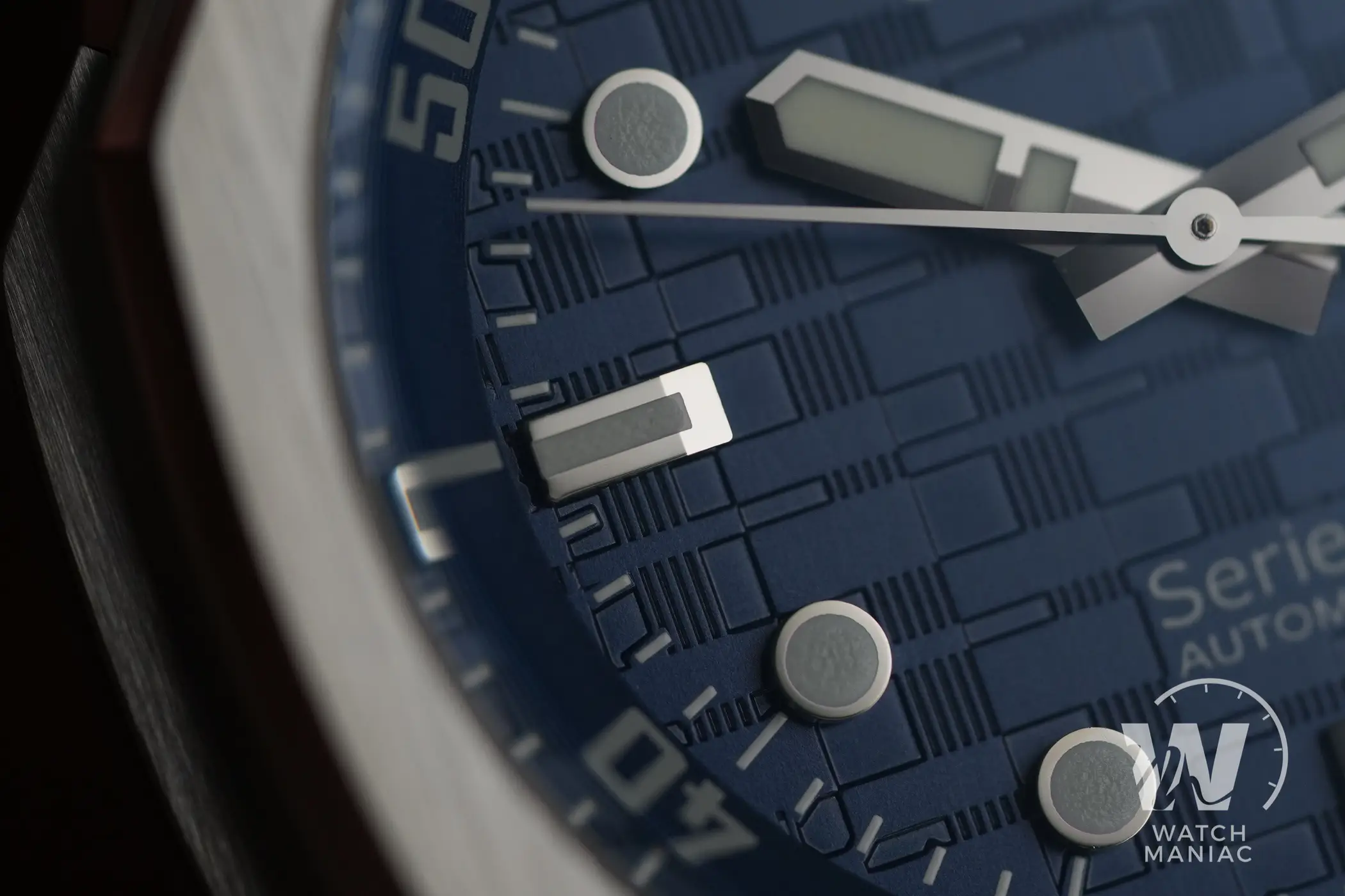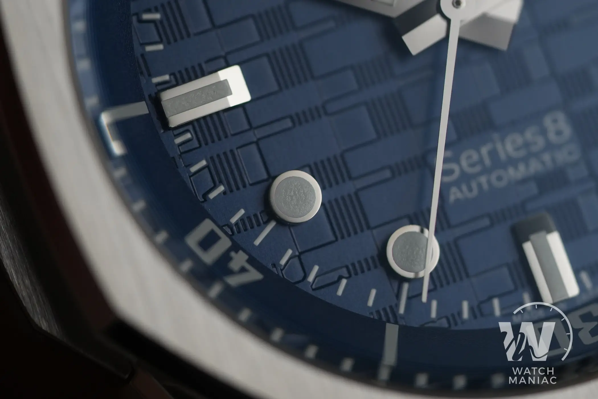 La finestra della data a ore 3 è circondata da una cornice argentata. Gli indici sono applicati con finitura lucida ben realizzata e quelli a ore 6, 9 e 12 risaltano particolarmente grazie alle sfaccettature sulla parte più interna quando vengono colpiti dalla luce. All’esterno della minuteria c’è la ghiera interna girevole. Questa viene azionata tramite la corona secondaria a ore 2, è libera di muoversi in entrambe le direzioni senza alcuno scatto ed è molto fluida e ben assemblata.