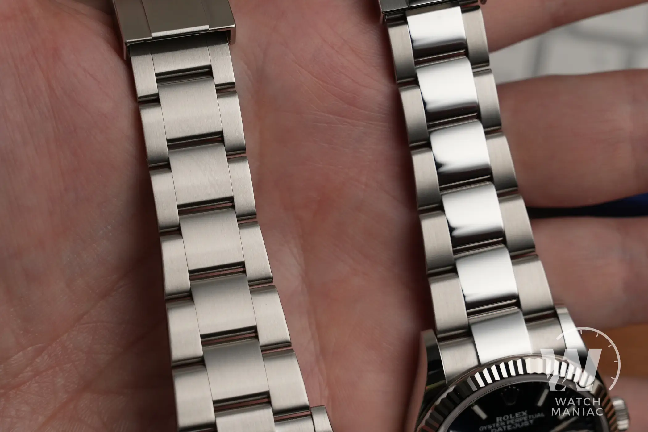 I bracciali attuali di Rolex sono di grandissima qualità e gli Oyster montati su questi due modelli non fanno eccezione. La finitura interamente satinata sul Perpetual ha l’indubbio vantaggio di nascondere meglio i graffi superficiali, cosa che riesce decisamente meno bene con le maglie centrali lucide del Datejust. Per entrambi è prevista l’ottima clasp con microregolazione e prolunga rapida Easylink di 5mm.