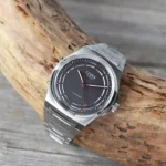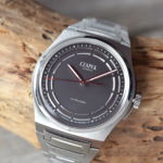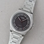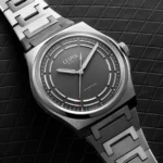 La tipica colorazione grigia più scura rispetto all’acciaio ha anche ispirato la scelta del quadrante, altra novità nella linea Antarctique. Non tanto per il colore, visto che il grigio antracite era già stato utilizzato in precedenza. Quanto piuttosto per la finitura, opaca e a effetto vellutato, e soprattutto per il design degli indici. All’esterno c’è la consueta minuteria, ma su questo Antactique Titanium Dark Sector sono stati applicati dei segmenti arcuati che lasciano degli spazi proprio in corrispondenza degli indici. In tutto questo mix di tonalità di grigio spiccano poi ancora di più i dettagli rossi a ore 12 e sulla parte terminale della sfera dei secondi.