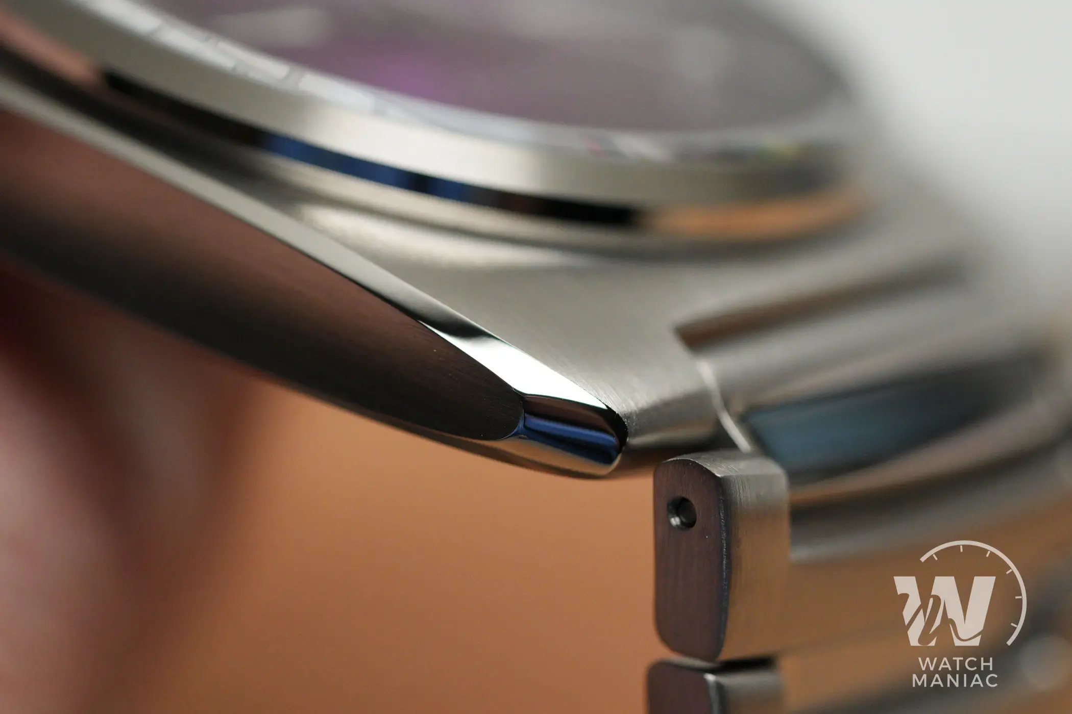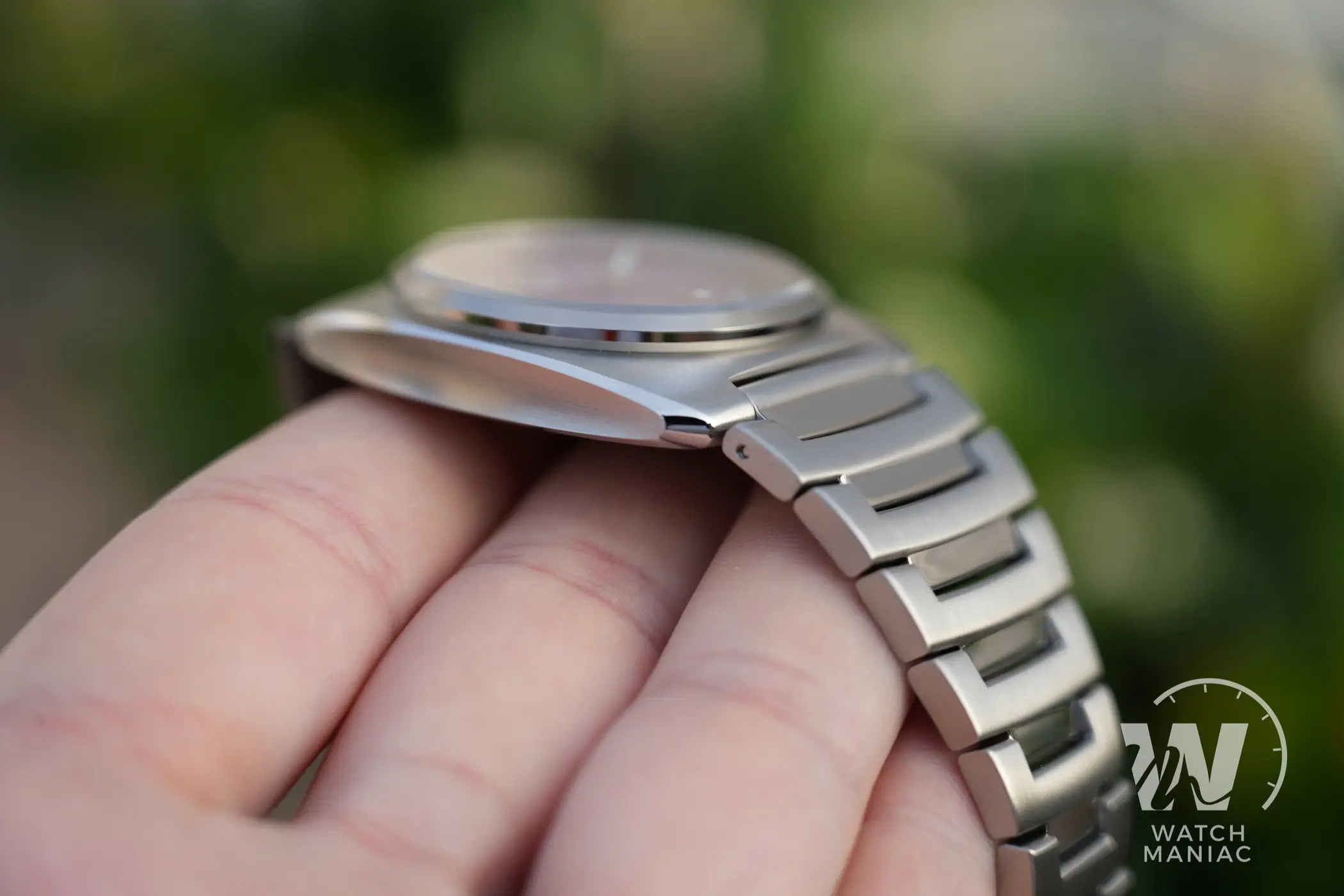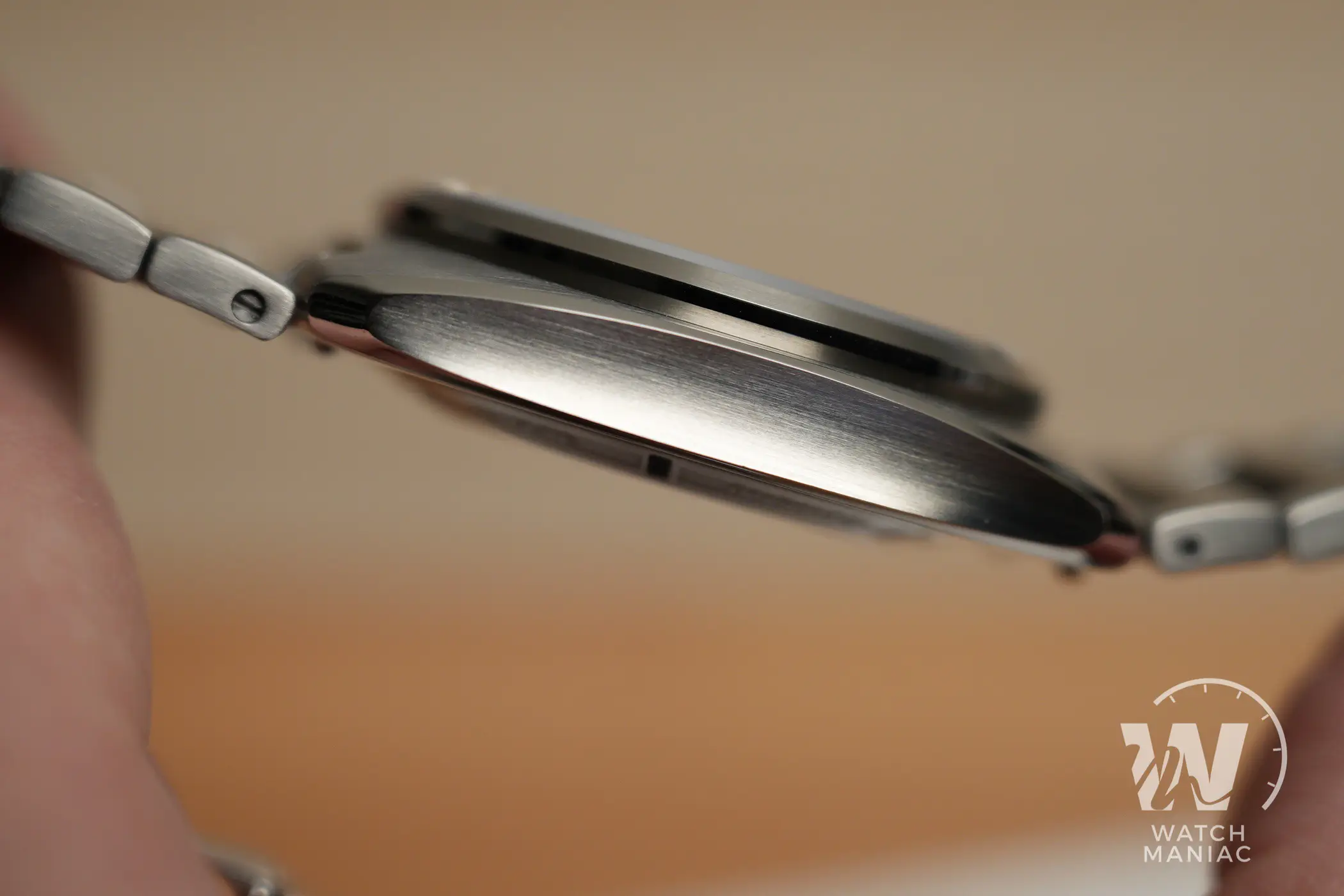 La cassa è incredibilmente ricercata e originale. Il livello delle finiture è davvero alto, ma a questo Direnzo ci ha ormai abituati: le satinature e i biselli lucidi sono di una precisione impeccabile anche se osservati con la lente macro. C’è anche un trattamento superficiale antigraffio con una durezza di 800HV per preservare il più possibile tutte le lavorazioni. Quel che stupisce, però, è il design, chiaramente ispirato a linee anni 70, ma che sono state rielabora in modo davvero sapiente. Non ci sono dettagli lasciati al caso, con anse affusolate quasi a forma di ogiva di aereo e i fianchi non piatti ma concavi, per movimentare ulteriormente lo stile. Dalla vista laterale, poi, lo spessore complessivo è davvero contenuto.