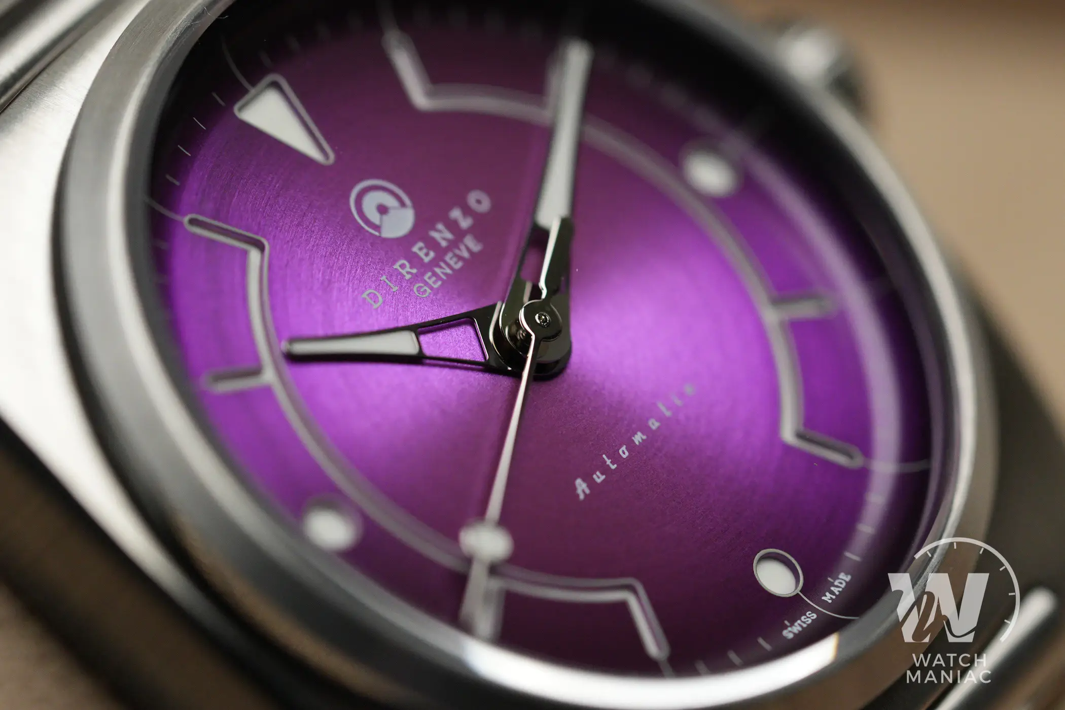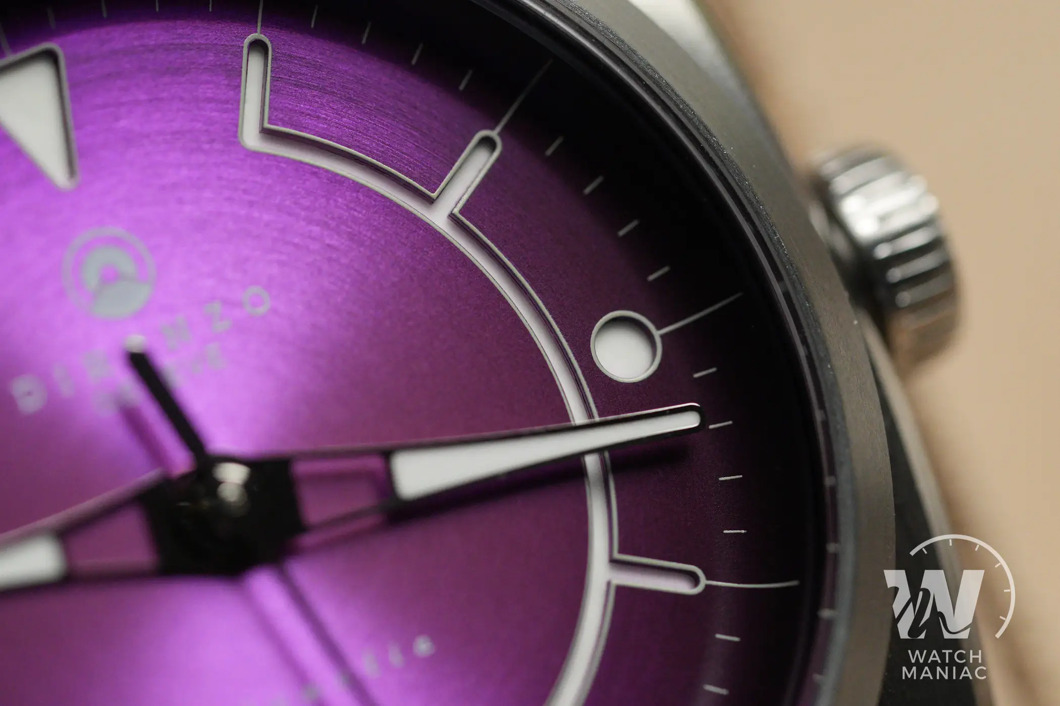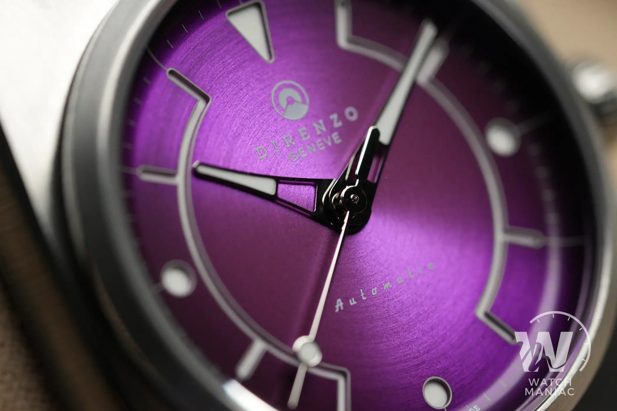 Gli indici sono di tipo sandwich, con lo strato superiore del quadrante inciso per lasciar trasparire la Superluminova applicata alla base. La grafica è estremamente originale e ha un che di futuristico, davvero particolare e riuscita. Il quadrante poi ha un bordo concavo sul quale è stampato il rehaut e questo, come vi accennavo nell’introduzione, è uno dei marchi di fabbrica di Direnzo, presente sulla maggior parte dei modelli prodotti finora.