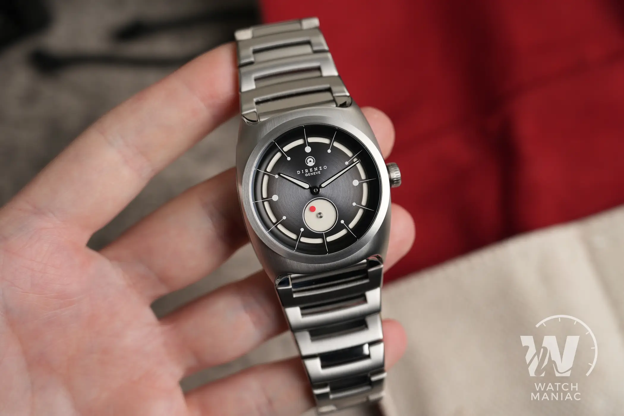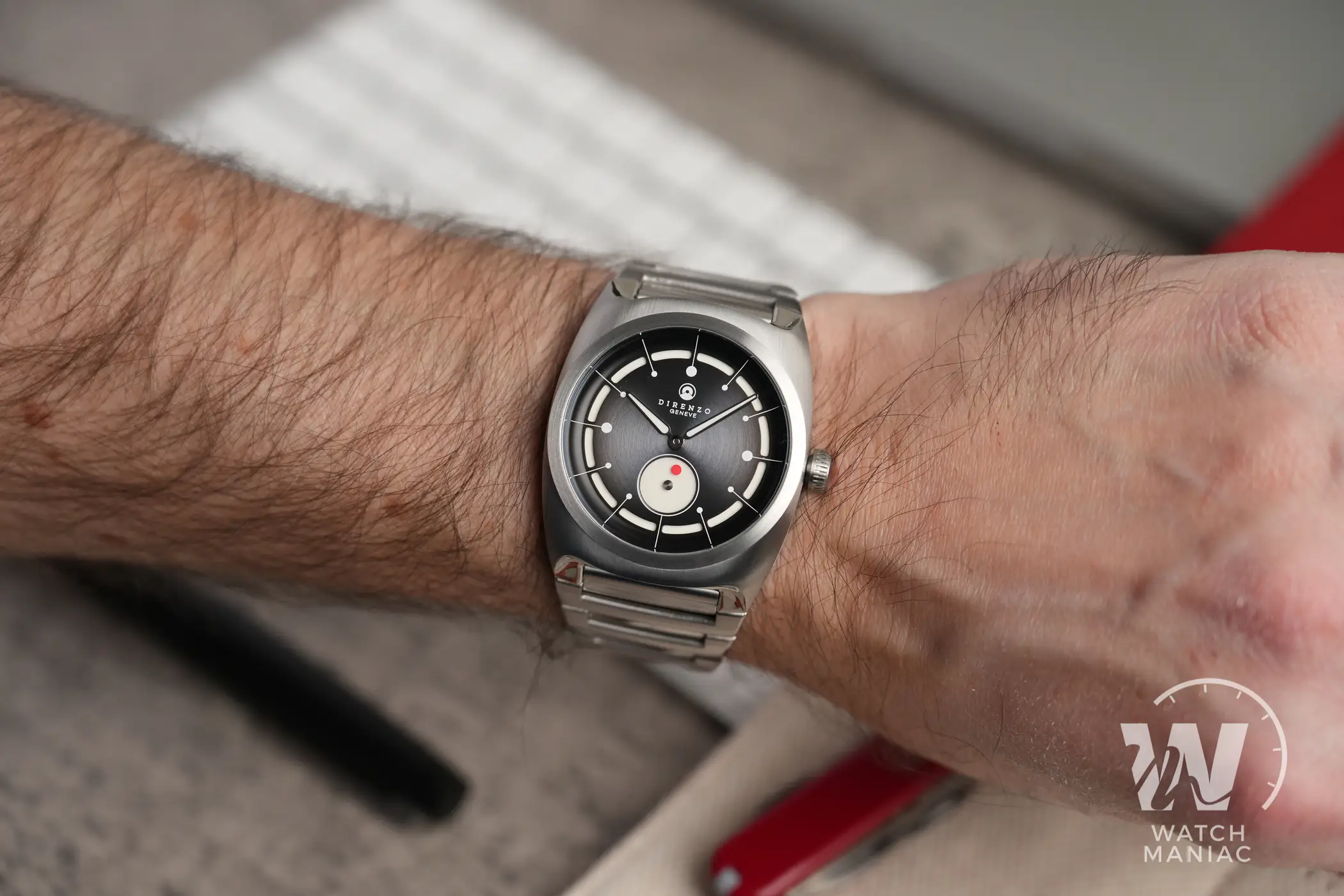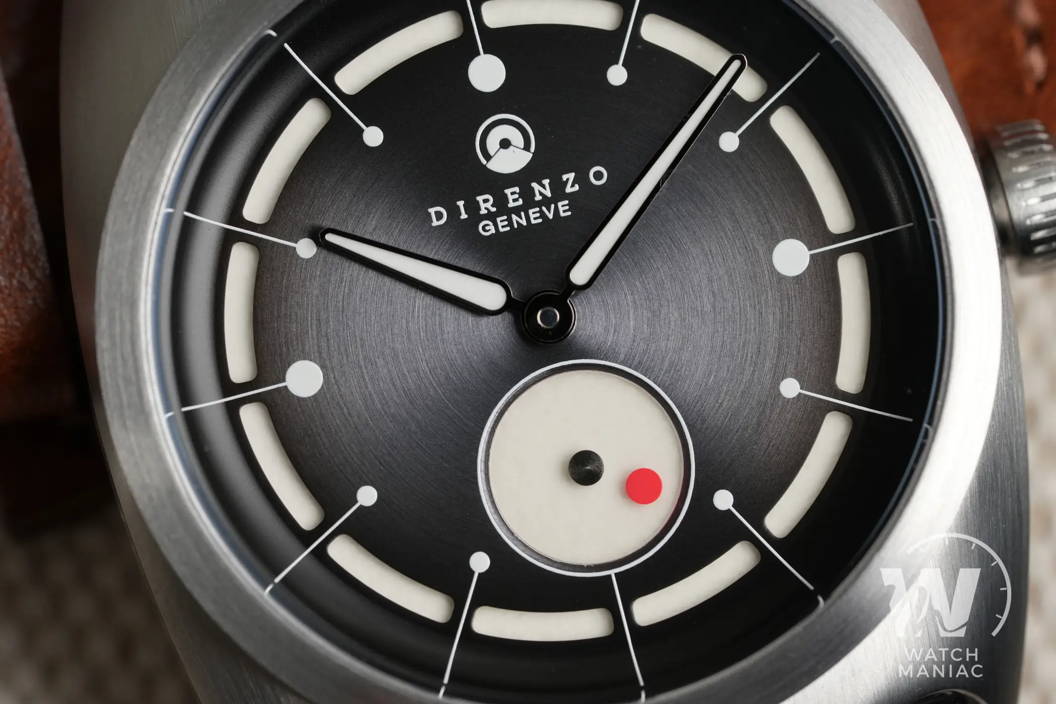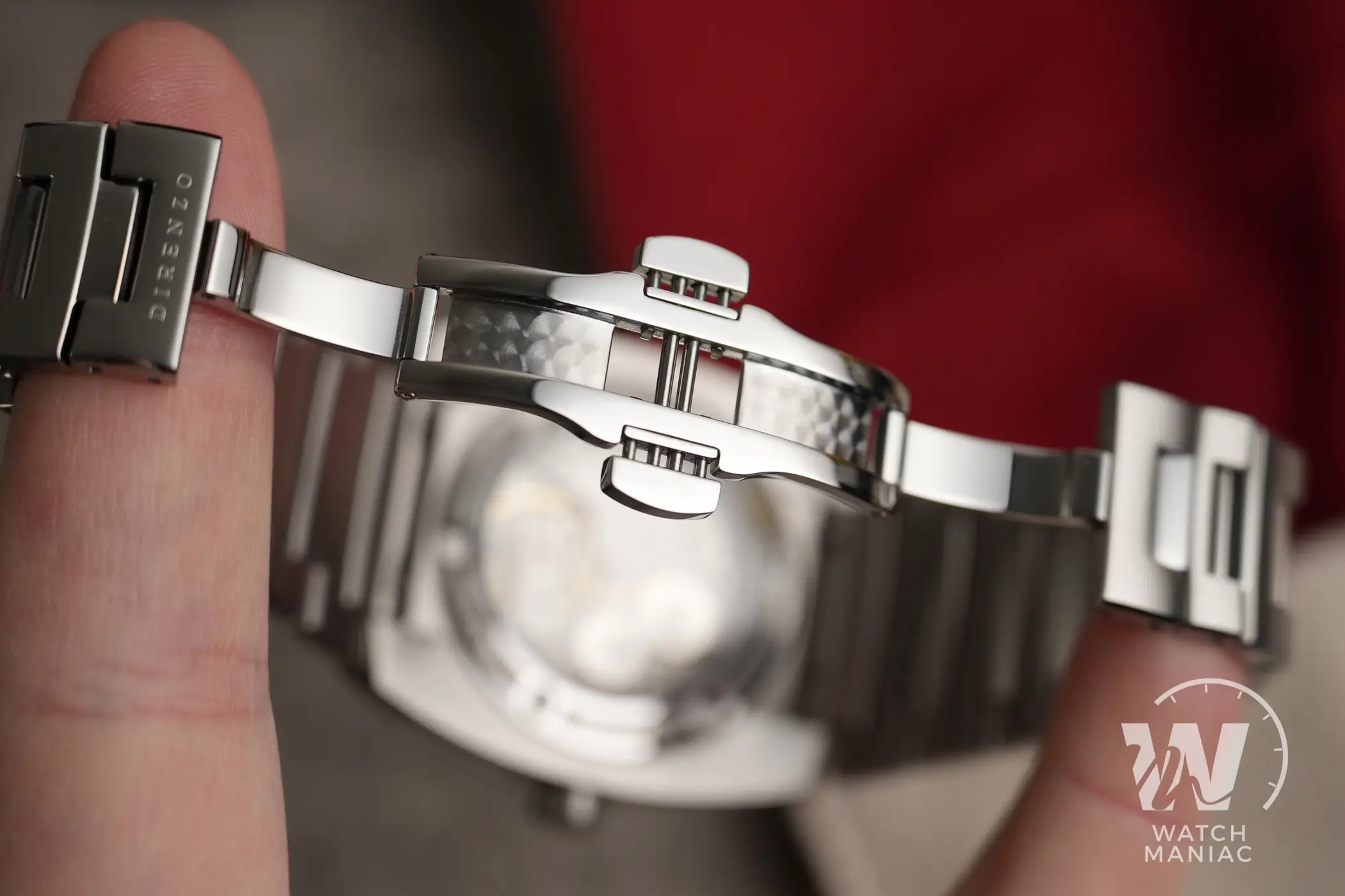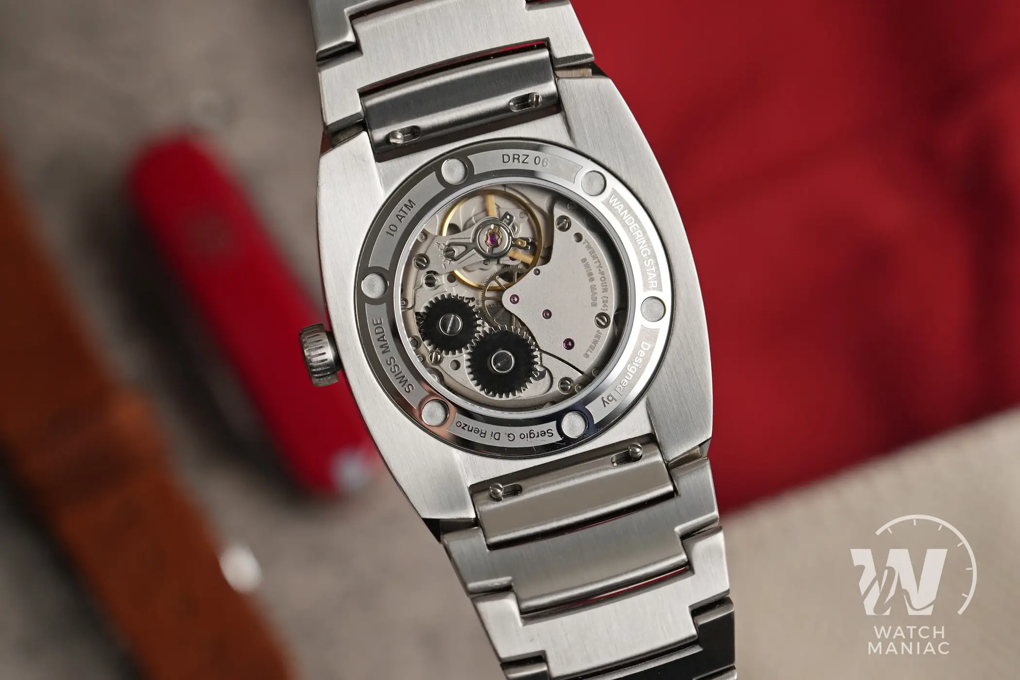 Bellissima la zona lievemente concava introno alle anse rifinita in modo impeccabile per andarsi a raccordare con i terminali del bracciale. Per preservare nel migliore dei modi le finiture, sulla cassa è applicato un rivestimento superficiale antigraffio che ha una durezza di 800 Vickers. La corona a ore 3 è solo a pressione, una scelta quasi obbligata legata alla meccanica all’interno, e non manca il punto rosso tipico di Direnzo. Intorno alla finestra di vetro del fondello sono riportate varie informazioni, tra cui il marchio Swiss made e il dato sull’impermeabilità fino a 10atm di pressione.