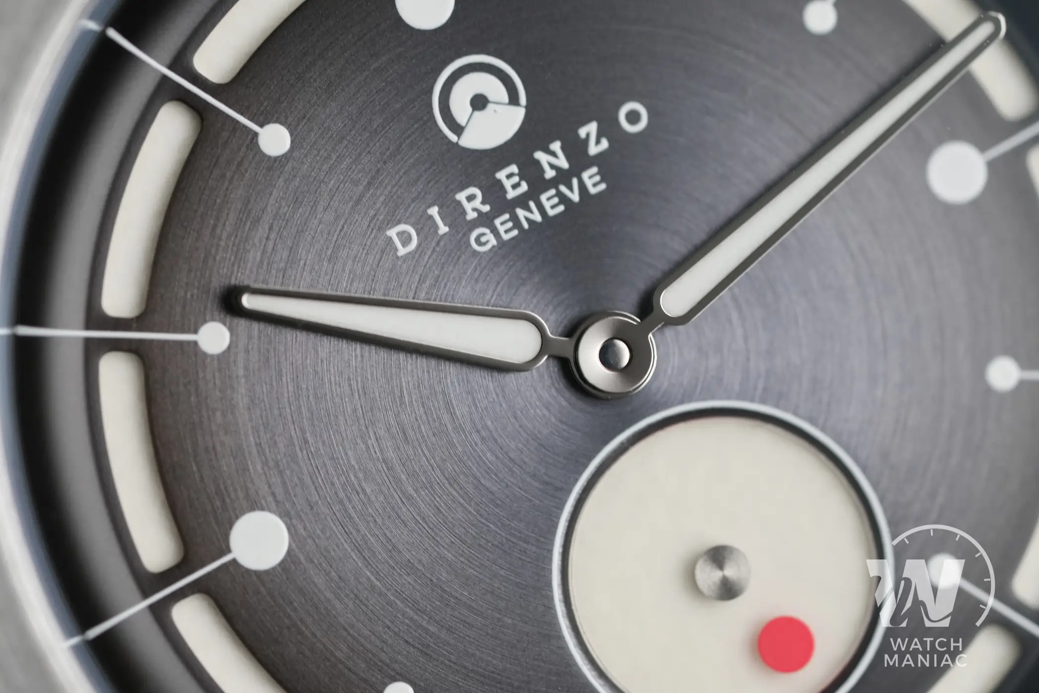 Ma i dettagli del quadrante non finiscono qui: la parte più esterna presenta delle sezioni a sandwich, con la Superluminova che affiora dal livello inferiore. La grafica mette in evidenza le ore ma mancano le tacche della minuteria. Sul DRZ 06 non manca poi uno dei tratti distintivi di Direnzo: il rehaut concavo che si unisce alla superficie interna del vetro. Le sfere hanno un design pulito, non del tutto riconducibile allo stile tipico del marchio, ma più che comprensibile all’interno di un quadrante già così elaborato e particolare. La finitura lucida è ben realizzata anche su questo prototipo e al centro i pinioni sono nascosti, scelta che denota un’attenzione certamente non comune in queste fasce di prezzo.