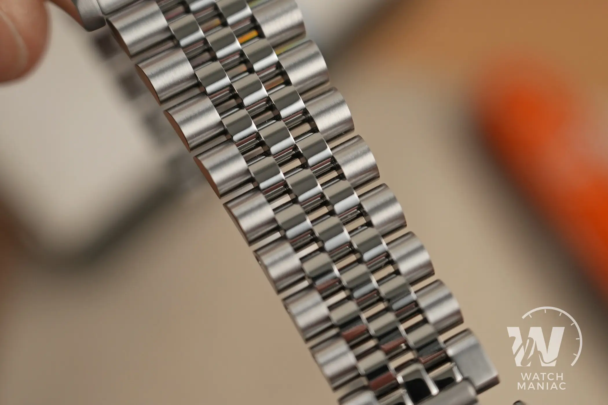 Il bracciale scelto per il DRZ 07 Universo è un jubilee, un design reso celebre da Rolex ha utilizzato da moltissimi altri marchi. Come sempre le maglie di questo tipo garantiscono grande flessibilità (e quindi comodità) al polso. La qualità è alta, sia per quanto riguarda le finiture che per i perni a vite che tengono ferme tra loro le maglie. Ciò che però distingue il bracciale di Direnzo da tutti altri è la presenza della clasp Nodex, realizzata dal microbrand americano Nodus. Questa, pur mantenendo dimensioni esterne piuttosto compatte, integra al suo interno un sistema di microregolazione rapida a 4 posizioni azionabile premendo l’apposito pulsante. Bella anche la scatoletta personalizzata e i tasti laterali di sgancio che non sporgono. Su tutto il bracciale c’è lo stesso trattamento antigraffio presente sulla cassa, con una durezza di 800Vickers.