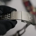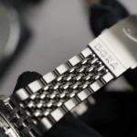 Il Doxa Army può essere scelto con il cinturino in gomma e chiusura deployante oppure con bracciale in acciaio a chicchi di riso. In questo caso lo vedete proprio in questa seconda configurazione: è sempre il solito ottimo chicchi di riso a cui ci ha abituati Doxa, solido e allo stesso tempo flessibile. Le maglie sono tenute insieme da perni a vite e la clasp, in acciaio pieno, integra un meccanismo di microregolazione rapida.