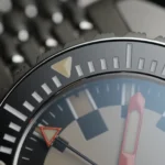 La ghiera del Doxa Army perde i tempi di decompressione, la funzione tipica per il marchio. Però, in questo modo, rimane più pulita e chiara per misurare il trascorrere del tempo e, precisamente, in questo caso ci sono i riferimenti numerici per il conto alla rovescia. L’inserto è in ceramica nera lucida con indici incisi nello spessore e smaltati oppure riempiti di superluminova, a seconda che si tratti di tacche o numeri. Rispetto alle classiche ghiere in acciaio di Doxa, con abbondanti parti lucide, si può contare sicuramente su una maggior resistenza ai graffi. Il meccanismo mi pare lo stesso, tra l’altro ottimo, utilizzato sul 300T, con 120 scatti precisi e senza giochi eccessivi tra uno e l’altro.