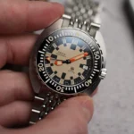 La cassa rimane molto simile a quella del 300T ed è una fortuna perché, se rapportata alle sue caratteristiche tecniche, può vantare una grandissima comodità al polso. Merito della tipica cassa a cuscino di Doxa, qui rifinita con satinatura circolare sulla parte superiore e lucidatura a specchio sui fianchi. Sul fianco sinistro si nota anche la valvola automatica per l’espulsione dell’elio. Lo spessore è complessivamente inferiore rispetto a quello del 300T, seppur di poco, e questa differenza è data soprattutto dal fondello che è meno sporgente.