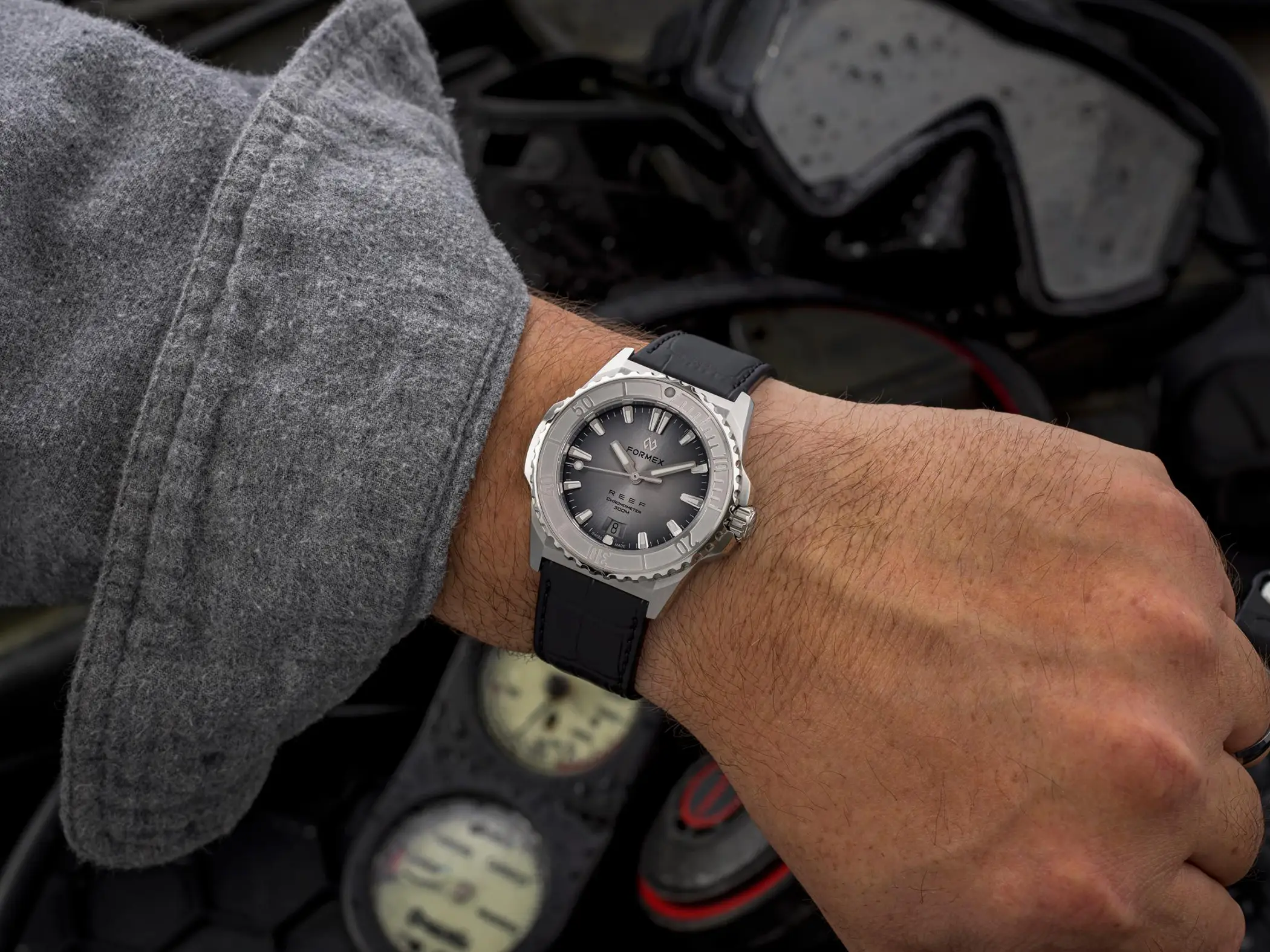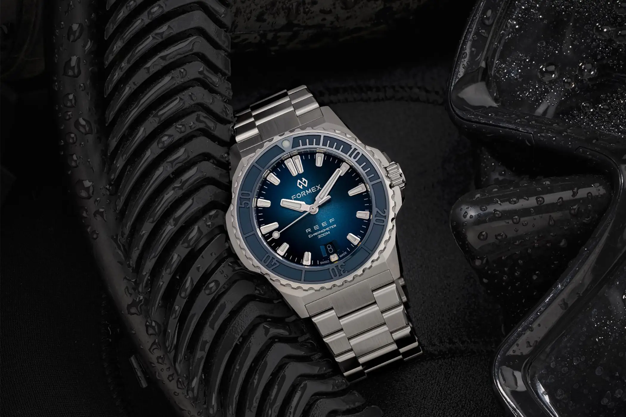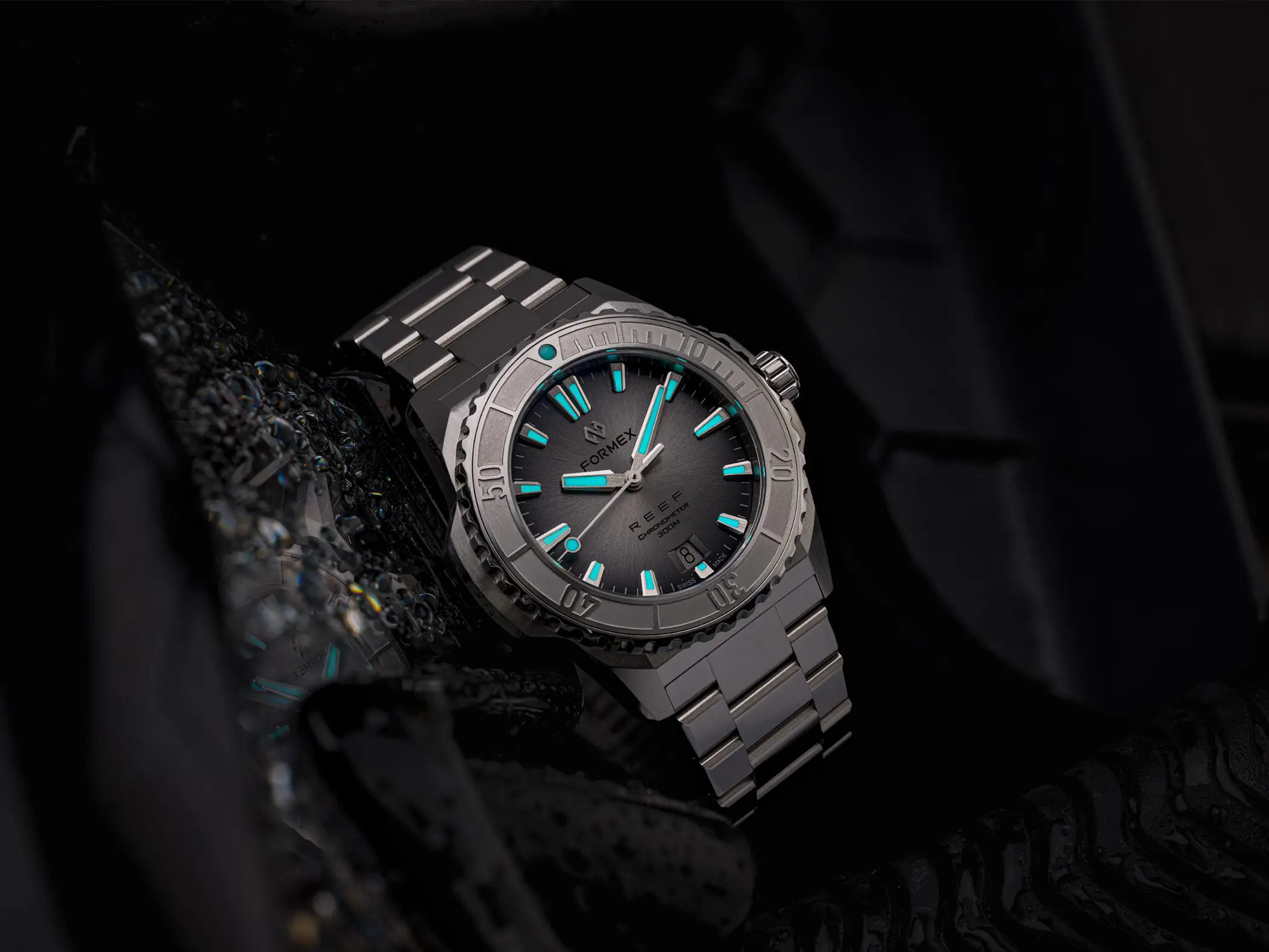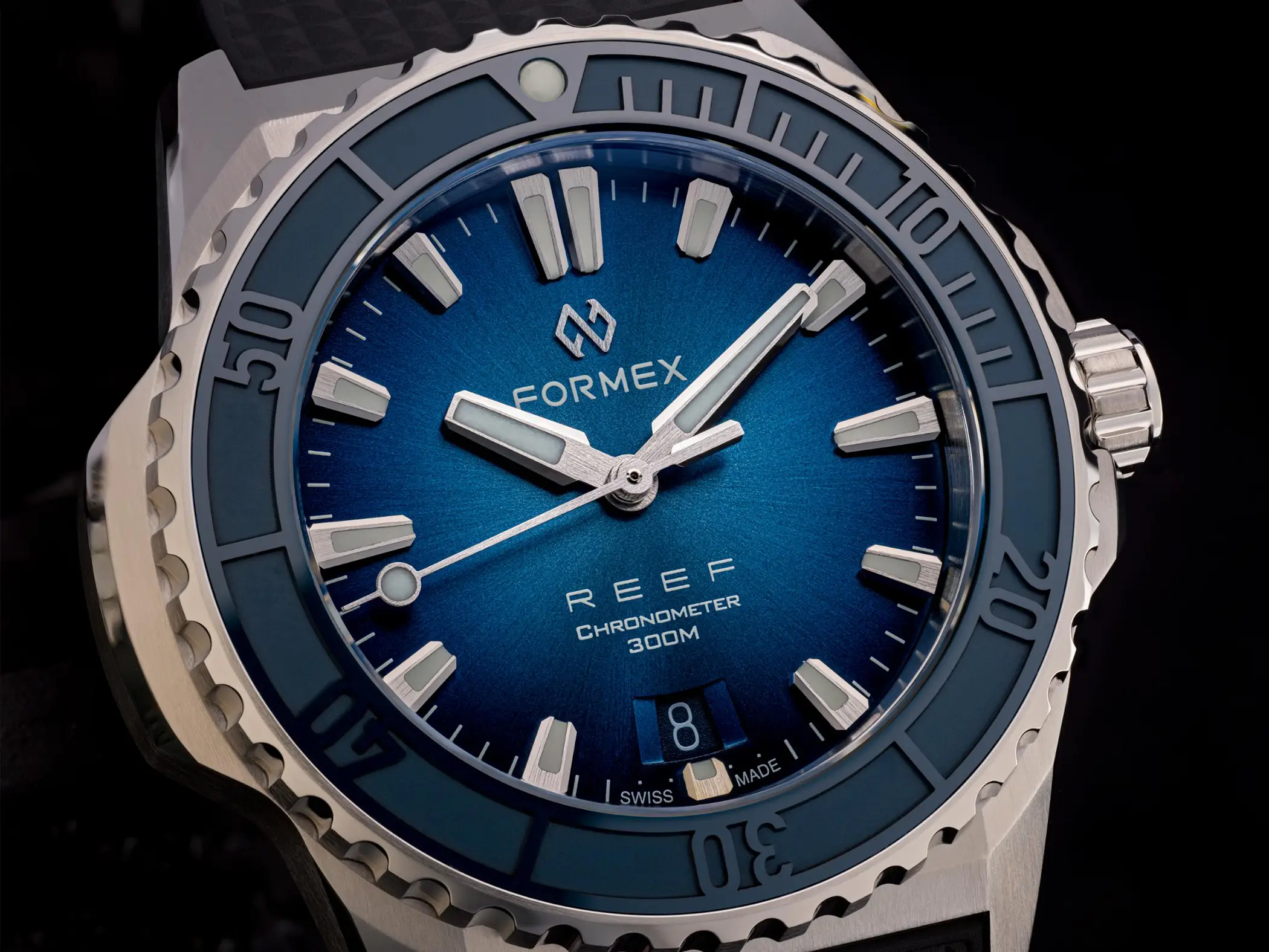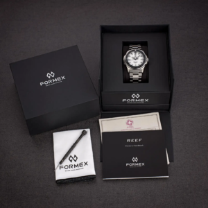 Il calibro che anima l’orologio è il Sellita SW 300-1 con riserva di carica aumentata a 56 ore. È un movimento Swiss made, qui con datario a ore sei, che Formex ha scelto per la sua affidabilità e anche per il suo spessore limitato. Le prestazioni sono ottimali anche dal punto di vista cronometrico, dato che il Reef 39,5mm è accompagnato dal certificato COSC che attesta una precisione da -4 a +6 secondi al giorno. Esattamente come per il fratello maggiore, l’impermeabilità è garantita fino a 300m. La Superluminova BGW9, con la sua classica luminescenza in colorazione blu, è applicata in generose quantità su indici, sfere e riferimento a ore 12 della ghiera.