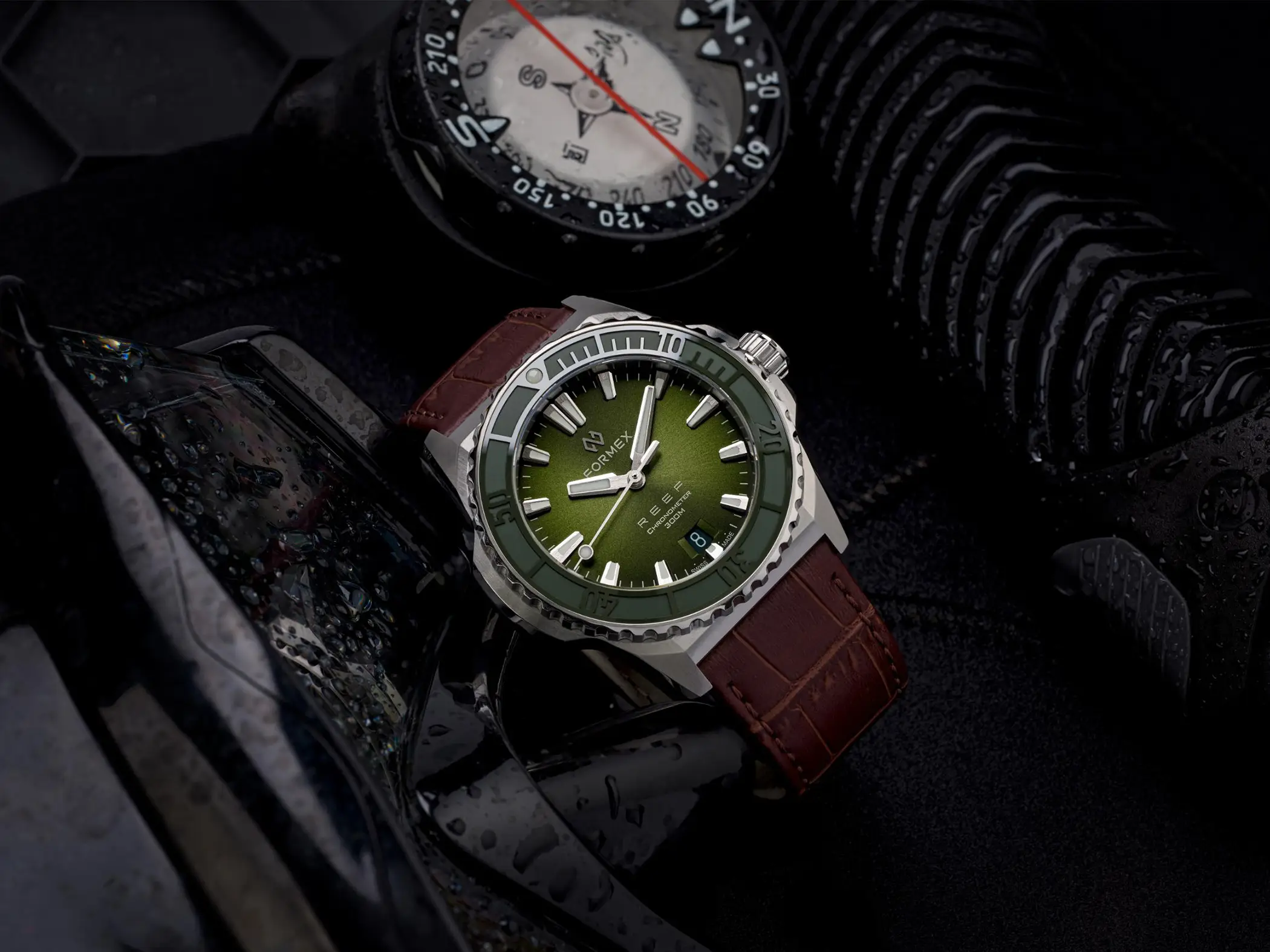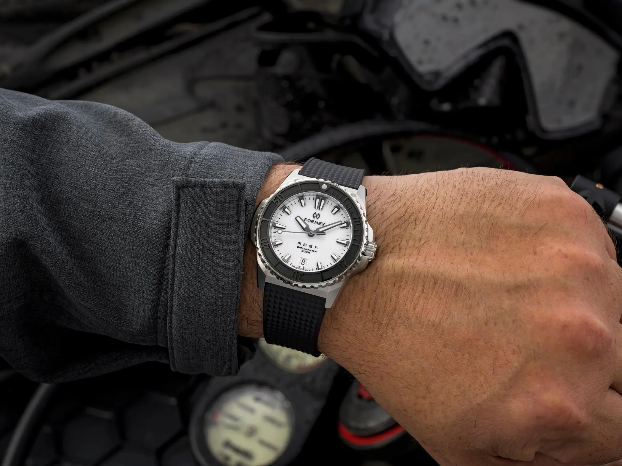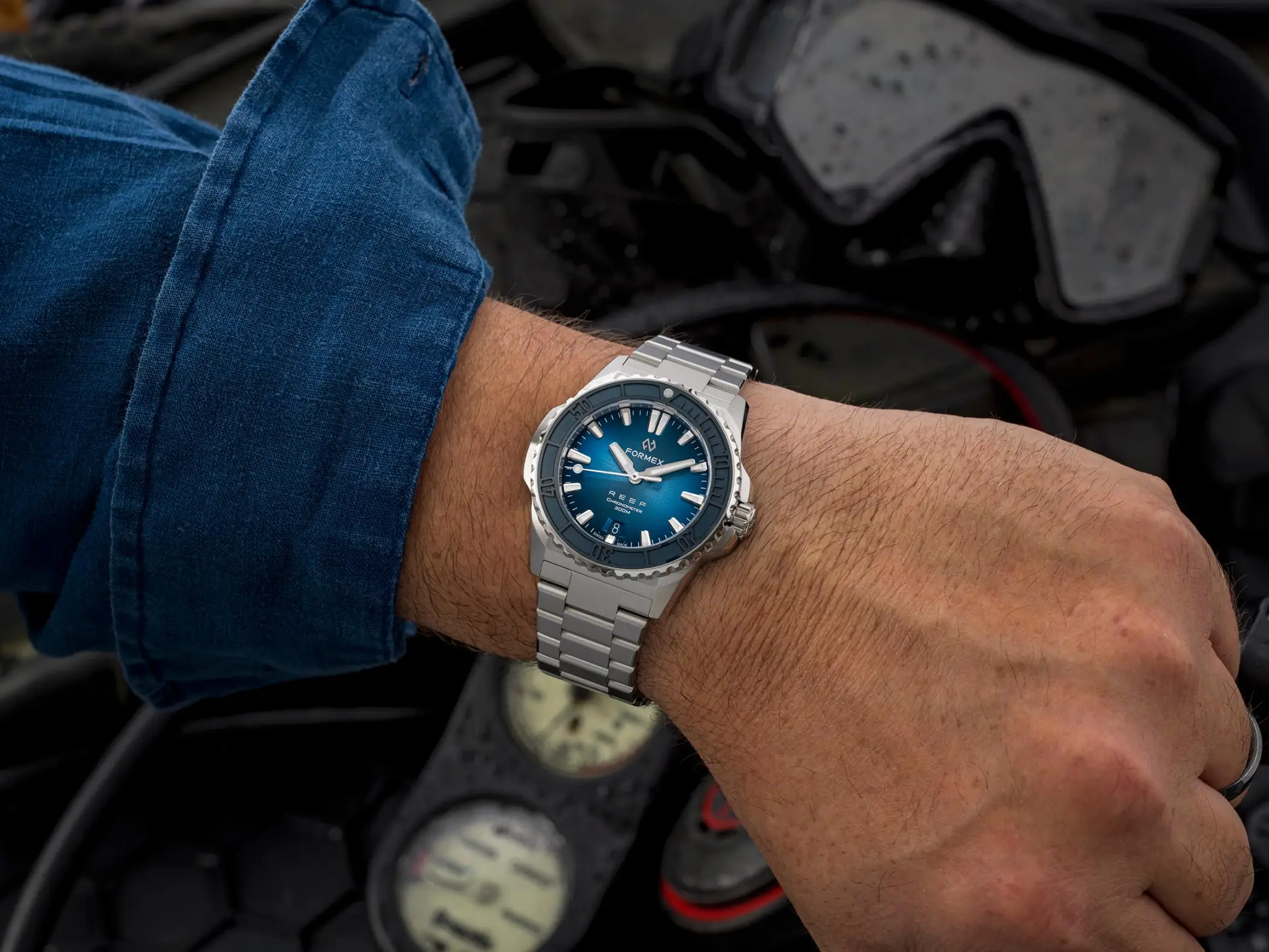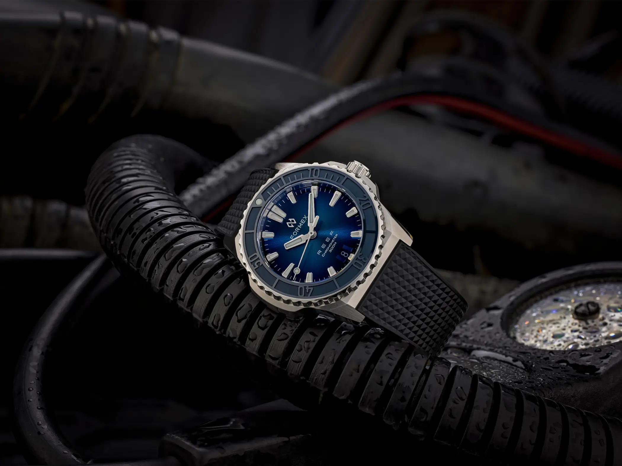Il calibro che anima l’orologio è il Sellita SW 300-1 con riserva di carica aumentata a 56 ore. È un movimento Swiss made, qui con datario a ore sei, che Formex ha scelto per la sua affidabilità e anche per il suo spessore limitato. Le prestazioni sono ottimali anche dal punto di vista cronometrico, dato che il Reef 39,5mm è accompagnato dal certificato COSC che attesta una precisione da -4 a +6 secondi al giorno. Esattamente come per il fratello maggiore, l’impermeabilità è garantita fino a 300m. La Superluminova BGW9, con la sua classica luminescenza in colorazione blu, è applicata in generose quantità su indici, sfere e riferimento a ore 12 della ghiera.