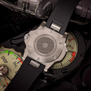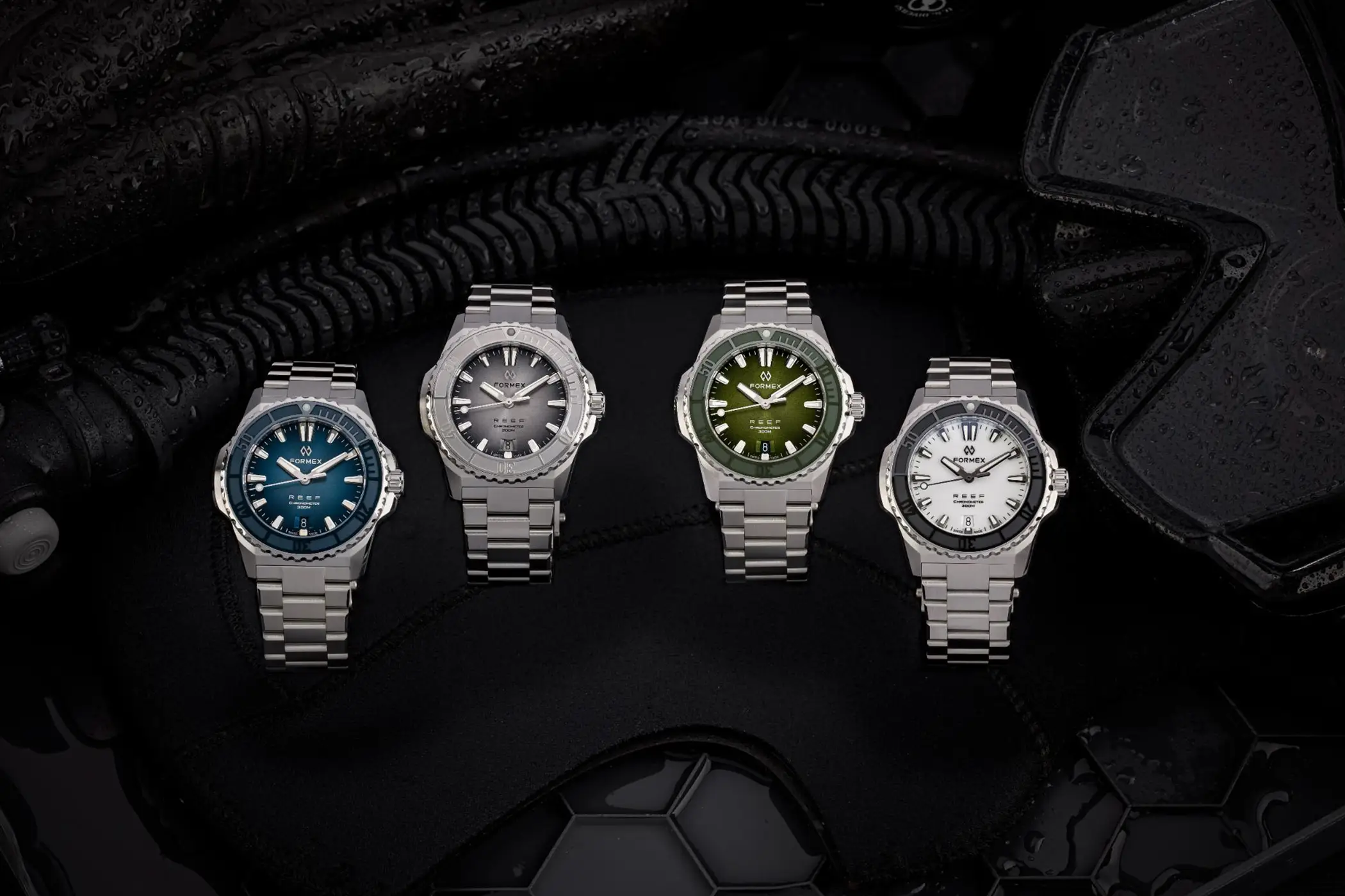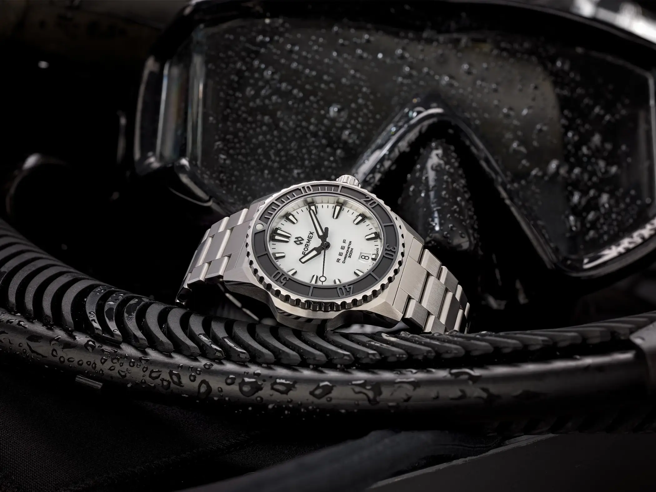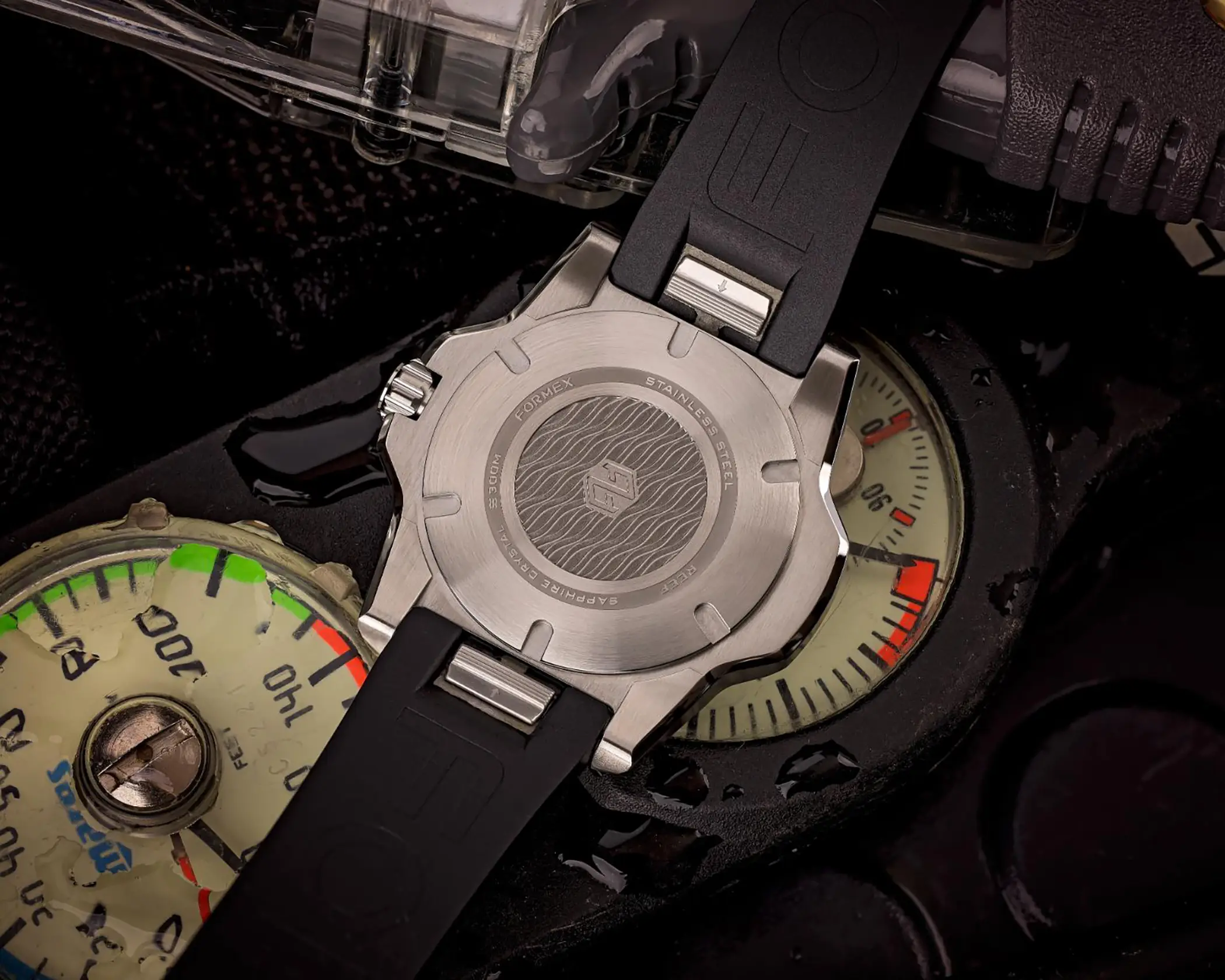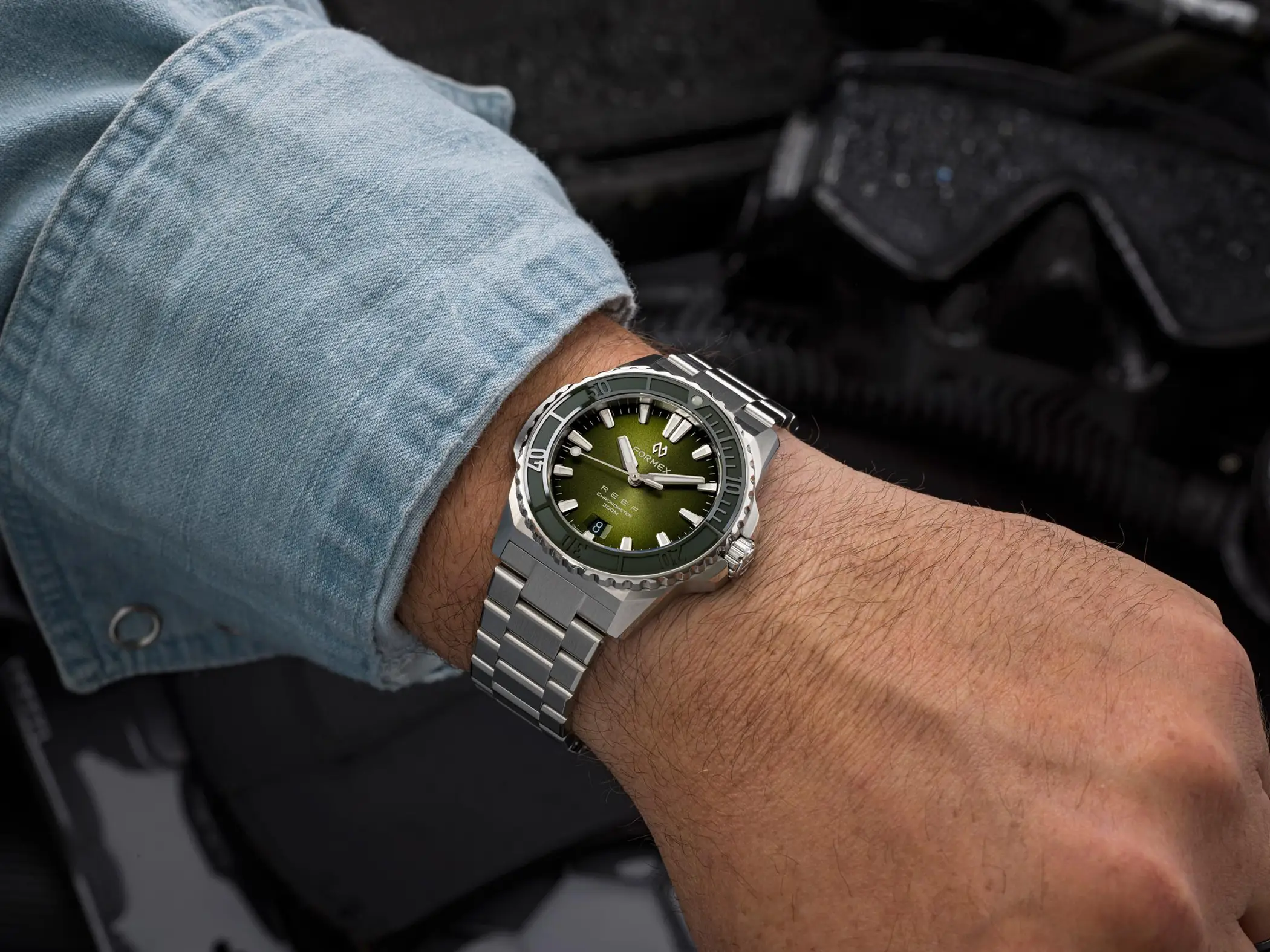 Il calibro che anima l’orologio è il Sellita SW 300-1 con riserva di carica aumentata a 56 ore. È un movimento Swiss made, qui con datario a ore sei, che Formex ha scelto per la sua affidabilità e anche per il suo spessore limitato. Le prestazioni sono ottimali anche dal punto di vista cronometrico, dato che il Reef 39,5mm è accompagnato dal certificato COSC che attesta una precisione da -4 a +6 secondi al giorno. Esattamente come per il fratello maggiore, l’impermeabilità è garantita fino a 300m. La Superluminova BGW9, con la sua classica luminescenza in colorazione blu, è applicata in generose quantità su indici, sfere e riferimento a ore 12 della ghiera.