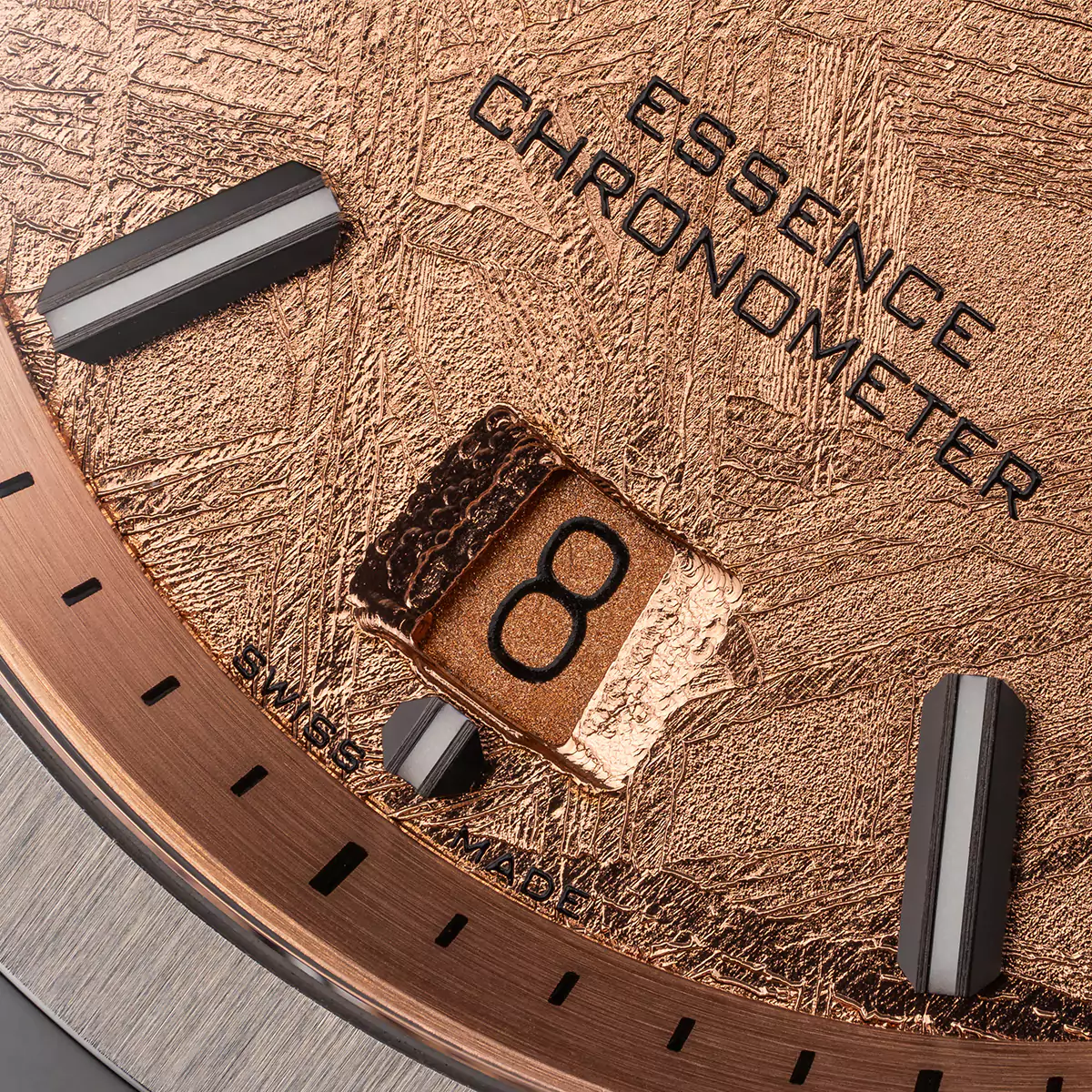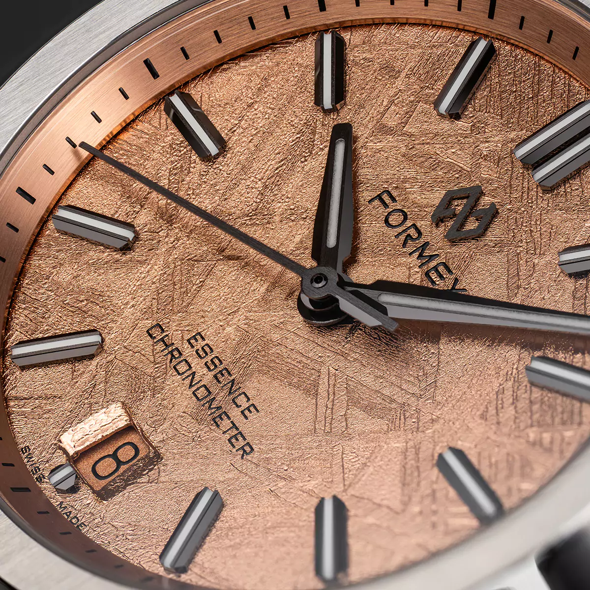 L’Essence 39 è un modello particolarmente fortunato e infatti, dalla sua uscita in poi, è stato declinato in diverse varianti di quadrante, compresa l’edizione limitata realizzata in eisenkiesel. Mettendo a frutta la sua inesauribile voglia di sperimentare per mettere a punto soluzioni tecniche ed estetiche innovative, Formex propone per la prima volta un quadrante in meteorite con un rivestimento superficiale in oro rosa 18 carati. Ed è così che nasce il nuovo Essence 39 Space Gold.