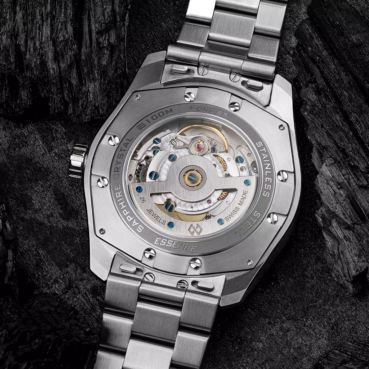 Restano invariate tutte le caratteristiche che hanno decretato il successo del Formex Essence 39, a partire dal sistema brevettato di sospensione della cassa (Case Suspesion System). Questa è infatti montata su delle molle per alleviare la pressione intorno al polso durante il normale utilizzo quotidiano. Confermate poi le ottime finiture, con la tipica satinatura verticale sulla parte superiore della lunetta che contrasta con il bisello lucido rifinito a mano. Rimane invariata anche la scelta del movimento, un Sellita SW200 con certificazione COSC, preciso e affidabile e con 41 ore di riserva di carica.