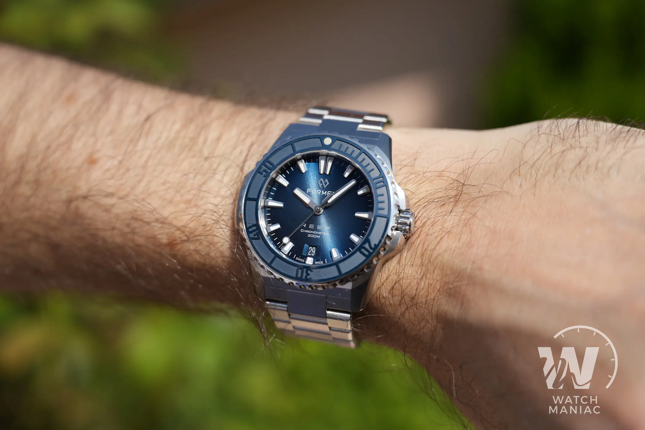 Nella parte alta ci sono il logo applicato e il marchio stampato, mentre in basso troviamo il nome del modello, la scritta Chronometer e il dato sull’impermeabilità fino a 300m, che resta invariata rispetto ai modelli da 42mm. Resta invariata anche la scelta di posizionare la data a ore 6 con uno dei tratti distintivi di Formex, la finestra con doppia svasatura ai lati.