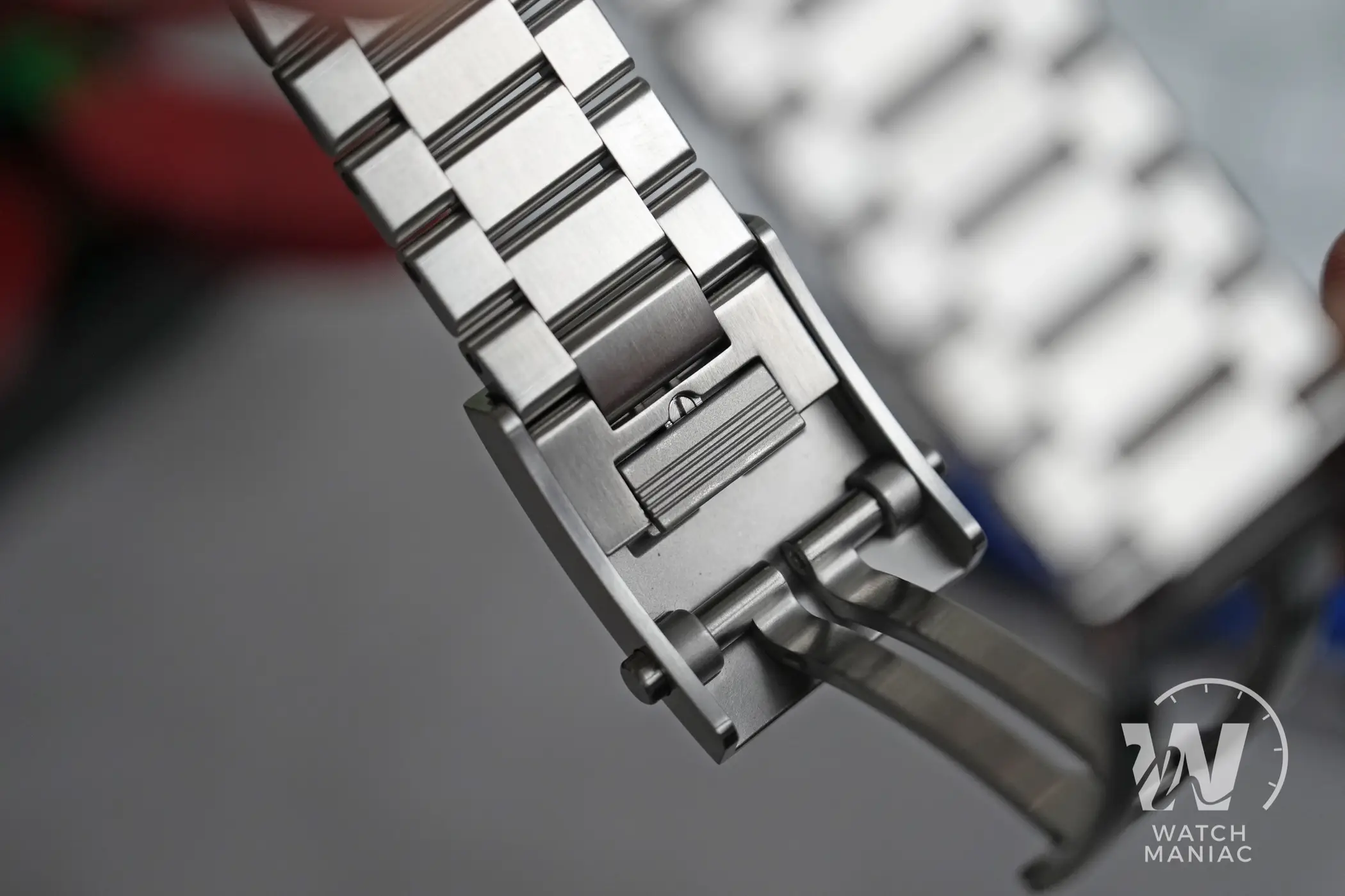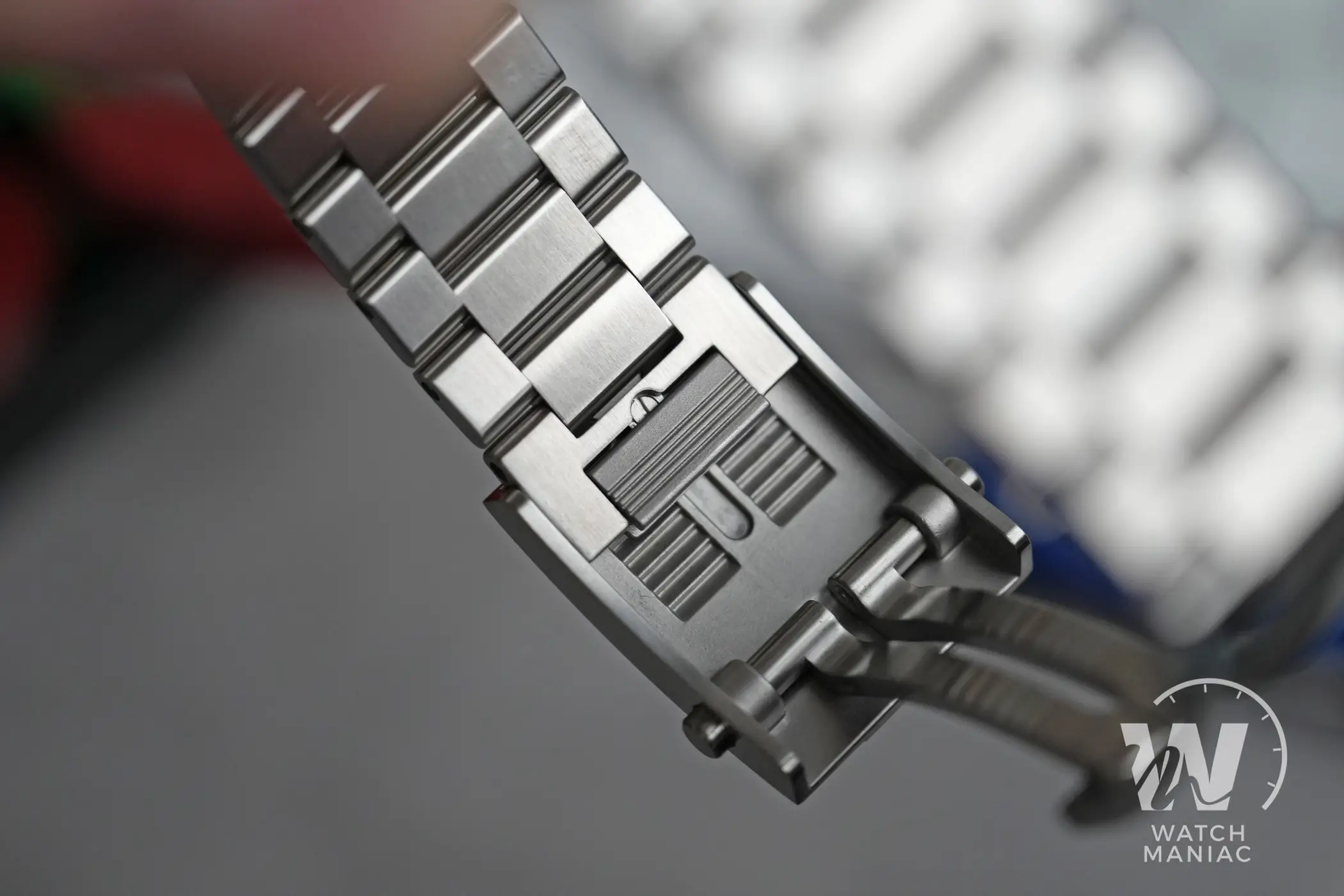 La clasp, corta e larga, è abbastanza insolita dal punto di vista estetico, perciò potrebbe non piacere a tutti, ma al suo interno nasconde un sistema di microregolazione rapida molto efficace e pratica che in tutto ha ben 7 posizioni per trovare la misura perfetta per il proprio polso, riuscendo ad assecondare perfettamente anche le variazioni nell’arco della giornata.