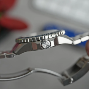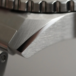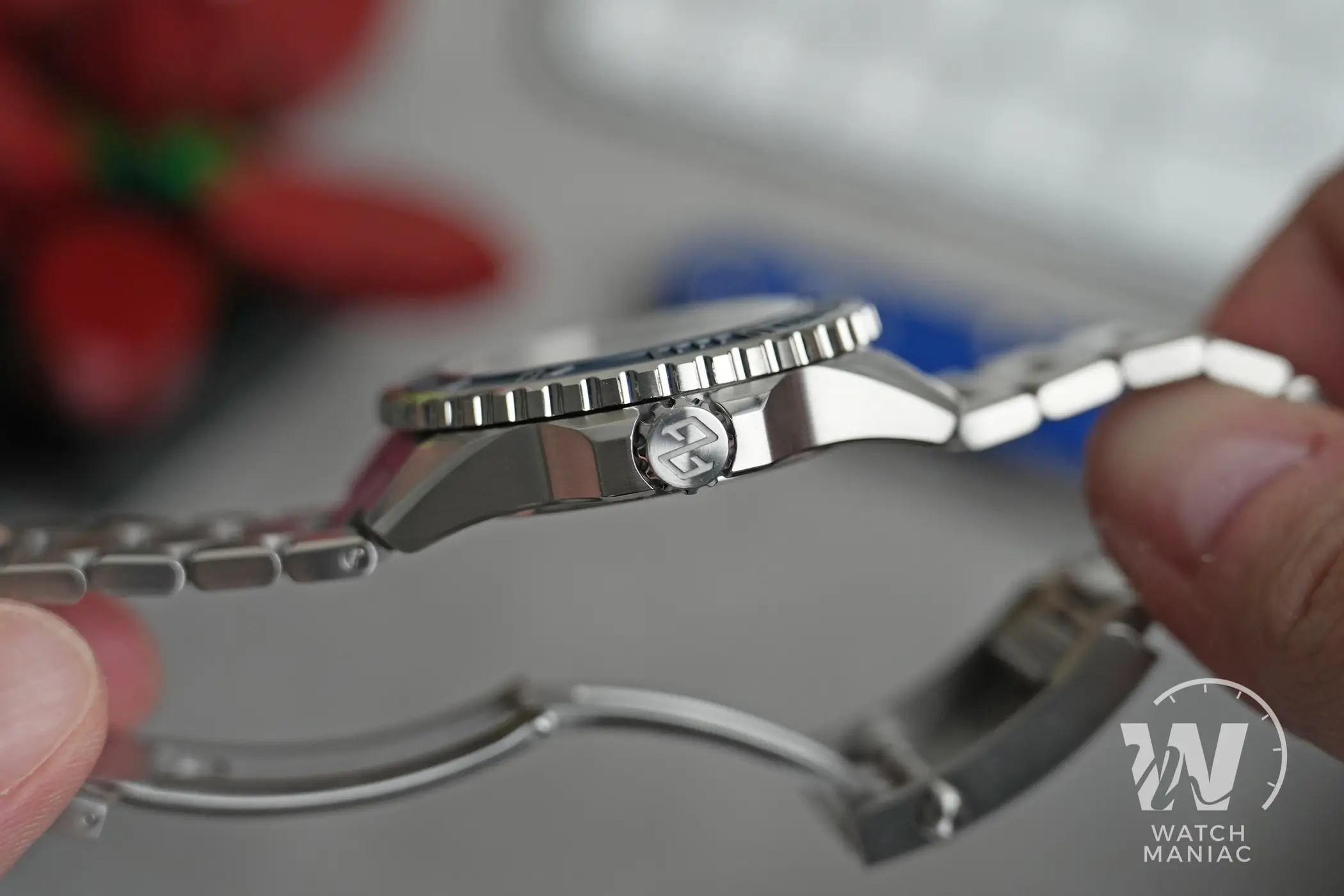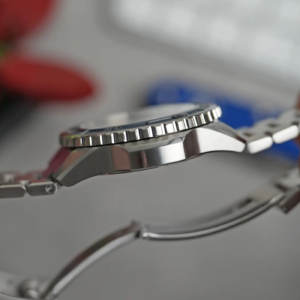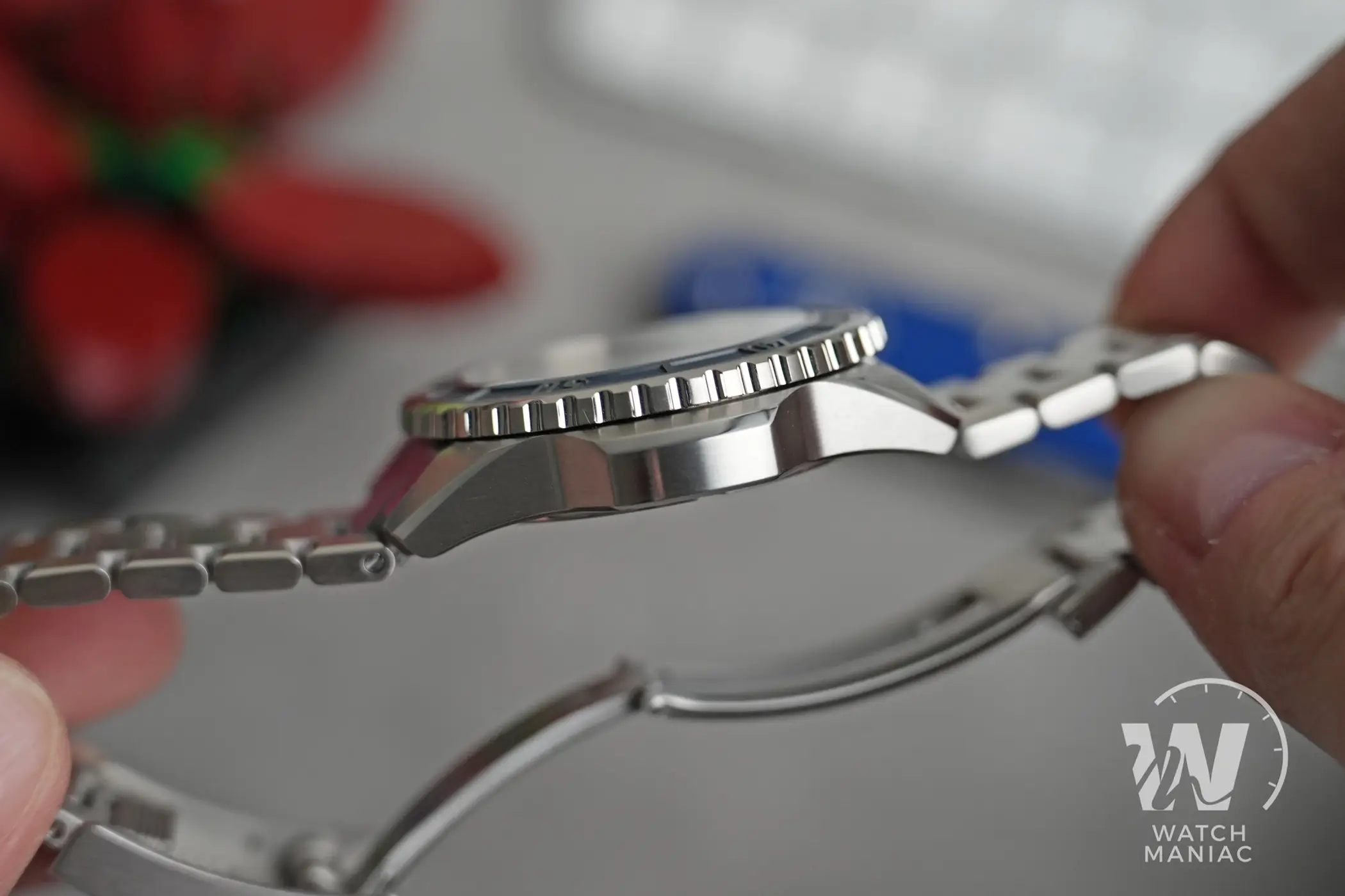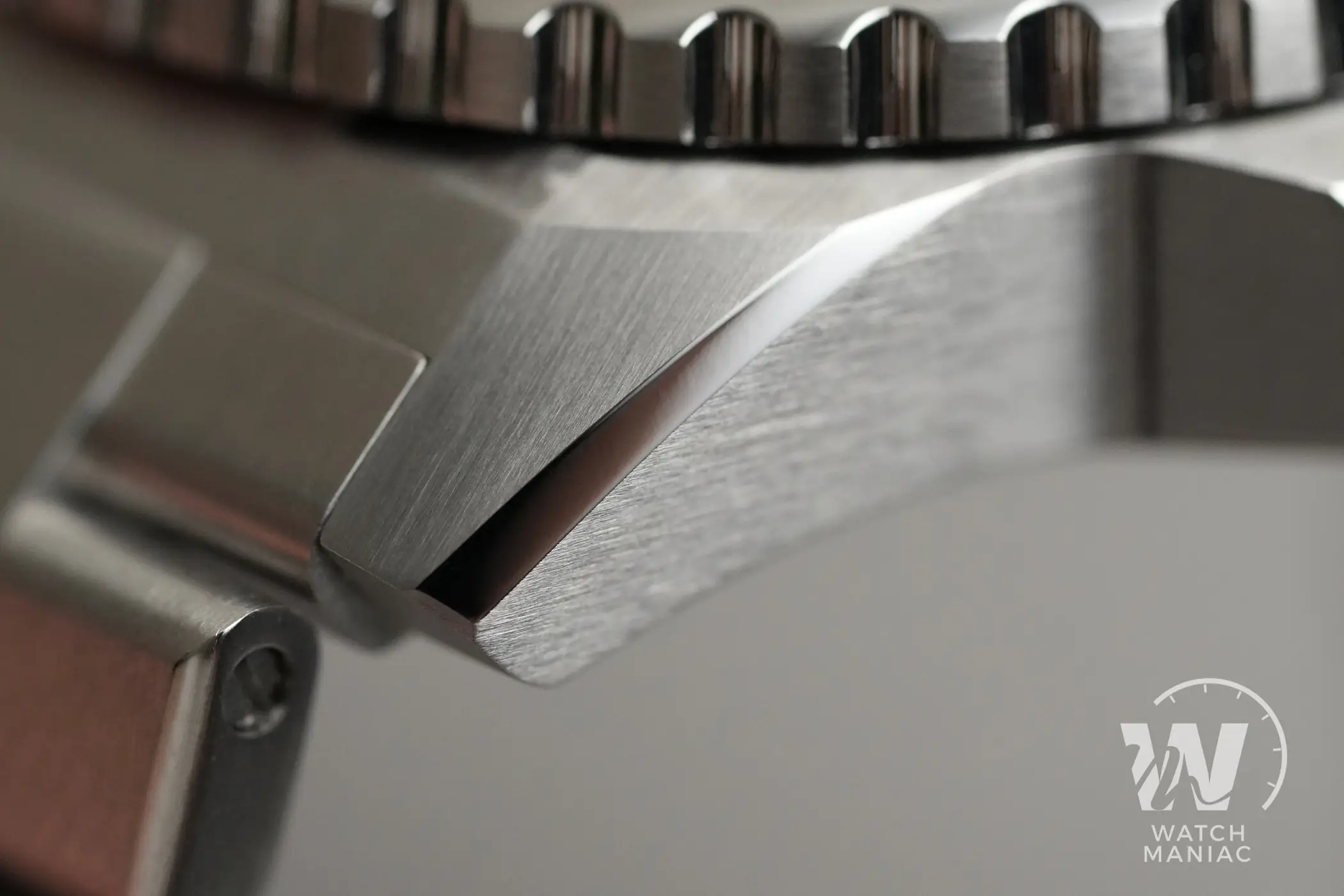 La cassa riprende il design delle versioni più grandi da 42mm adattato al diametro inferiore. Il primo dettaglio stilistico che balza all’occhio è rappresentato dalle due sporgenze simmetriche ai lati, a ore 3 e a ore 9. Anche la forma delle anse è molto caratteristica, sono corte e hanno un andamento spiovente. Le finiture sono eccezionali, con spigoli definiti, stacchi netti tra parti lucide e satinate e vistosi biselli lucidi sulla parte superiore e inferiore della carrure. Dalla vista laterale è possibile apprezzare uno spessore molto contenuto per un orologio in grado di resistere fino a 300m di profondità. La corona a ore 3 ha una bella finitura satinata con logo inciso, è a vite e ha una filettatura molto precisa sia in apertura che in serraggio.
