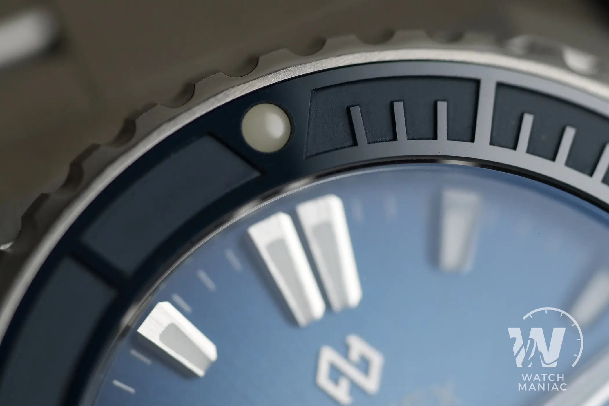 Questa è la stessa finitura che ritroviamo anche sulle sfere, molto curate, che assicurano una perfetta leggibilità in ogni condizione. Anche al buio le prestazioni sono ottime, con il tipico bagliore tendente al blu della Superluminova BGW9 su sfere, indici e riferimento a ore 12 sulla ghiera. La luminescenza resta ben visibile anche a distanza di parecchio tempo dall’esposizione ad una fonte di luce.