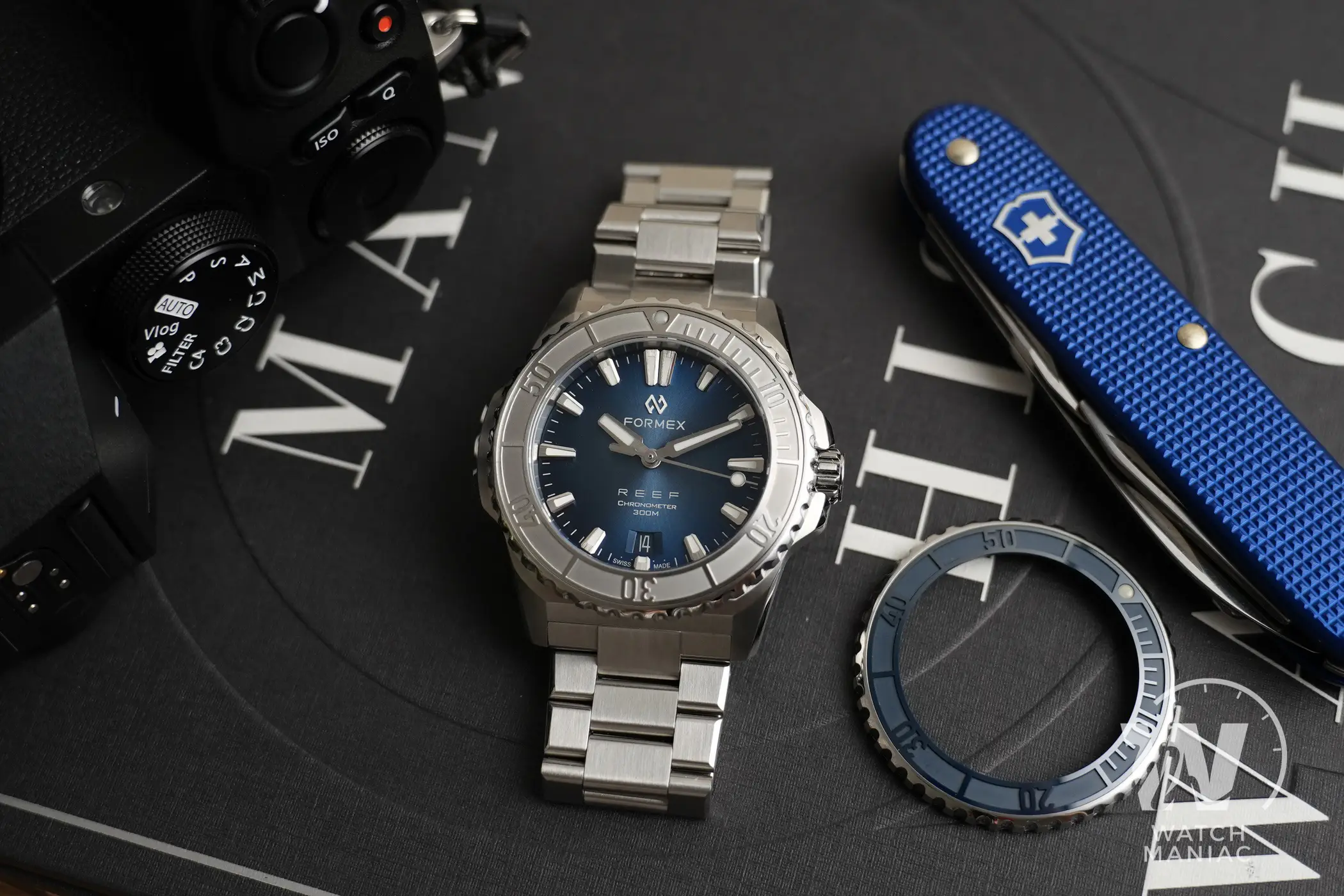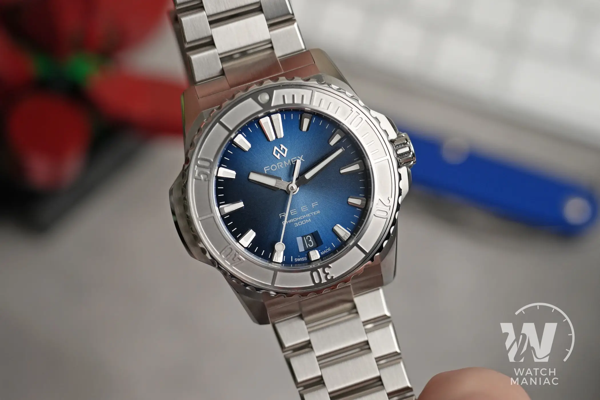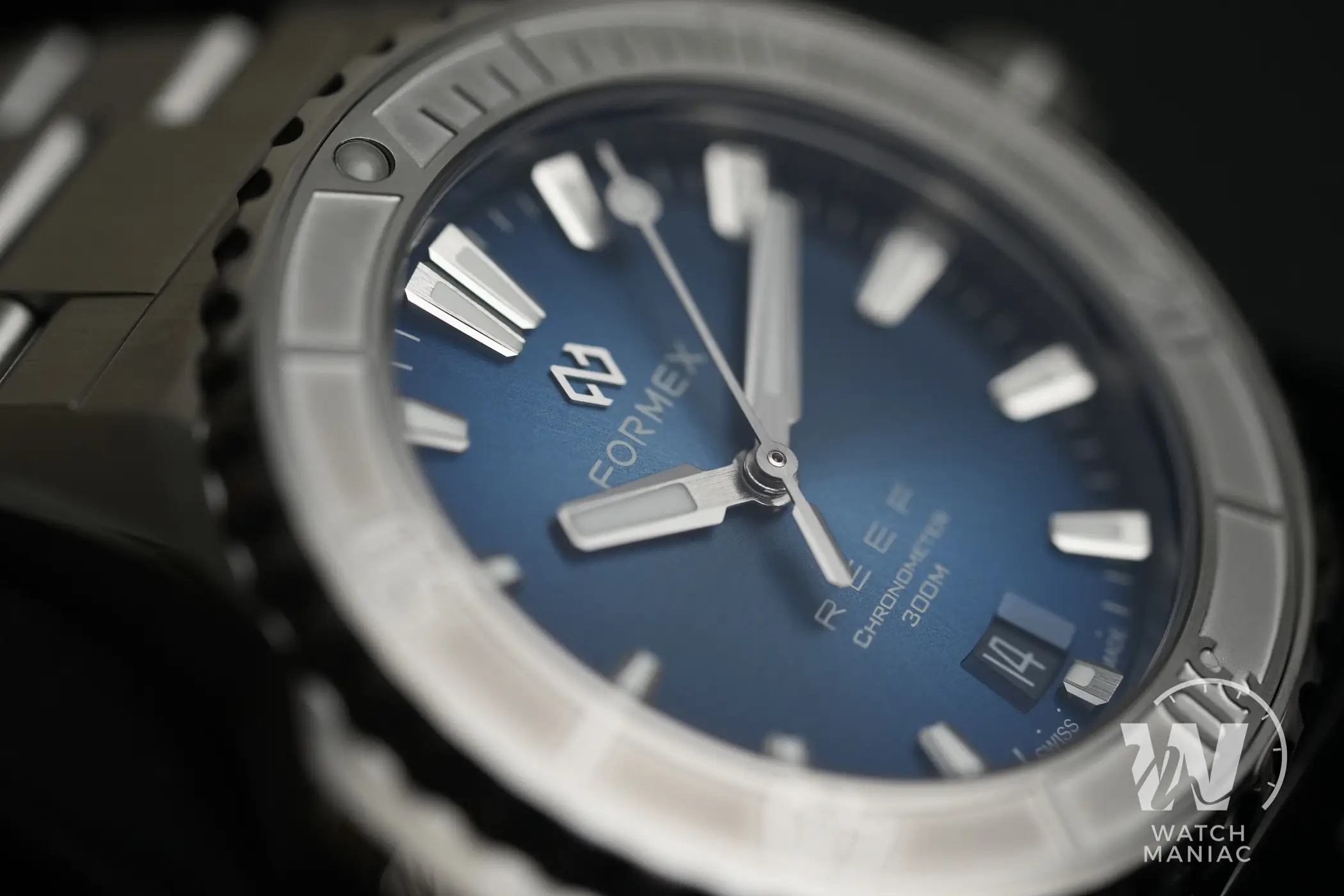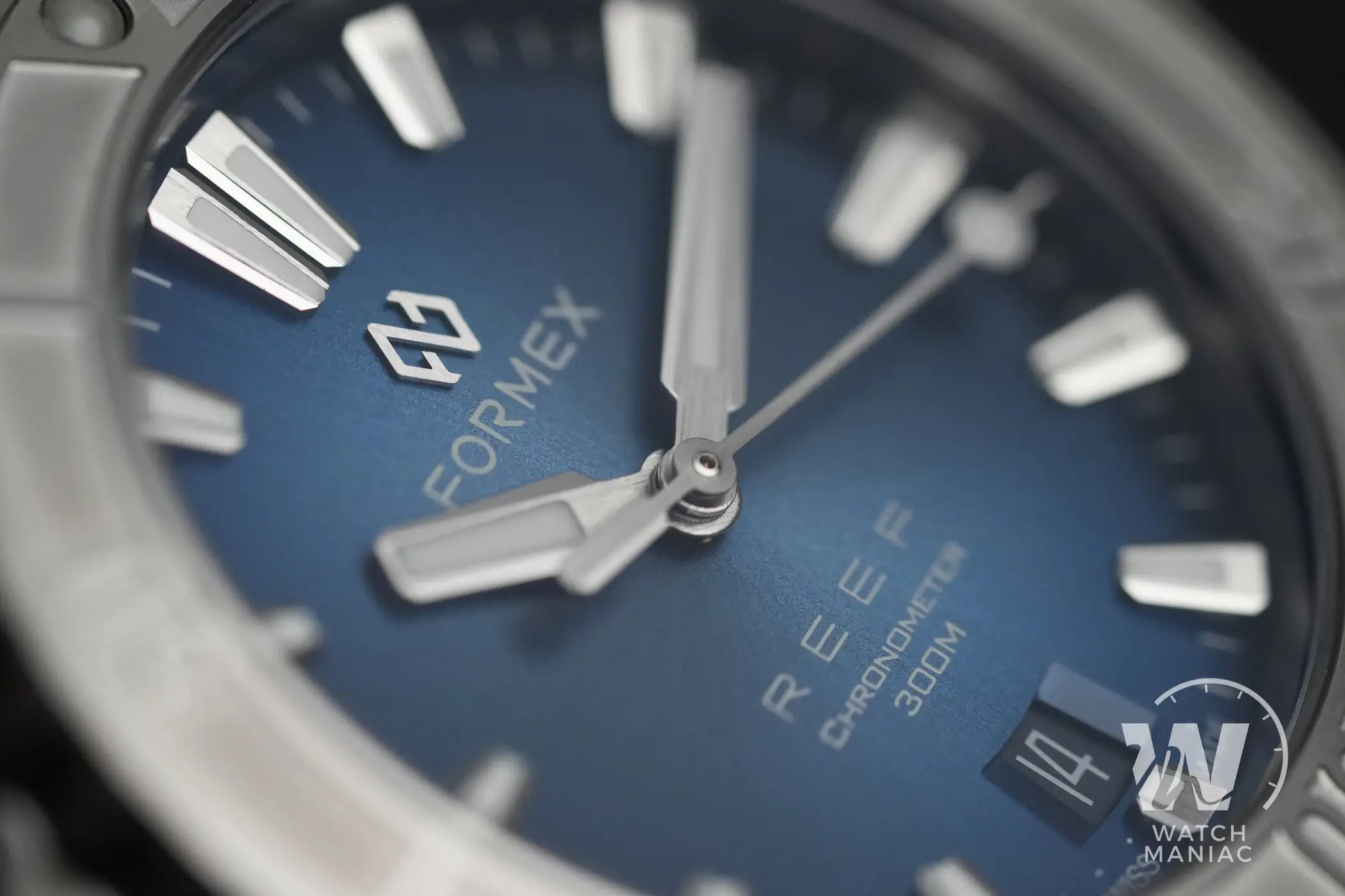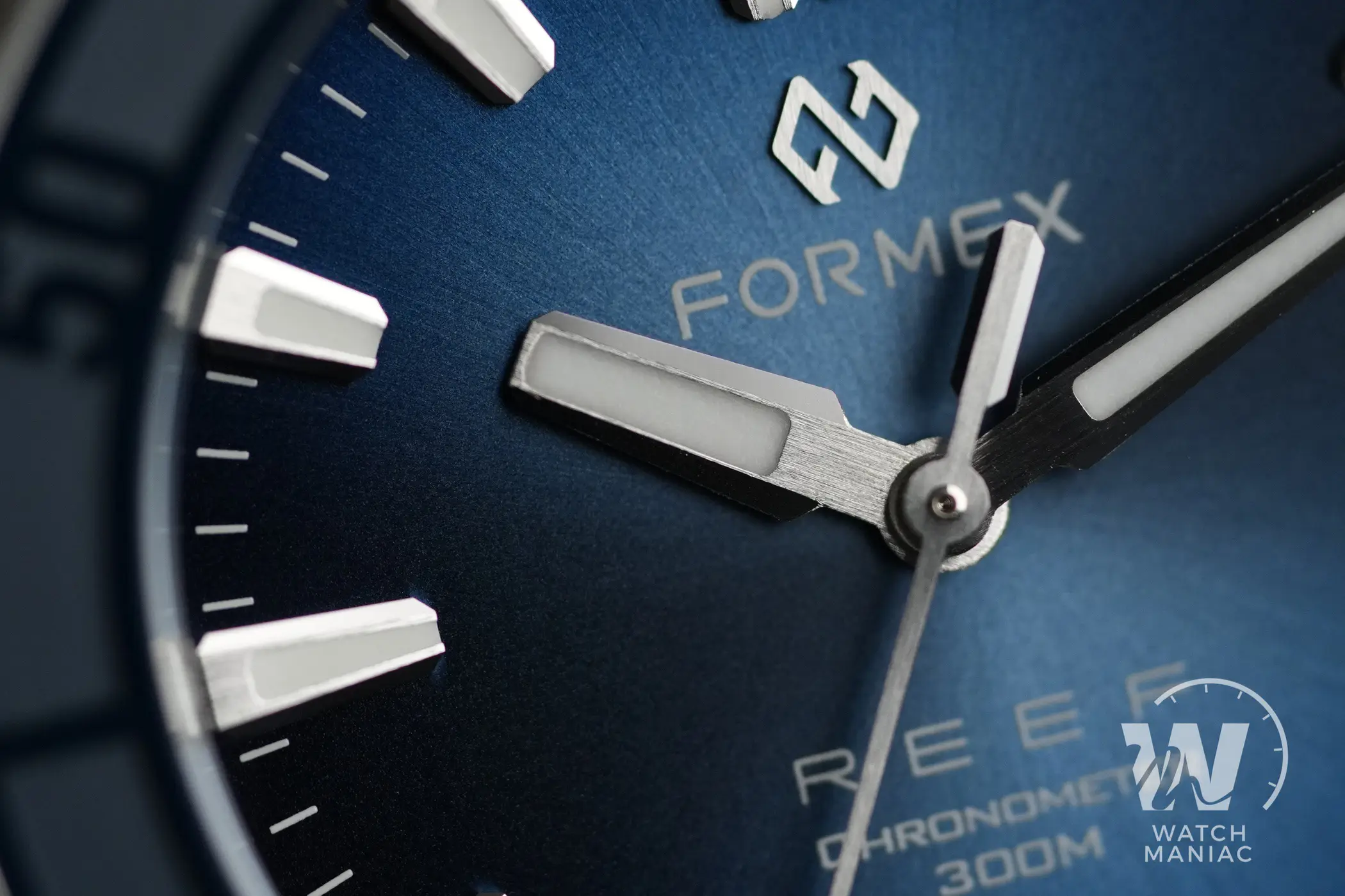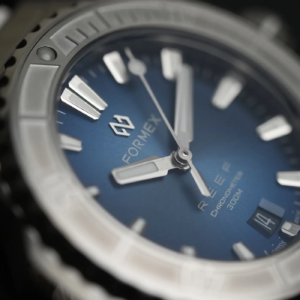 Formex per il REEF ha scelto un movimento di livello superiore rispetto a quel che si trova solitamente in questa fascia di prezzo. Il Sellita SW300 ha una frequenza di 28.800a/h e può vantare una riserva di carica di 56 ore, con fermo macchina e possibilità di ricarica manuale. La ciliegina sulla torta è rappresentata dal grado COSC, che garantisce le buone doti di precisione di quest’orologio.
