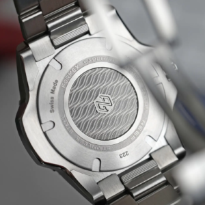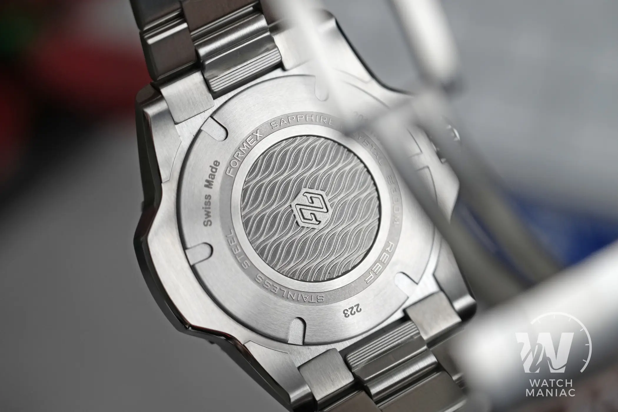 Il fondello è in acciaio e il medaglione centrale è decorato con un motivo a onde e il logo di Formex. Questa è una soluzione analoga a quella adottata anche sul REEF da 42mm, ma diversa rispetto al REEF GMT, dove invece è possibile osservare il movimento attraverso la finestra in zaffiro.