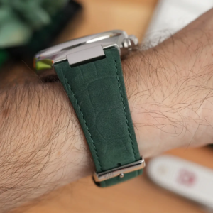 In tutta la recensione avete visto montato questo cinturino in pelle verde con stampa alligatore e finitura nabuk, molto gradevole al tatto e perfettamente adatto al design dell’orologio, con fibbia ad ardiglione personalizzata. Il corredo prevede di serie anche il suo bracciale in acciaio e un secondo cinturino in gomma simile. Il passaggio da un accessorio all’altro è reso semplicissimo dalle anse a sgancio rapido.