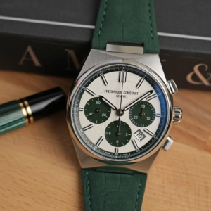 Il vetro è uno zaffiro con lieve curvatura esterna e trattamento antiriflesso. Questo è molto efficace nel tenere a bada i riflessi più fastidiosi e anche ad angolazioni estreme la visibilità rimane ottimale. La cassa è sostanzialmente la stessa utilizzata nelle altre declinazioni dell’Highlife e questo non può che essere un bene. Il design è un perfetto mix di sportività ed eleganza. La finiture sono molto curate, con satinature regolari sulla parte superiore della carrure e lucidatura a specchio su tutti gli altri dettagli, inclusa la lunetta bombata intorno al vetro. Dalla vista laterale si nota uno spessore complessivo non esagerato se si tiene conto che abbiamo a che fare con un cronografo automatico e comunque, nell’insieme, la cassa è ben proporzionata. I pulsanti cronografici hanno una bella forma squadranta ad angoli arrotondati e sono lucidi così come i fianchi. La corona a pressione presenta il logo di Frederique Constant in rilievo.