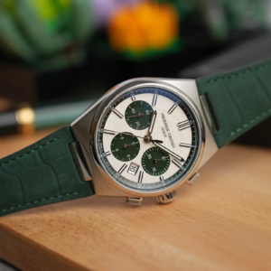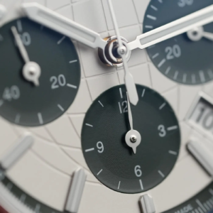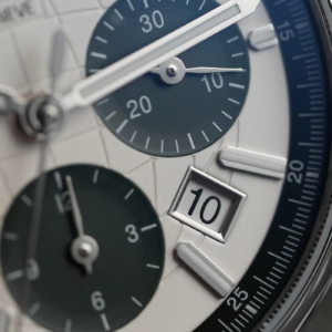 Il quadrante segue lo stesso filo conduttore di tutta la collezione Highlife, con la raffigurazione stilizzata del globo data dal reticolo di paralleli e meridiani. Se si fa eccezione per il marchio nella parte alta non ci sono altre scritte. In questa nuova versione in edizione limitata il colore chiaro è abbinato al verde scuro dei contatori, che presentano una classica lavorazione a solchi concentrici. A ore 9 ci sono i secondi continui, a ore 3 i minuti cronografici e a ore 6 il totalizzatore delle ore.
